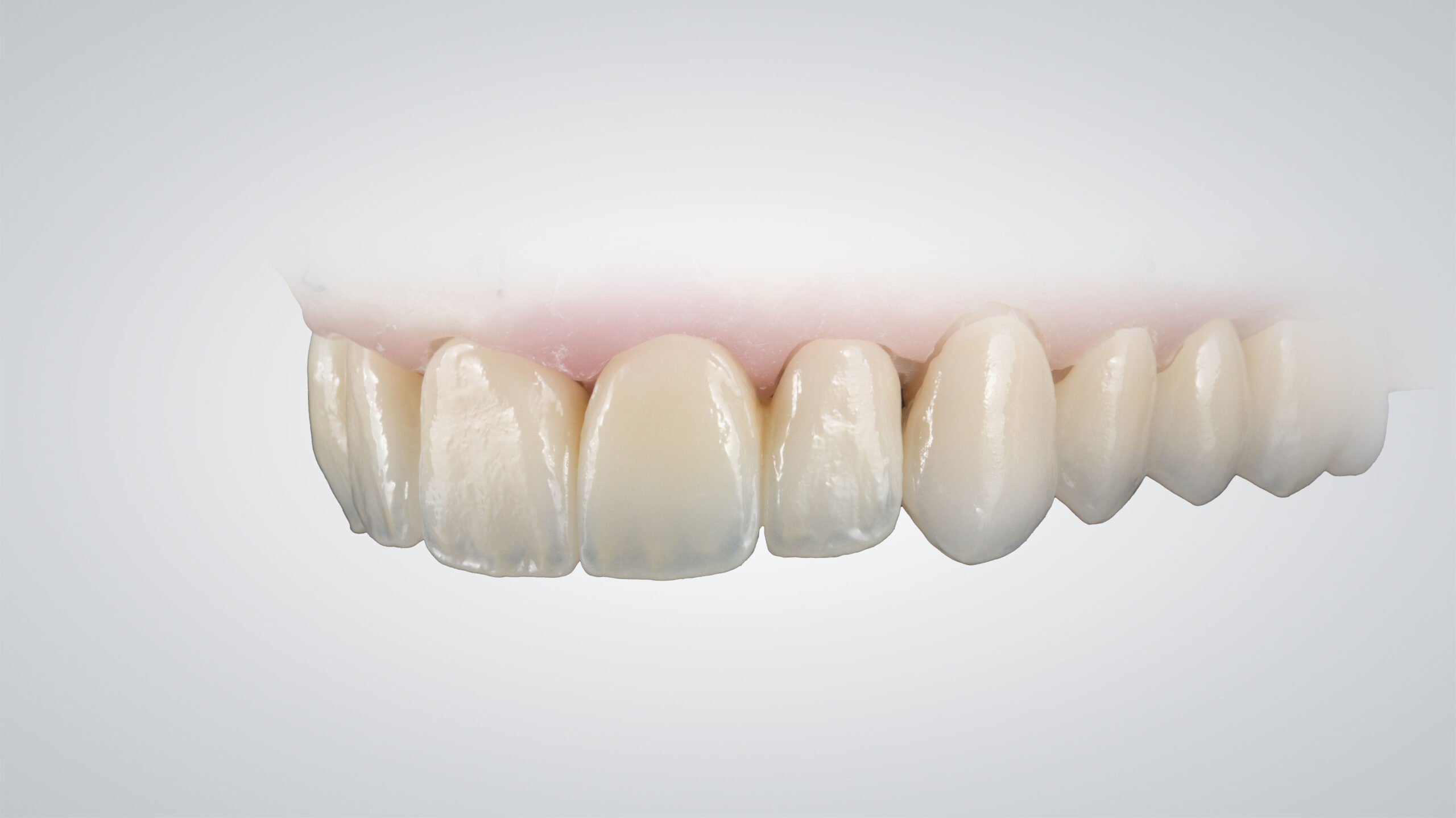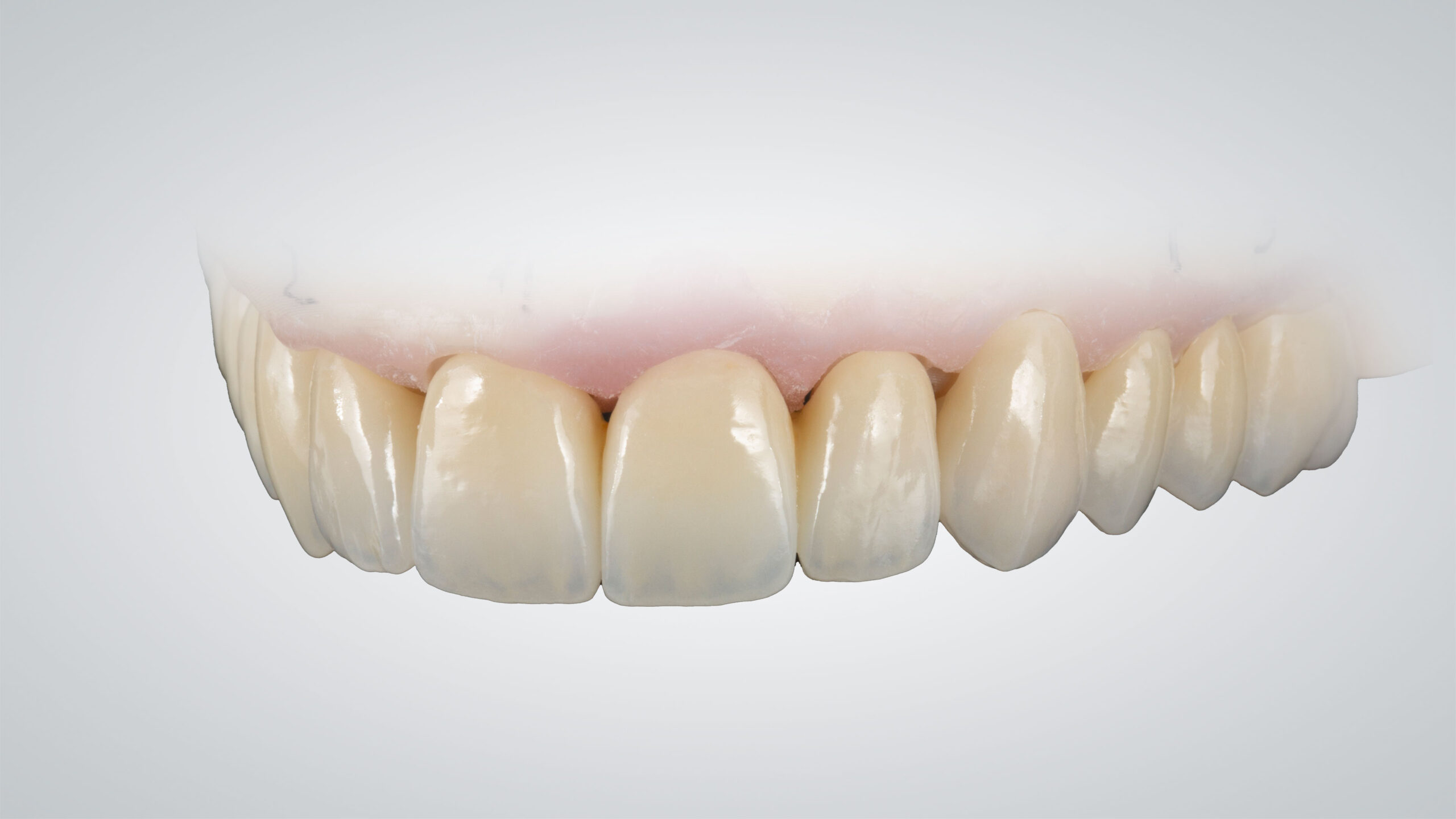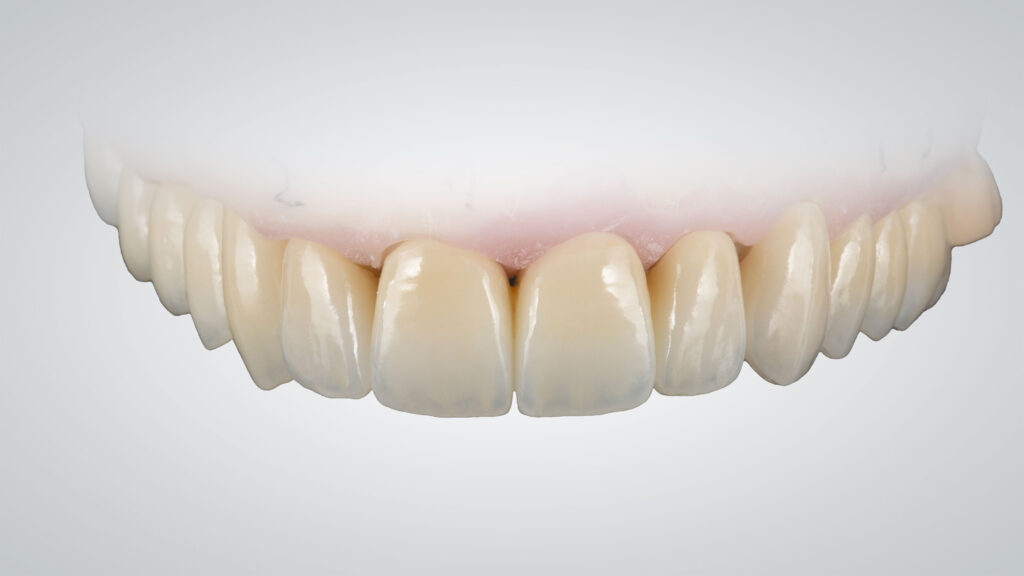 Sämtliche Restaurationen, vor und nach der Charakterisierung, in Frontalansicht. Bis zum ersten Prämolaren wurde eine Mikroreduktion vorgenommen, die Seitenzahn-Restaurationen sind vollständig monolithisch. Die im Micro-Layering-Verfahren hergestellten Frontzahnrestaurationen und die monolithischen Seitenzahnrestaurationen wirken vollkommen harmonisch und lassen eine naturgetreue Opaleszenz und Fluoreszenz erkennen.