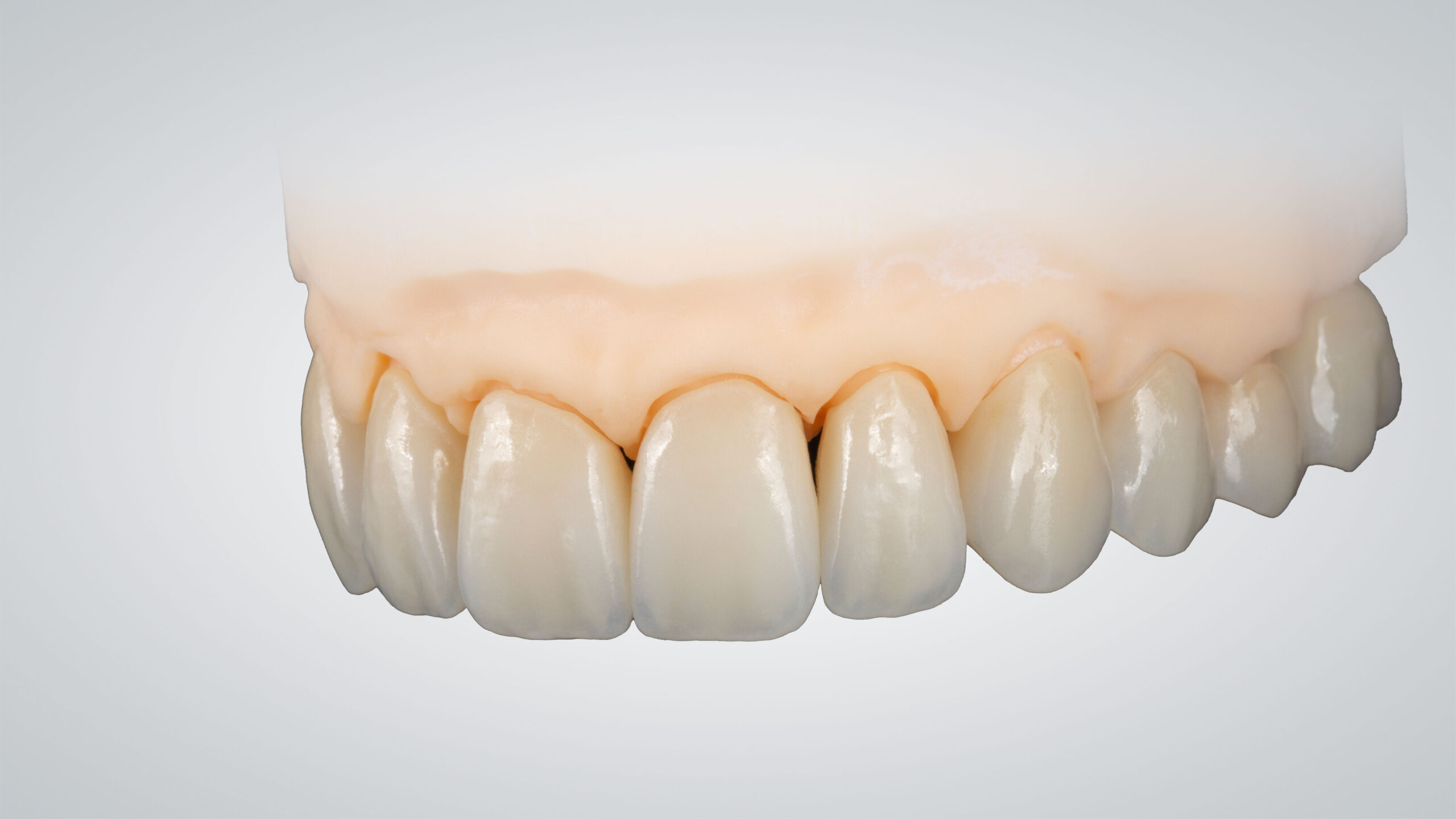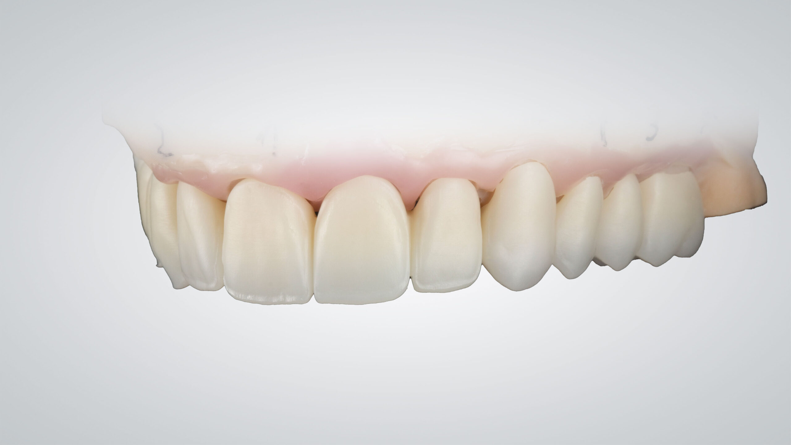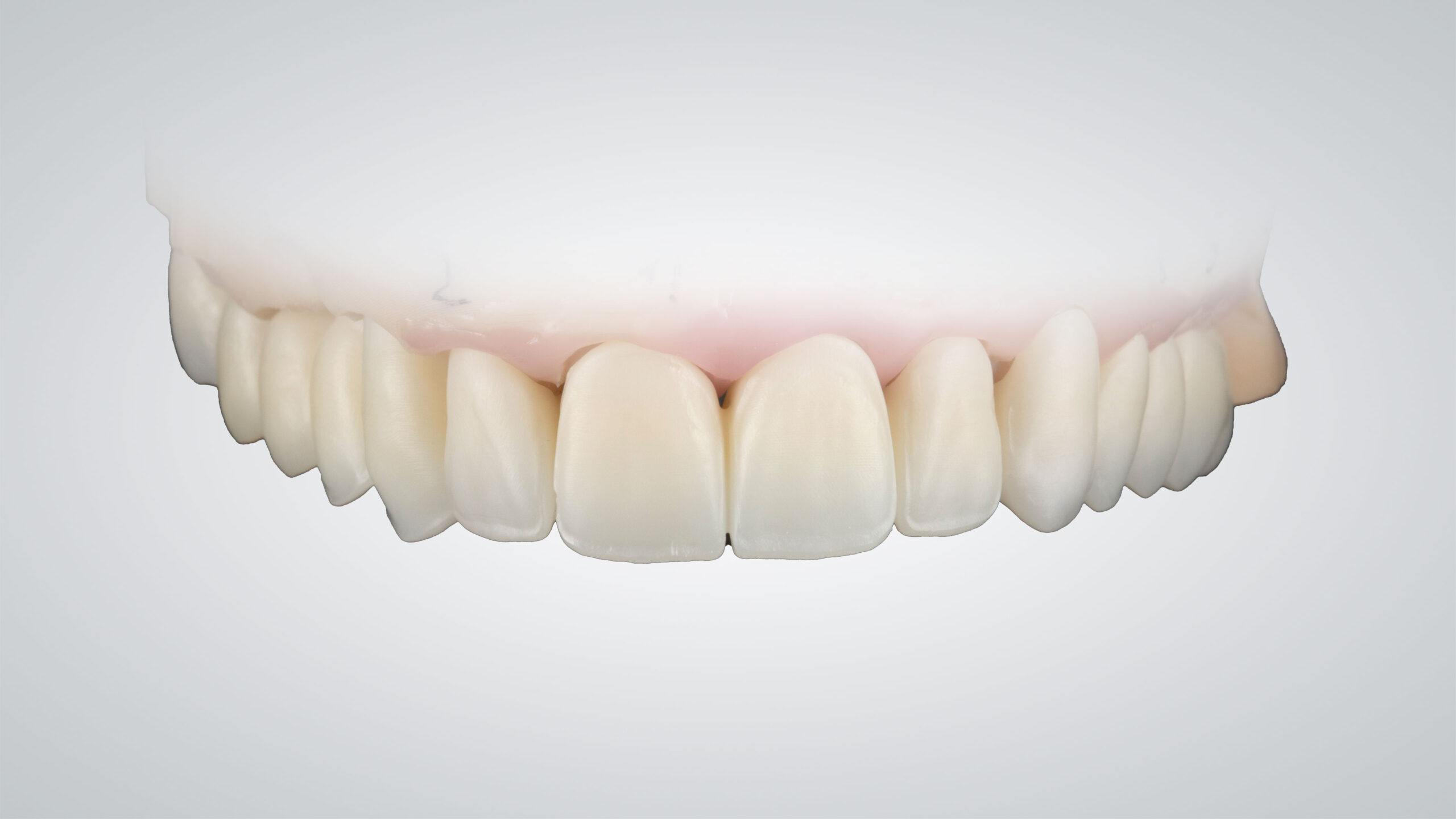 Sämtliche Restaurationen, vor und nach der Charakterisierung, in Frontalansicht. Bis zum ersten Prämolaren wurde eine Mikroreduktion vorgenommen, die Seitenzahn-Restaurationen sind vollständig monolithisch. Die im Micro-Layering-Verfahren hergestellten Frontzahnrestaurationen und die monolithischen Seitenzahnrestaurationen wirken vollkommen harmonisch und lassen eine naturgetreue Opaleszenz und Fluoreszenz erkennen.