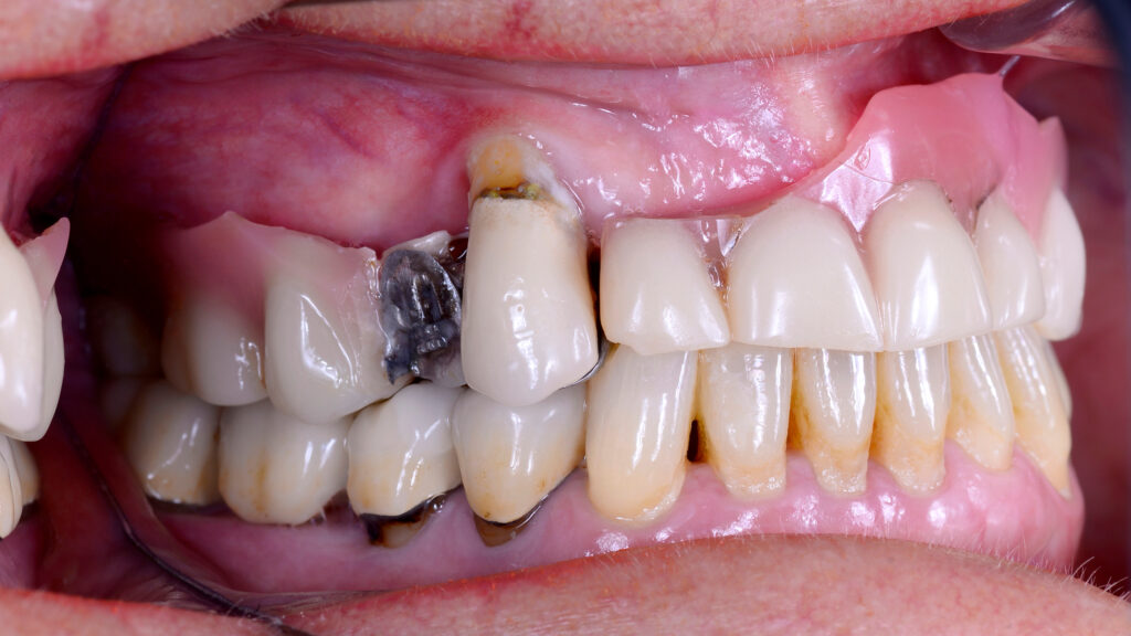 Im vorliegenden Fall war die knapp 78-jährige Patientin, ehemals starke Raucherin, von ihrem letzten Behandler zur implantatprothetischen Versorgung überwiesen worden. In den zurückliegenden Jahren hatte die Patientin in Folge einer generalisierten, chronischen Parodontitis alle Oberkieferzähne verloren – bis auf den mittlerweile stark kompromittierten, gelockerten und nicht mehr erhaltungsfähigen Zahn 13. Die Patientin klagte über anhaltende Blutungen, eine schmerzempfindliche Schleimhaut im Oberkieferbereich sowie über „fauligen“ Mundgeruch. Ihr vordringlichster Wunsch waren „schnellstmöglich feste Zähne“, mit denen sie endlich wieder ohne Schmerzen „zubeißen“ und „sich zeigen“ könne. Es wurden mit ihr mehrere implantatprothetische Therapiealternativen besprochen. Eine herausnehmbare Versorgung, sogar wenn implantatgestützt, kam für sie aufgrund ihrer bisherigen Erfahrungen grundsätzlich nicht mehr in Betracht. Wichtig war ihr zudem eine möglichst kurze Therapiedauer mit wenigen Sitzungen, da sie unter anderem einen längeren Anfahrtsweg aus dem Umland hätte.