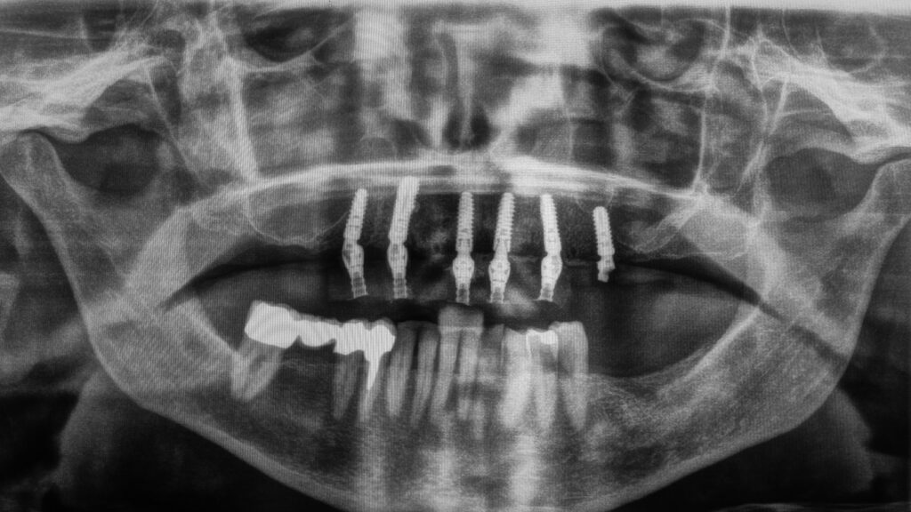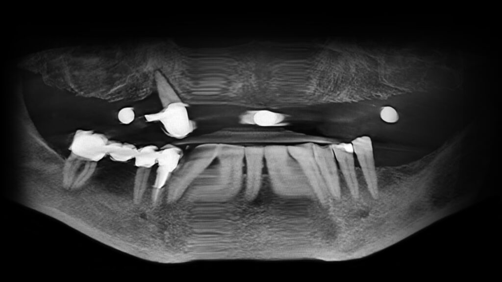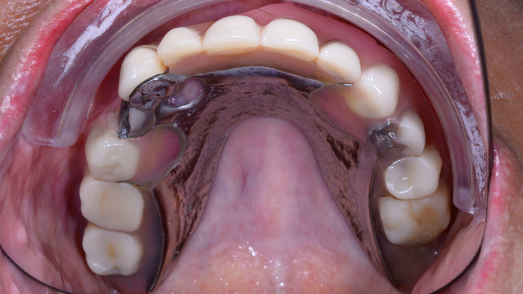 Eine erste klinische Inspektion zeigte einen teilbezahnten und augenscheinlich gut versorgten Unterkiefer. Im Oberkiefer hingegen ließ sich, bedingt durch die lange Tragedauer der desolaten Zahnprothese, bereits ein reduziertes Knochenangebot erkennen. Die Option, im Oberkiefer zunächst einen Knochenaufbau durchzuführen, um danach zu implantieren, lehnte die Patientin als zu invasiv und zeitaufwendig ab. Sie favorisierte vielmehr, vorbehaltlich des Ergebnisses der radiologischen Inspektion, eine Sofortimplantation mit provisorischer Versorgung, angelehnt an das Fast-and-Fixed-Konzept und ohne komplexe Augmentationen. Von dieser Therapiealternative versprach sie sich auch die optimale Aufwand-Nutzen-Relation. Entsprechend stimmte sie dem Vorschlag mit einer auf sechs Implantaten (copaSKY) bedingt festsitzenden Sofortversorgung zu. Im Unterkiefer wurde, um den intraoralen Keimspiegel der Unterkieferzähne auf einem möglichst niedrigen Niveau halten zu können, eine Full-Mouth-Desinfektion eingeplant (Abb. 1 bis 4).