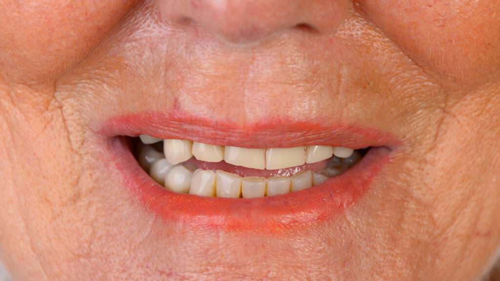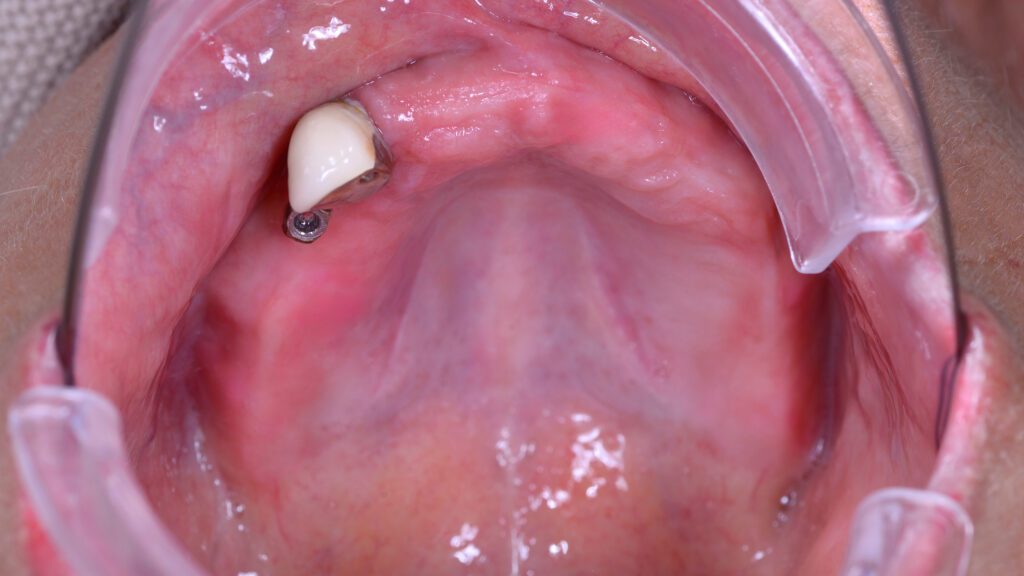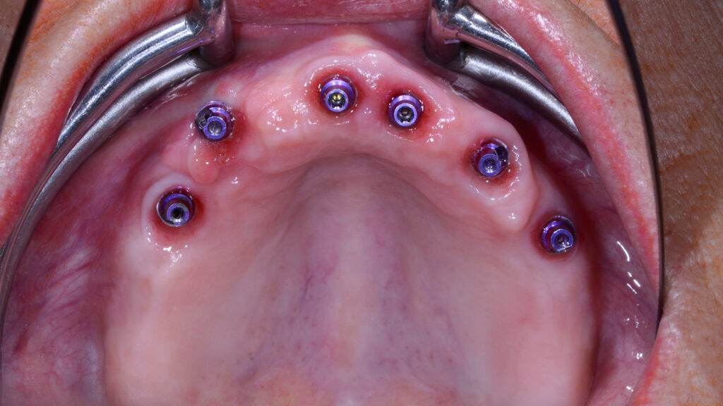 Für den prothetischen Aufbau wurden i. r. 11 und 21 gerade, ansonsten transversal verschraubbare 17,5°-gewinkelte Abutments verschraubt. Alle weiteren Arbeitsschritte konnten daher auf Abutmentniveau erfolgen. Das krestale Knochenniveau kann sich stabilisieren und das zirkuläre Weichgewebe ohne Irritation ausbilden.