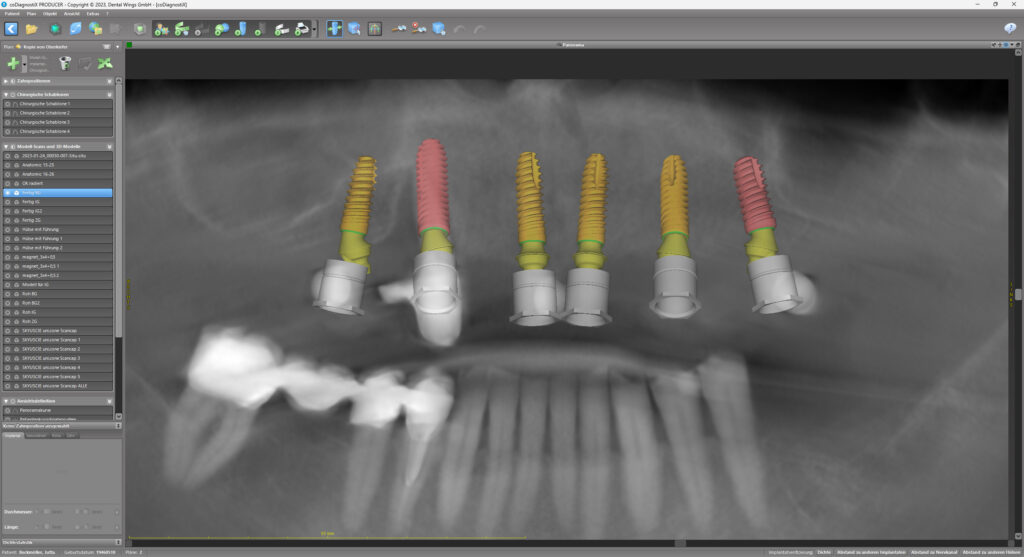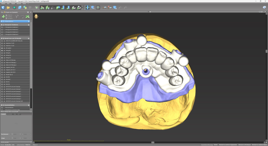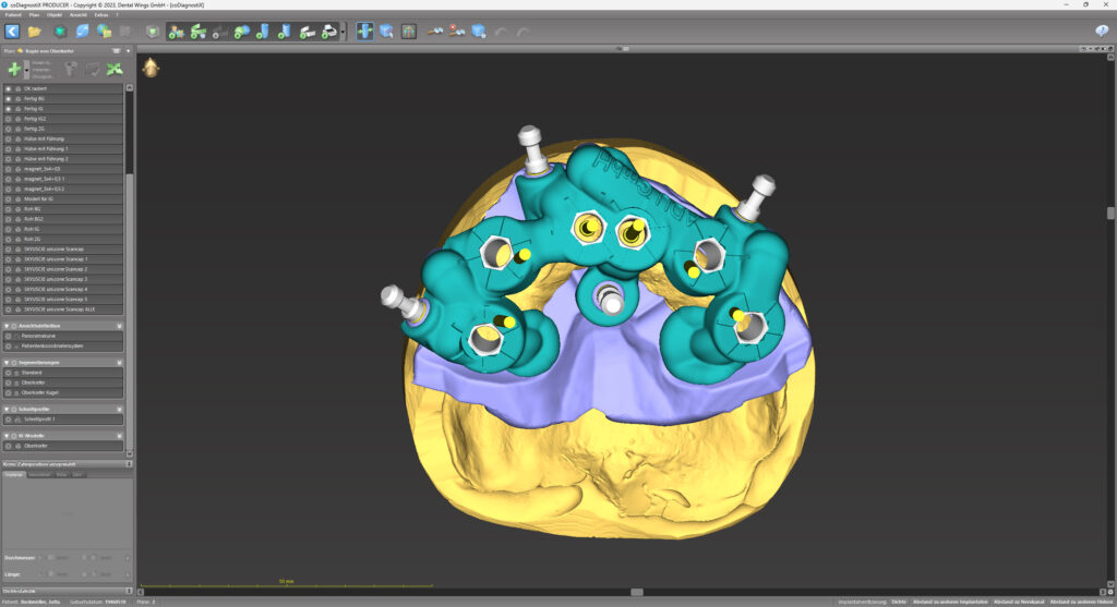 Die allgemeinmedizinische Anamnese ergab keine mit der Parodontitis vergesellschafteten Allgemeinerkrankungen sowie sonstige Risikofaktoren für eine Implantattherapie bzw. einer eventuellen Periimplantits [6]. Das Weichgewebe im Oberkiefer – neben einem geeigneten Knochenlager entscheidender Faktor für eine dauerhaft stabile Osseointegration [7] – zeigte sich weitgehend entzündungsfrei. Es bot damit eine gute Ausgangsposition für die Ausbildung ausreichend voluminöser Weichgewebemanschetten, was wiederum das Risiko eines periimplantären Knochenverlust sinken lässt [1, 3]. In der 3D-Darstellung erwies sich die knöcherne Situation im Oberkiefer als geeignet für die vorgesehene Fast-and-Fixed-Variante mit sechs Implantaten, davon zwei gerade Implantate in der Front und je zwei beidseitig im Seitenzahnbereich leicht anguliert gesetzte Implantate. Zudem ließen die Aufnahmen intakte faziale Knochenlamellen erkennen, sodass sich nach Extraktion von Zahn 13 eine full-guided-Implantation anbot. Als finale Prothetik war eine hochwertige Kompositversorgung geplant, basierend auf einer vorab digital vorgenommenen, idealisierten Aufstellung für das Provisorium (Abb. 5 bis 8).