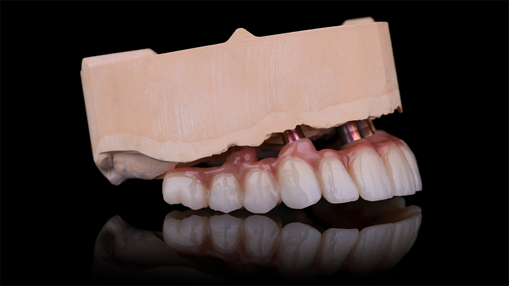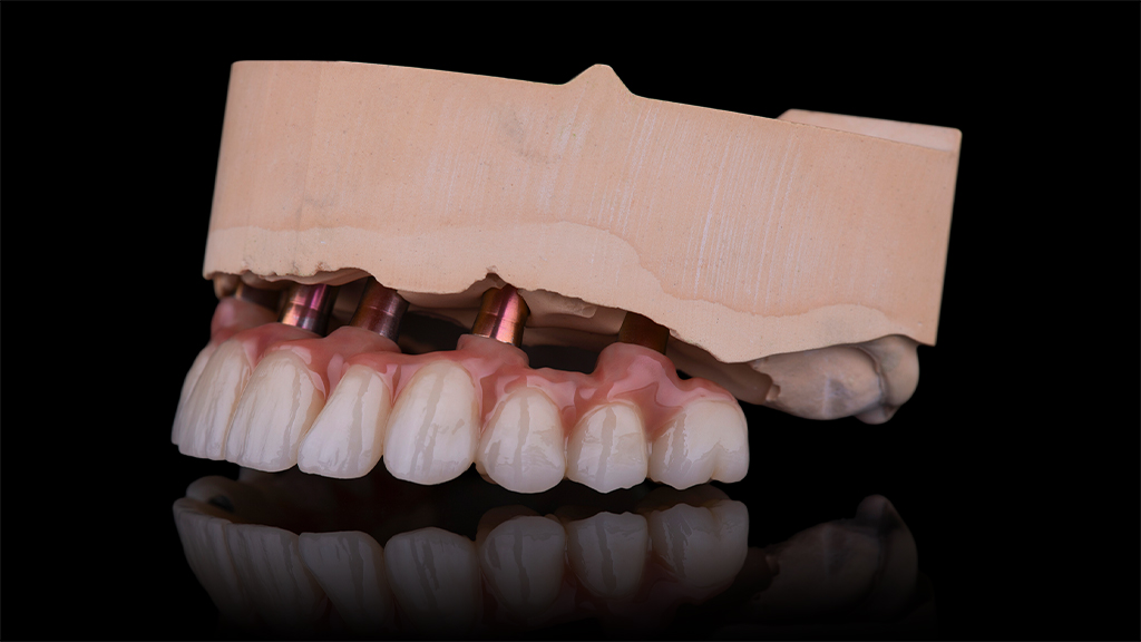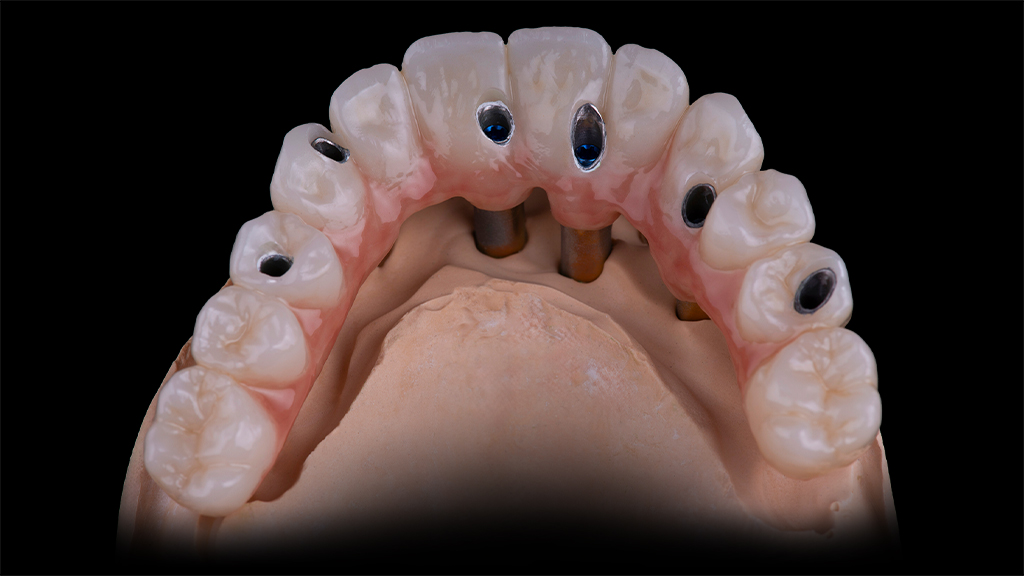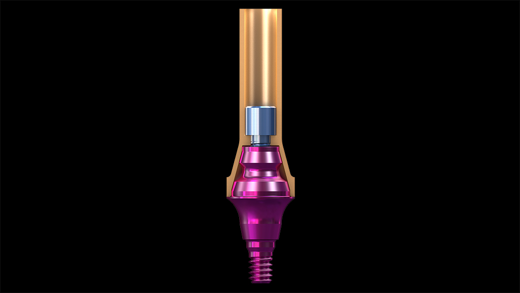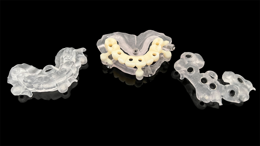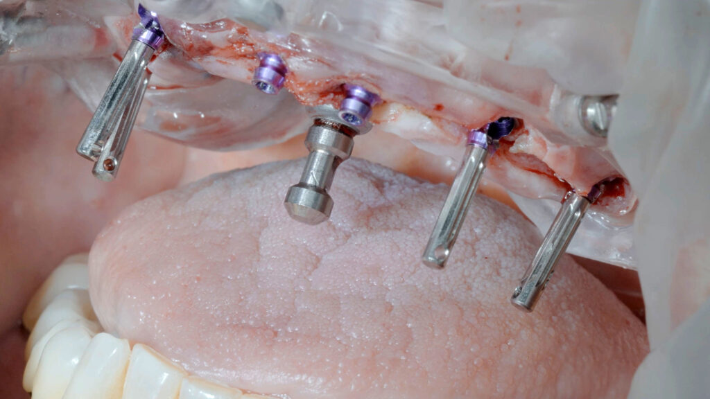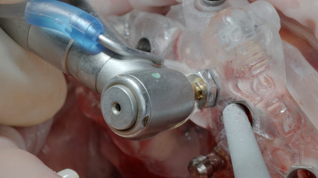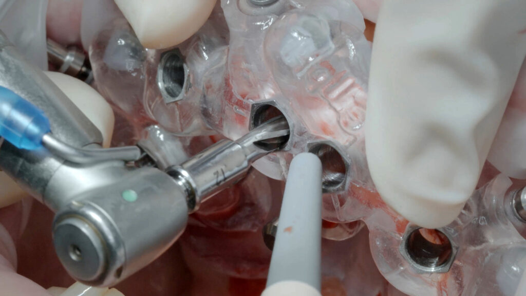 Die SKY uni.cone Abutments konnten anhand des geschlitzten unteren Teils der stapelbaren Bohrschablone direkt final nach dem Konzept der One-Time-Therapie eingedreht werden. Durch die Form-Fit-Verbindung erfolgt die laterale Lasteinleitung von einer Implantatbrücke direkt auf das Abutment, wodurch das Risiko von Schraubenlockerungen und Brüchen minimiert ist.