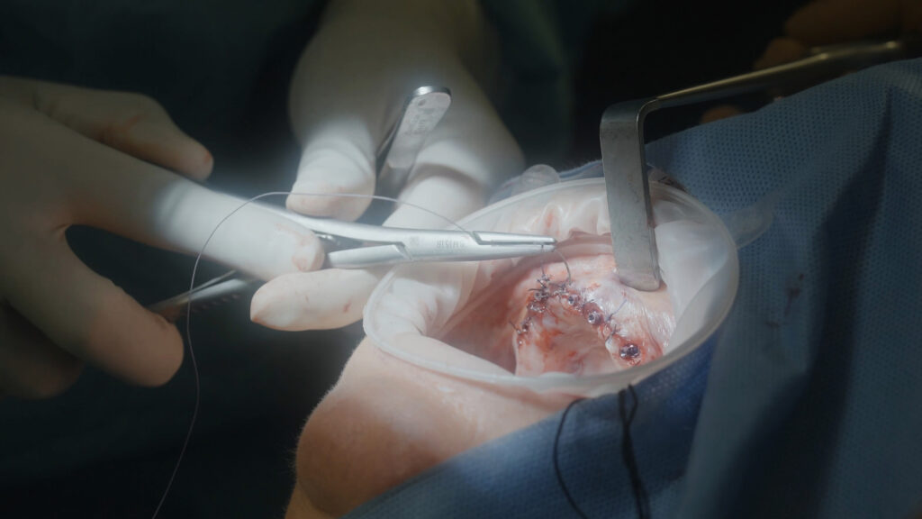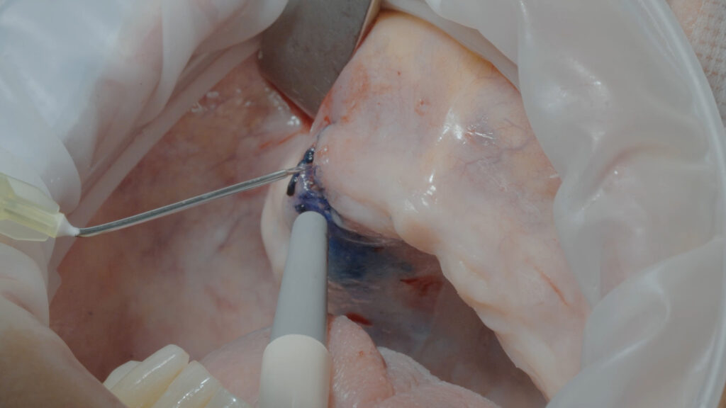 Ein Risikofaktor für unerwünschte Rezessionen der periimplantären Mukosa ist ein zu dünnes Weichgewebe. Daher sollte das vestibuläre Weichgewebe verdickt und darüber eine Verbreiterung der keratinisierten Gingiva sowie eine stabile Weichgewebemanschette erreicht werden [2]. Dafür wurde ein Mukosallappen unterminierend abpräpariert und die Tasche mit autologen Bindegewebestreifen verfüllt. Der GAP der Extraktionsalveole i. r. 13 sowie der Kieferkamm um die Implantate herum waren, soweit notwendig, ebenfalls mit Knochenersatzmaterial (MinerOss XP), vermischt mit autologen Knochenspänen und L-PRF, verfüllt. Abschließend wurde der gesamte Situs mit zwischenzeitlich hergestellter und zu einer Membran gepressten, soliden L-PRF Matrix abgedeckt und spannungsfrei und speicheldicht vernäht. So können die darunter liegenden wundheilungsfördenden Botenstoffe direkt aktiv werden, was wiederum zu einem raschen Wundverschluss und weniger Schwellungen führt (Abb. 9 bis 21).