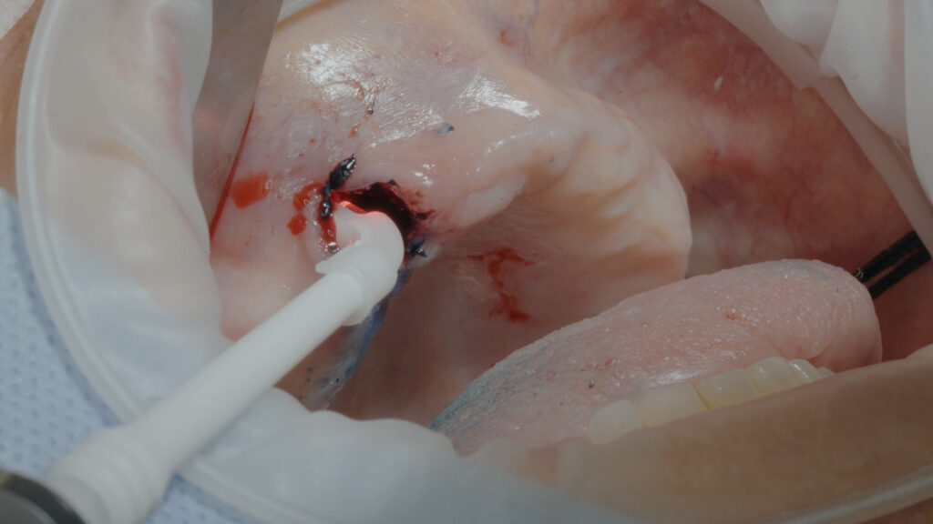 Anhand der digital erfassten Informationen vom CT-Scan über die Bissnahme bis zur STL-Datei der Abformung wurden sowohl eine stapelbare Bohrschablone (CoDiagnostiX, Dental Wings) sowie das Sofortprovisorium konstruiert und CAD/CAM-gestützt präimplantologisch angefertigt. Nach der problemlosen Extraktion von Zahn 13 wurde die Alveole von Granulationsgewebe versäubert und mit der antimikrobiellen photodynamischen Helbo-Therapie (aPDT) [4] desinfiziert. Dieses Verfahren ist für den Patienten vollkommen schmerzfrei. Es basiert auf dem Zusammenwirken zwischen einem photosensiblen Farbstoff und niedrigenergetischer Belichtung durch einen Laser (TheraLite Low Laser, LLLT). Dabei entsteht hochreaktiver Singulettsauerstoff, wodurch wiederum die Wände noch vorhandener Bakterien irreparabel zerstört werden. Somit kann auch einer sonst möglichen Sequesterbildung vorbeugt werden. Anschließend konnte mit der Implantation begonnen werden.