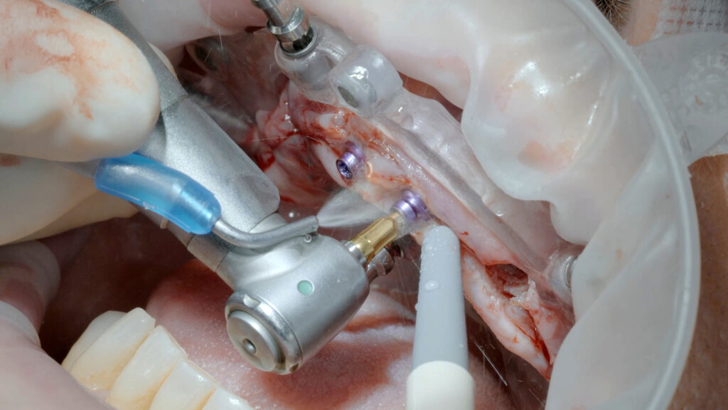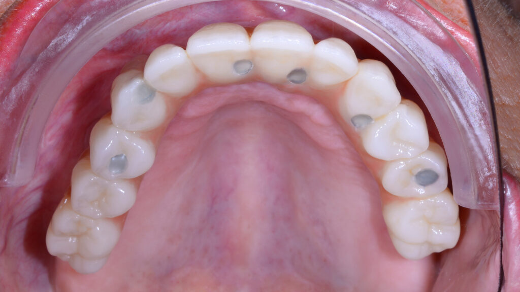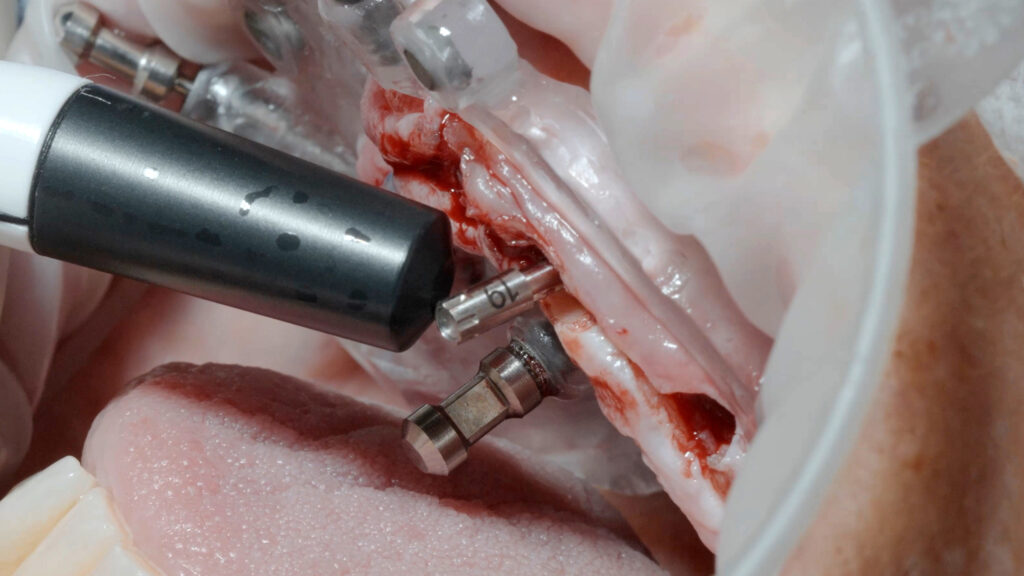 Die knochenspezifische Aufbereitung erfolgte nach Protokoll schrittweise in aufsteigender Reihenfolge durch die Full-Guide-Bohrschablone hindurch. Dabei verhindert ein fester Anschlag an der Hülsenoberkante ein zu tiefes Bohren und die Länge des Führungsschaftes ein Verkanten des Bohrers. Ein Wechsel der Hülsen ist nicht notwendig. Sechs copaSKY Implantate wurden auf diese Weise wie geplant leicht palatinal versetzt und damit ohne Kontaktrisiko zur vestibulären Lamelle in subkrestaler Position primärstabil eingebracht (i. r. 15: 3,5 x 10 mm; i. r. 13: 4,0 x 14 mm; i. r. 11, 21, 23: 3,5 x 12 mm; i. r. 25: 4,0 x 10 mm). Die RSA-Messung der Implantatstabilität mit dem Penguin II von bredent zeigte mit ± 75 ISQ (Implant Stability Quotient) sehr gute Werte für die Sofortversorgung. Zudem bietet ein weit gespreiztes Abstützungspolygon die optimale Stabilität für die geplante Prothetik unter gleichzeitiger Schonung des Hart- und Weichgewebes sowie der Nerven und der Gefäße. Um Knochenhöhe zu gewinnen, wurde auf den abgeschrägten und geätzten Implanatschultern, dem Backtaper, noch Knochenpartikel aus porcinem Knochenersatzmaterial (MinerOss XP, BioHorizons), vermischt mit autologem Knochen aus den Bohrstollen, aufgelagert. Das initiiert eine stabile, zirkumferenzielle Knochenneubildung (BoneGrowth Concept) [5] und in Folge die Ausbildung einer schützenden Gingivamanschette.