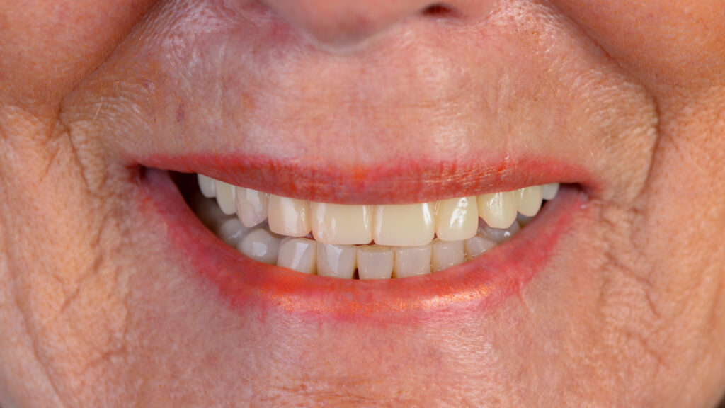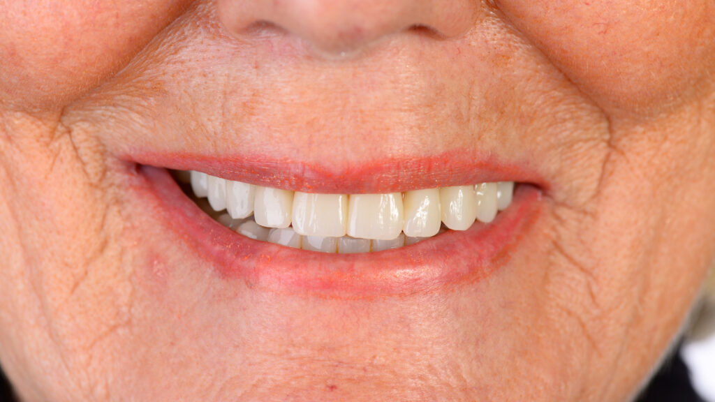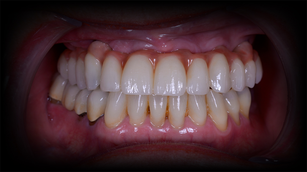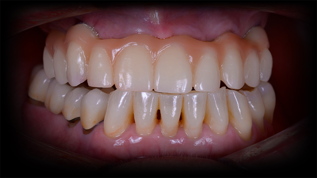 Vor dem Wundverschluss war das aus PMMA (breCAM.multiCOM) präfabrizierte Sofortprovisorium anhand der aufgesteckten Prothetikkappen auf seine spannungsfreie Passung hin kontrolliert worden. Nachdem die Kappen entsprechend gekürzt waren, wurde es extraoral mit den Kappen verklebt, finalisiert und auf den Abutments verschraubt. Zuvor war im Unterkiefer noch eine professionelle Zahnreinigung durchgeführt worden, um einen harmonischen Gesamteindruck herzustellen (Abb. 22 und 23).