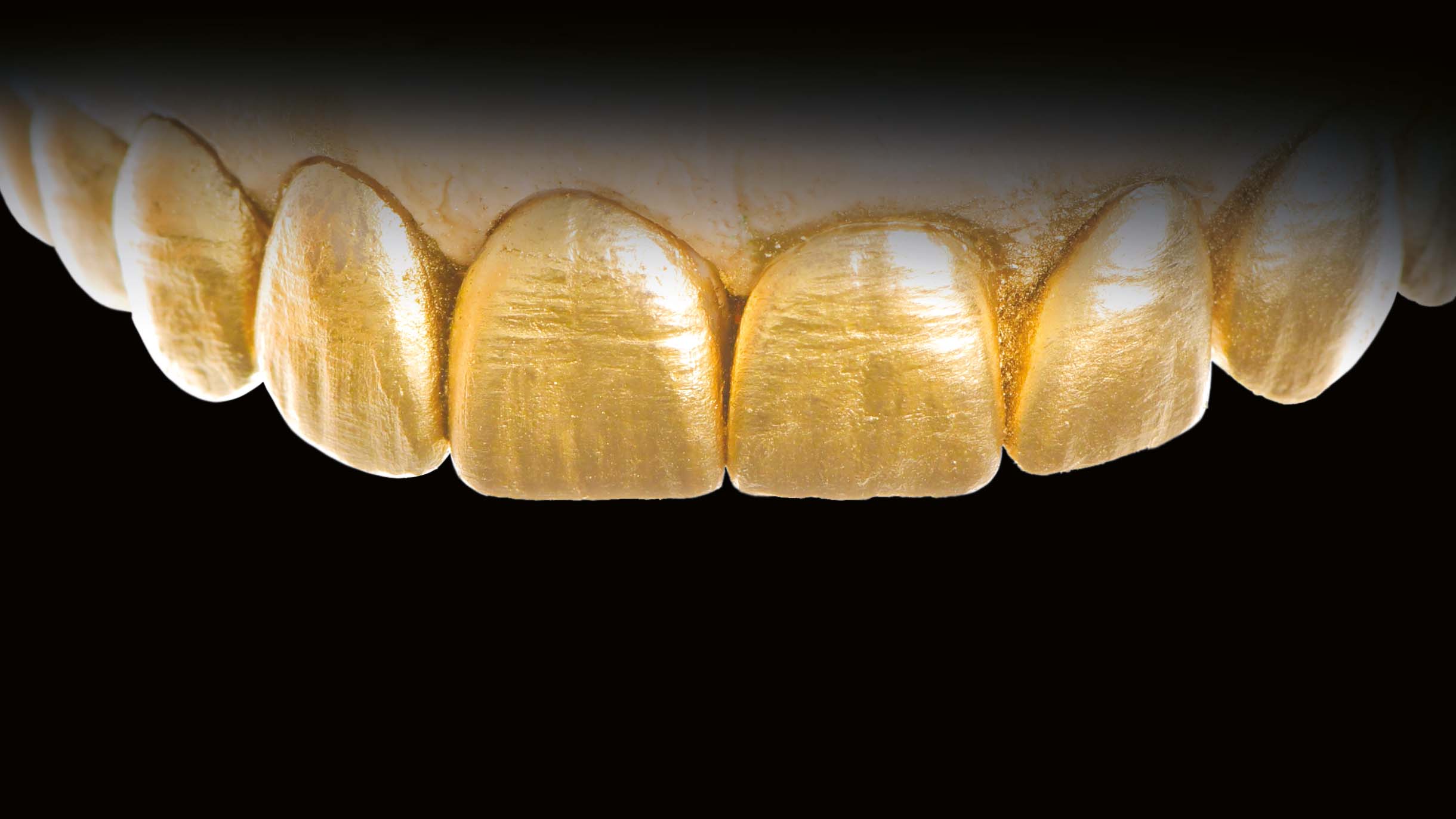 29 - Nach der Finalisierung wurden die Veneers zur optischen Überprüfung der Oberflächentextur und der Leisten mit Goldpuder bestäubt.