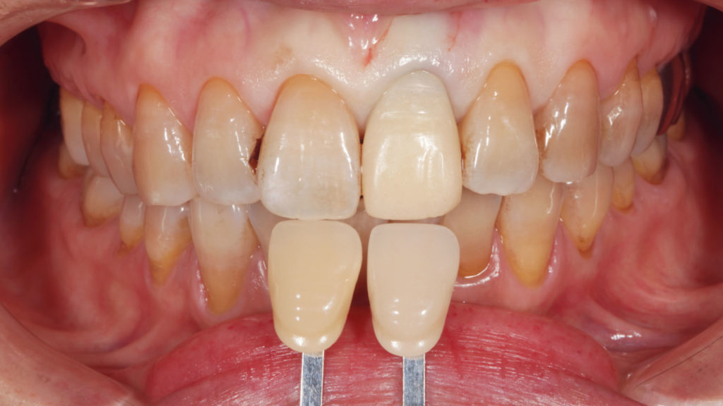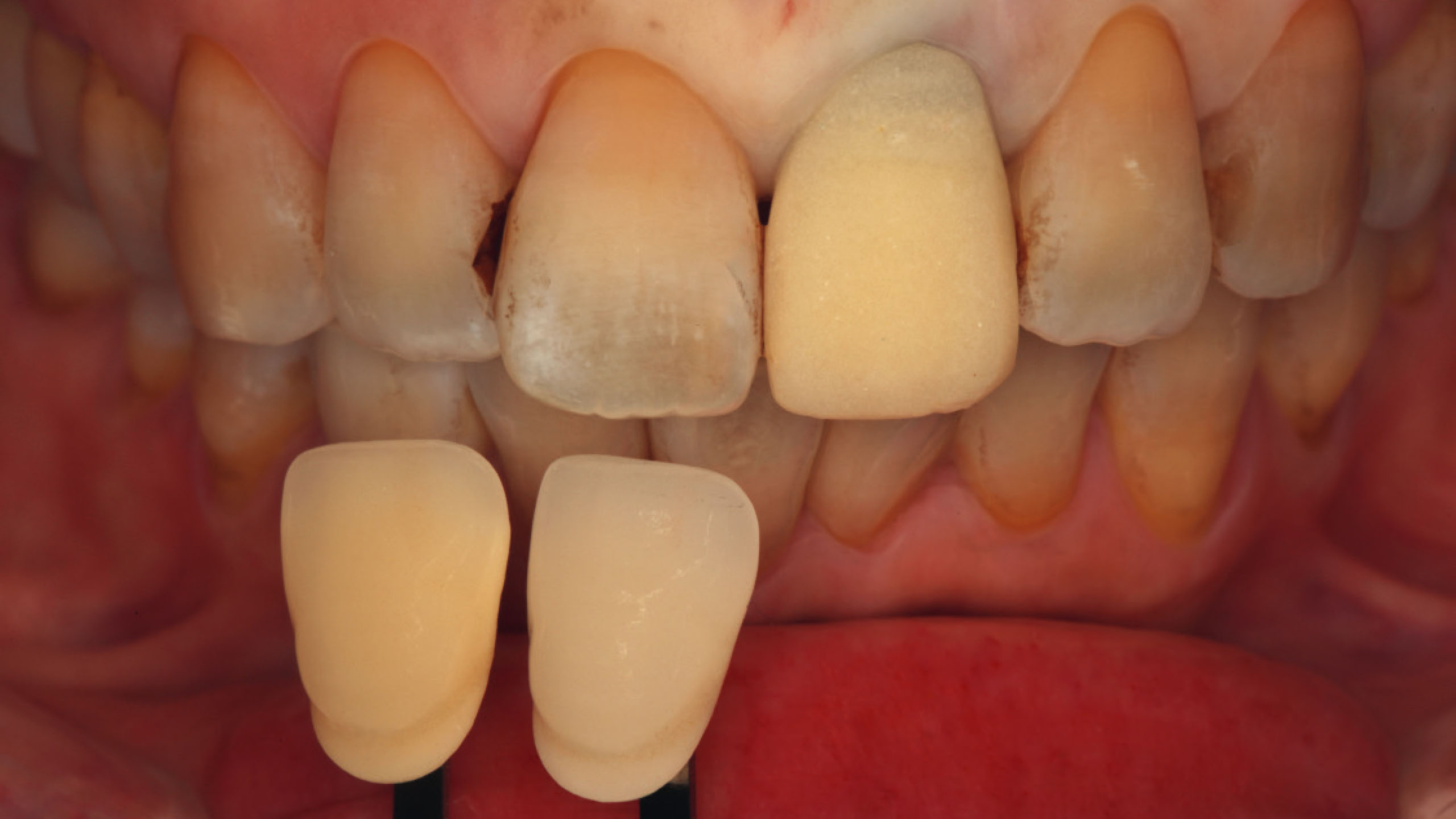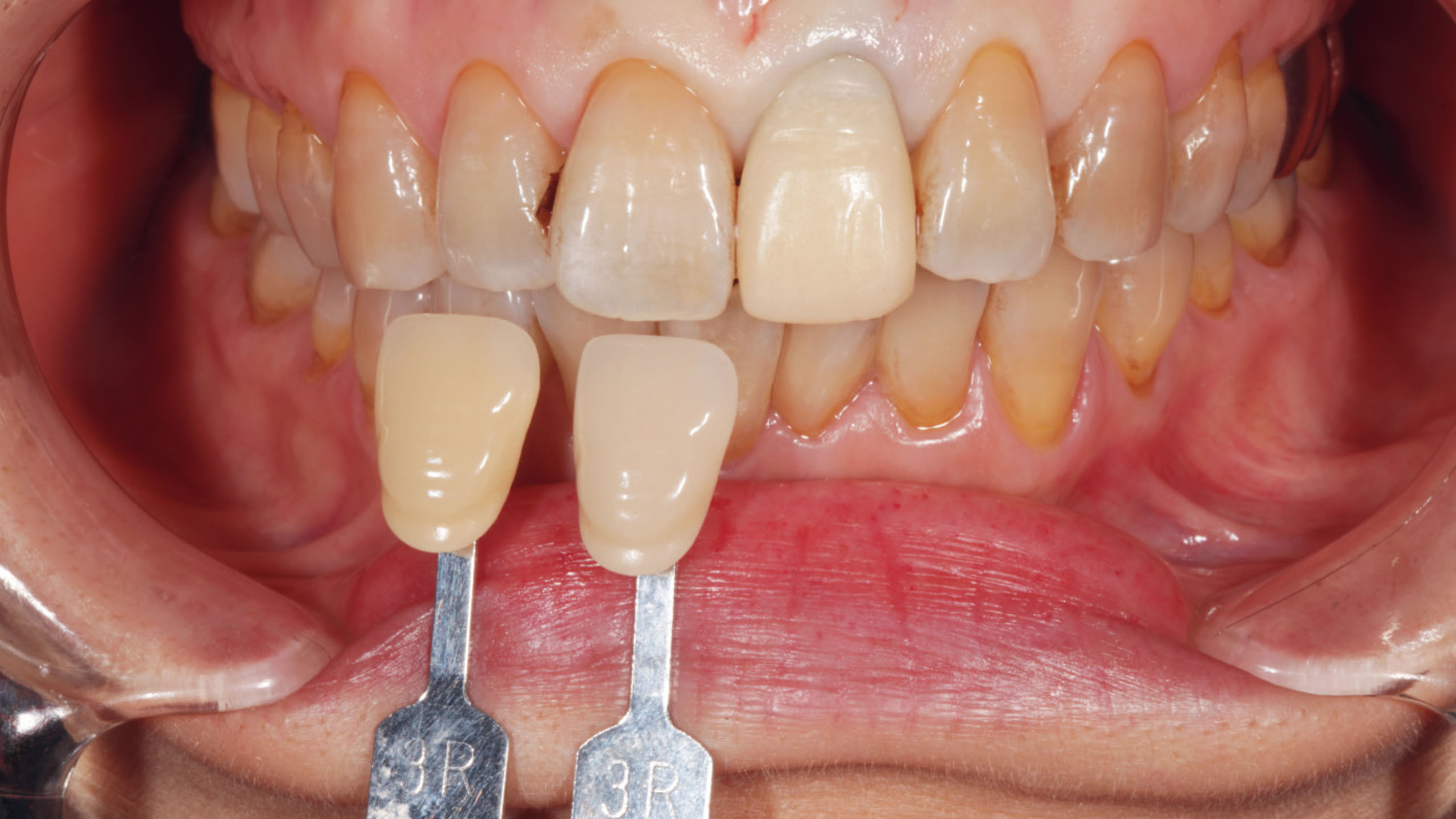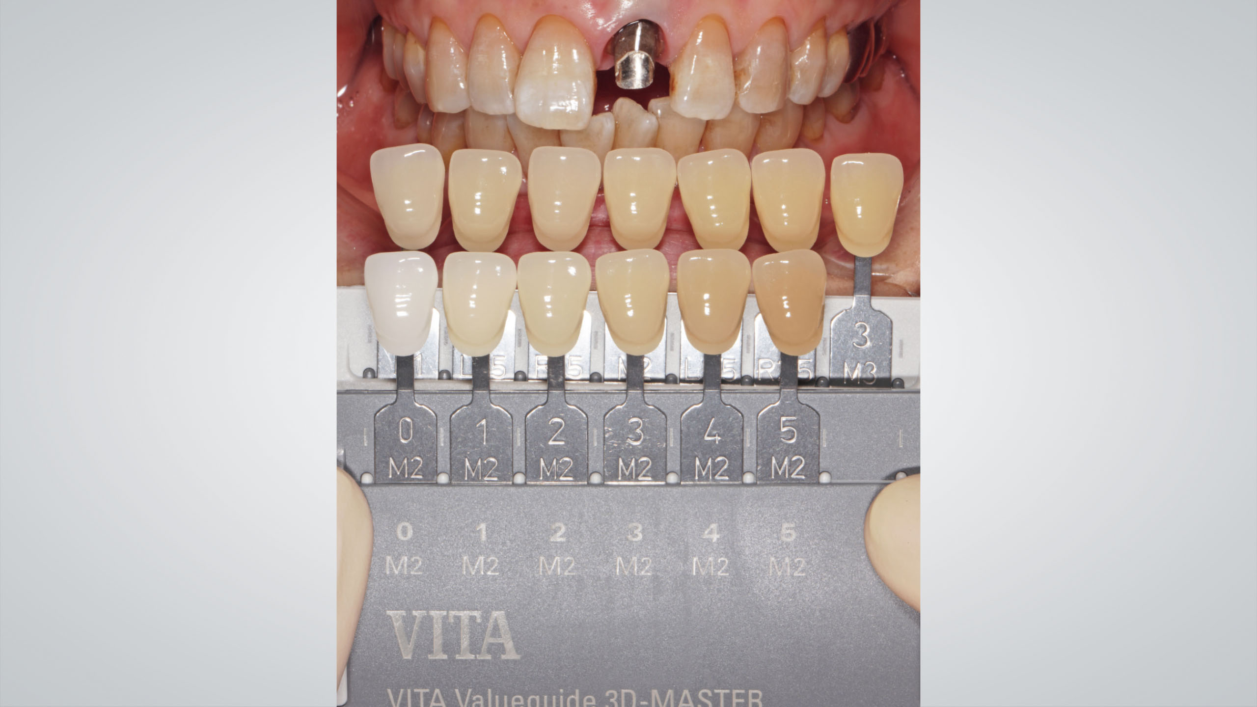 Eine Patientin stellte sich in der Zahnarztpraxis vor und wollte ihre Einzelkrone an 21 ersetzen lassen. Die Farbe und Charakterisierung der leblos wirkenden Keramik, die auf eine Metallgerüst geschichtet worden war, harmonierte offensichtlich nicht mit den natürlichen Nachbarzähnen. Der metallische Kronenrand war im Zervikalbereich sichtbar und nur teilweise mit direktem Kompositmaterial abgedeckt worden (Abb. 1). Es wurde eine partielle Silikonabformung genommen, die als Matrize für die intraorale Herstellung einer provisorischen Krone diente. Nach der Entfernung der insuffizienten Krone zeigte sich verfärbtes Dentin mit einem metallischen Stumpfaufbau (Abb. 2). Es wurde keine Sekundärkaries festgestellt. Die Röntgenbilder zeigten eine suffiziente endodontische Behandlung und keine periapikalen Entzündungszeichen. Um die Verfärbungen und den metallischen Stumpfaufbau zu maskieren, wurde ein Gerüst aus dem Zirkonoxid Vita YZ TColor mit dem Helligkeitsgrad LL1 geplant. Für die Verblendung wurde das feinstruktur-feldspatkeramische Verblendsystem Vita VM 9 gewählt, um ein natürliches Farb- und Lichtspiel zu etablieren. Für die intraorale Herstellung einer farblich passenden provisorischen Krone wurde die Grundzahnfarbe bestimmt. Zur Bestimmung der Dentinfarbe wurde der Vita Linearguide 3D-Master verwendet (Abb. 3), zur Bestimmung der Schmelzfarbe (Enamel) kam der Vita Toothguide 3D-Master zum Einsatz (Abb. 4). Die provisorische Krone wurde manuell mit selbsthärtendem Komposit und mithilfe der Silikonmatrize hergestellt. Sie wurde provisorisch zementiert und der Überschuss entfernt.