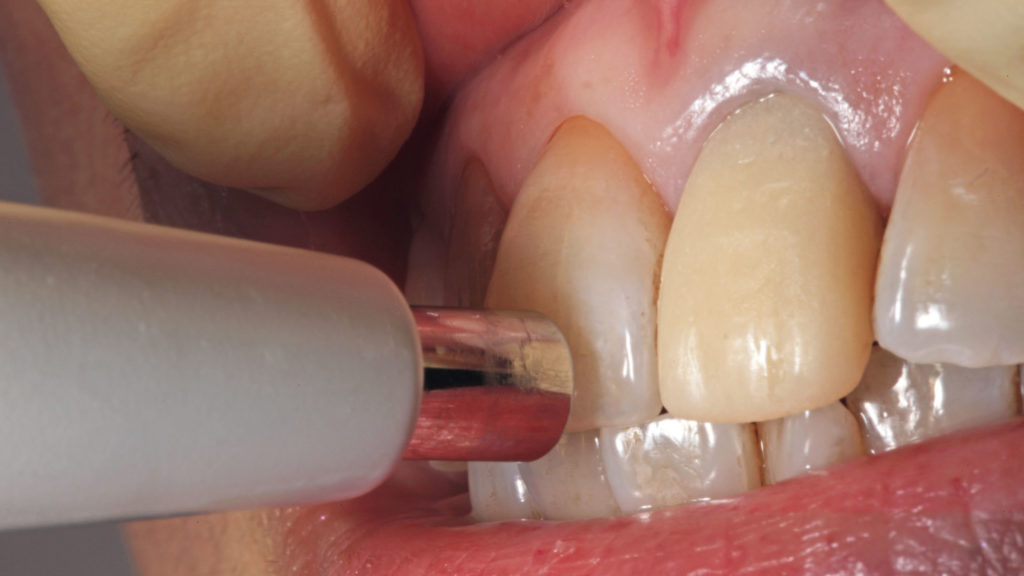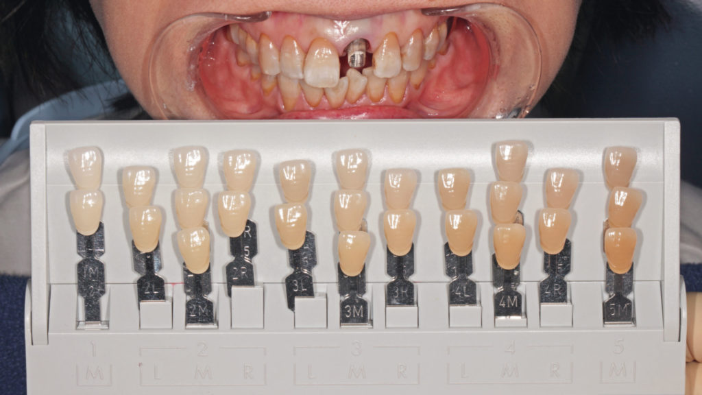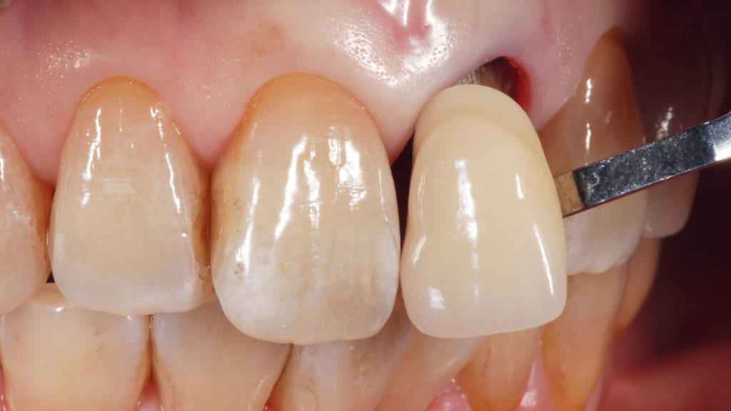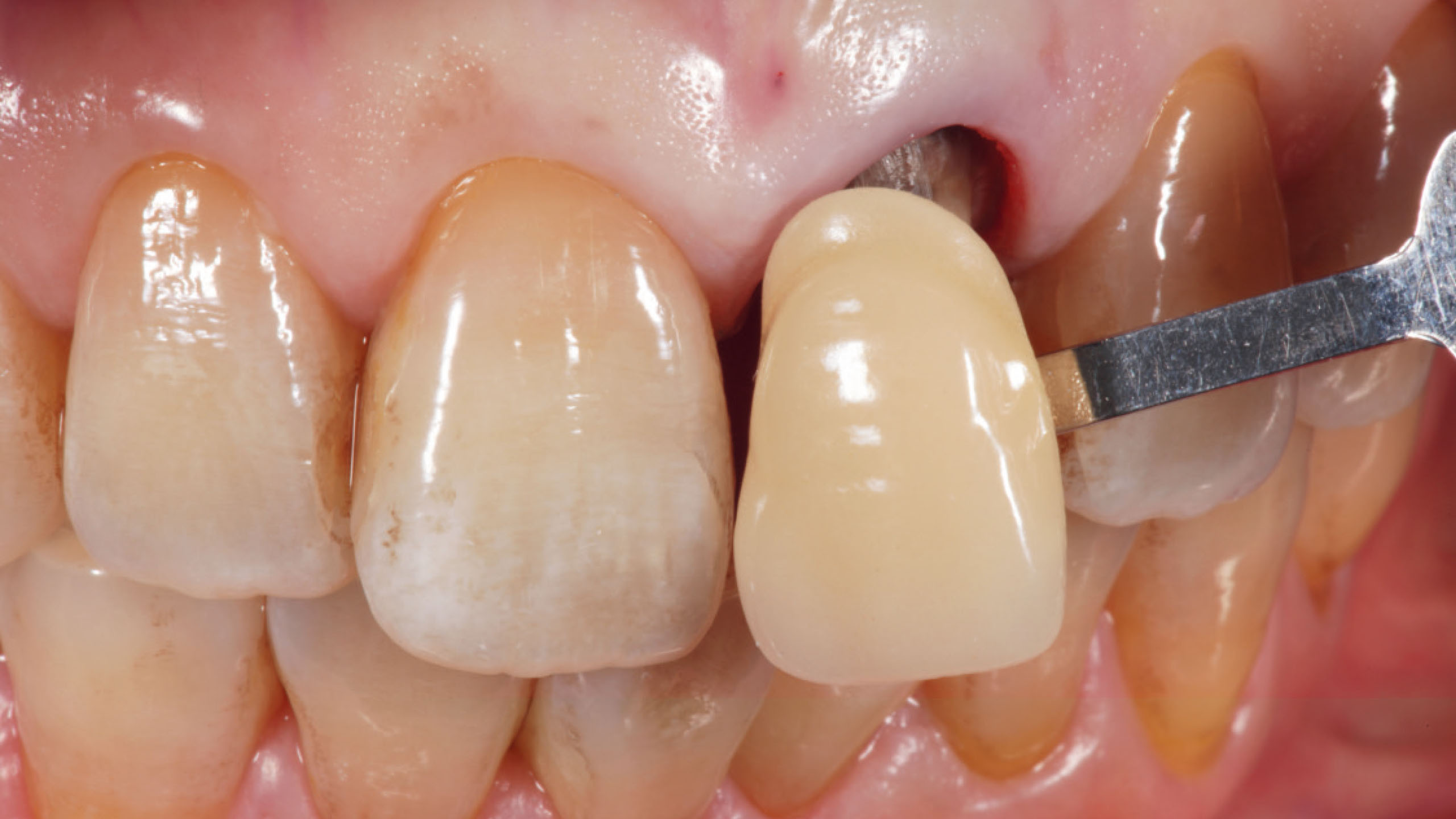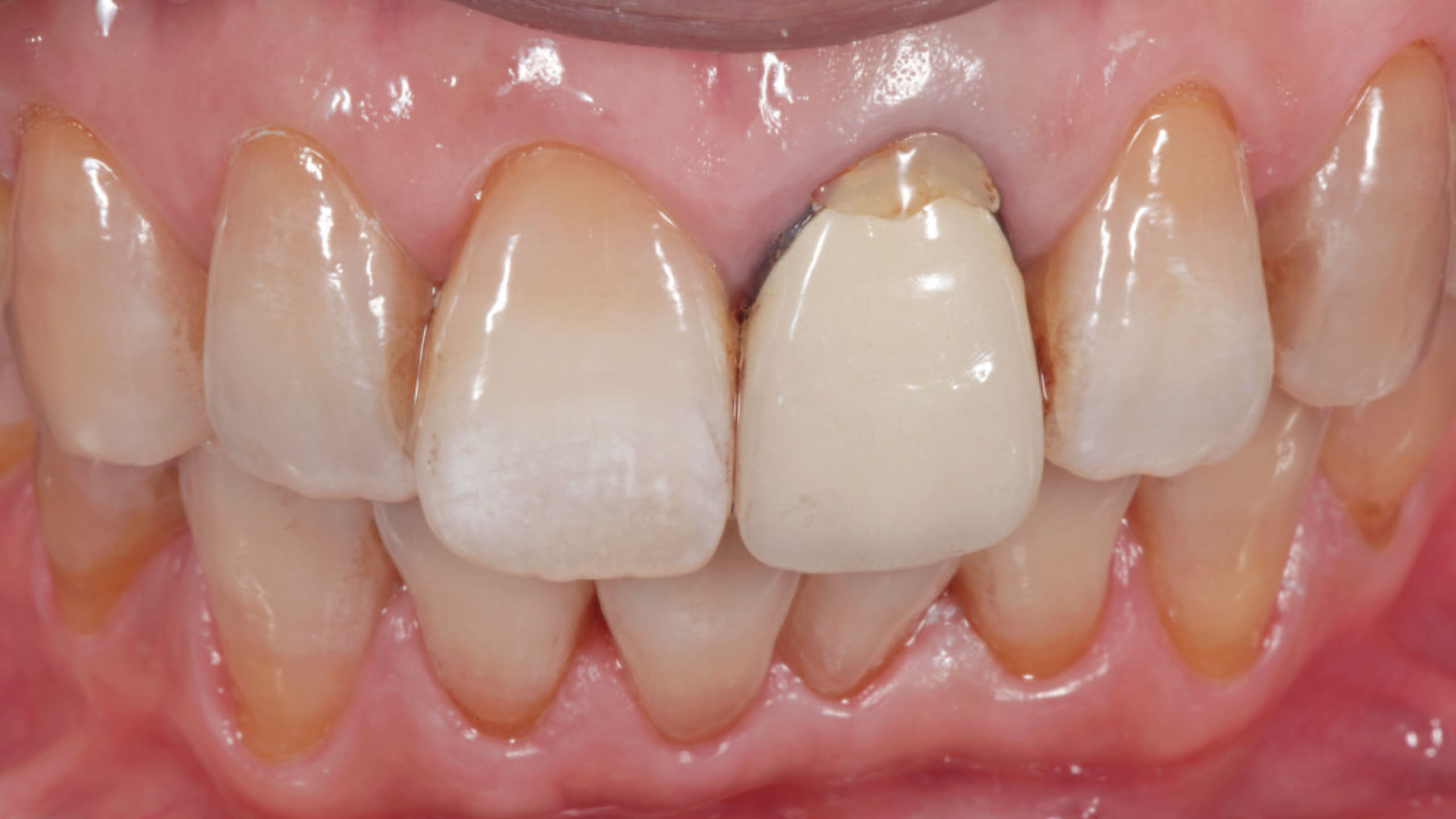 Eine Patientin stellte sich in der Zahnarztpraxis vor und wollte ihre Einzelkrone an 21 ersetzen lassen. Die Farbe und Charakterisierung der leblos wirkenden Keramik, die auf eine Metallgerüst geschichtet worden war, harmonierte offensichtlich nicht mit den natürlichen Nachbarzähnen. Der metallische Kronenrand war im Zervikalbereich sichtbar und nur teilweise mit direktem Kompositmaterial abgedeckt worden (Abb. 1). Es wurde eine partielle Silikonabformung genommen, die als Matrize für die intraorale Herstellung einer provisorischen Krone diente. Nach der Entfernung der insuffizienten Krone zeigte sich verfärbtes Dentin mit einem metallischen Stumpfaufbau (Abb. 2). Es wurde keine Sekundärkaries festgestellt. Die Röntgenbilder zeigten eine suffiziente endodontische Behandlung und keine periapikalen Entzündungszeichen. Um die Verfärbungen und den metallischen Stumpfaufbau zu maskieren, wurde ein Gerüst aus dem Zirkonoxid Vita YZ TColor mit dem Helligkeitsgrad LL1 geplant. Für die Verblendung wurde das feinstruktur-feldspatkeramische Verblendsystem Vita VM 9 gewählt, um ein natürliches Farb- und Lichtspiel zu etablieren. Für die intraorale Herstellung einer farblich passenden provisorischen Krone wurde die Grundzahnfarbe bestimmt. Zur Bestimmung der Dentinfarbe wurde der Vita Linearguide 3D-Master verwendet (Abb. 3), zur Bestimmung der Schmelzfarbe (Enamel) kam der Vita Toothguide 3D-Master zum Einsatz (Abb. 4). Die provisorische Krone wurde manuell mit selbsthärtendem Komposit und mithilfe der Silikonmatrize hergestellt. Sie wurde provisorisch zementiert und der Überschuss entfernt.