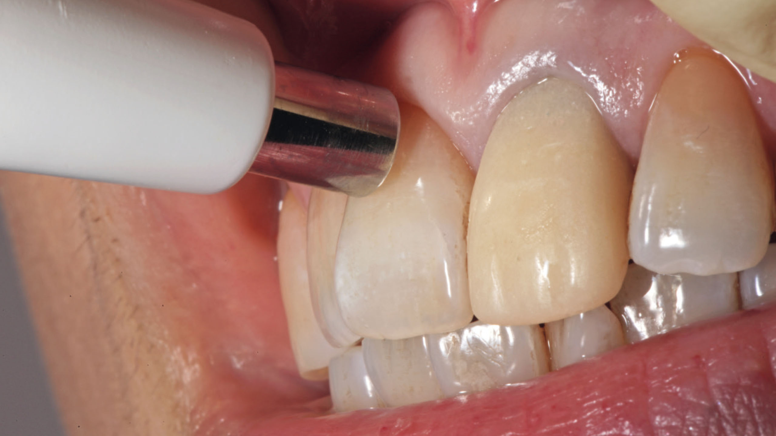 Die exakte Zahnfarbbestimmung ist ein wesentlicher Schritt bei der hochästhetischen keramischen Reproduktion in der ästhetischen Zone. Dementsprechend wurde die Farbe digital mit dem Spektrofotometer Vita Easyshade V bestimmt, wobei eine Drei-Punkt-Messung im zervikalen, zentralen und inzisalen Teil des benachbarten Schneidezahns (Abb. 5 und 6) erfolgte. Die Ergebnisse wurden mit den entsprechenden Farbmusterstäbchen und einer Digitalkamera dokumentiert, um dem Zahntechniker möglichst viele Informationen für die keramische Reproduktion zu liefern (Abb. 7 und 8). Die Charakteristika und inneren Strukturen der Zähne wurden mit dem Kreuzpolarisationsfilter