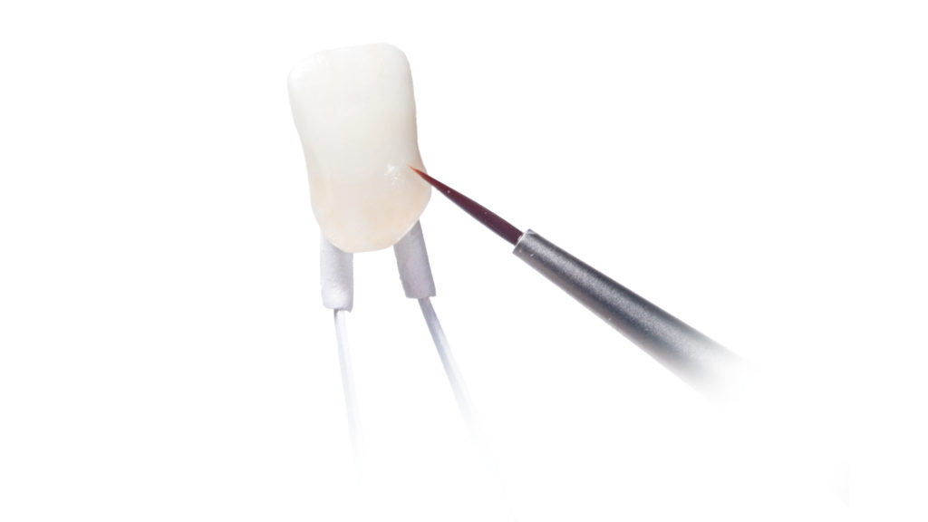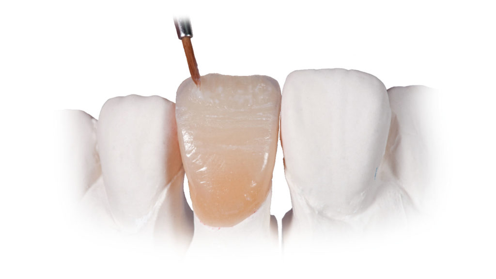 Nach dem Wash-Brand wurde das Zirkonoxidgerüst mit den orangen Vita Akzent Plus Effect Stains 5 (orange) und Body Stains 3 bemalt, um den zervikalen Bereich zu reproduzieren (Abb. 16 und 17). Nach dem zweiten Brand wurde Vita VM 9 Base Dentine 3M2 entsprechend der Basisfarbe geschichtet und mit den Effect Liners 6 (grün-gelb), 2 (beige) und 3 (braun), Chroma Plus 3 (hellorange-braun), Effect Chroma 10 (grün-braun) und Gingiva G2 (orange-rosa) in den zervikalen Bereichen individualisiert (Abb. 18). Nach dem ersten Dentinbrand (Abb. 19) wurde Base Dentine 3M2 an den seitlichen Rändern geschichtet, um die Basisfarbe zu unterstützen. Opaker Sun Dentine 3 (hellgelb) wurde im zentralen und zervikalen Bereich aufgetragen, um warme Effekte zu erzielen (Abb. 20). Im zweiten Schritt wurden Transpa Dentine 3M2 in der Mitte sowie Effect Chroma 10 (grün-braun) und 3 (hellgelb) im chromatischeren zervikalen Bereich aufgetragen. Für einen tief bläulichen Effekt an den seitlichen inzisalen Bereichen wurde Effect Enamel 10 (blau) hinzugefügt (Abb. 21). Im dritten Schritt wurden Effect Opal 1 (neutral) im lateralen und zentralen Bereich und helles Enamel (END) an der Inzisalkante geschichtet (Abb. 22). Alle Schichten der Feinstruktur-Feldspatkeramik wurden in einem Schritt gebrannt (Abb. 23). Anschließend wurden Form und Farbe in einem Korrekturbrand optimiert (Abb. 24). Die Charakterisierung der farblichen Effekte in der Tiefe erfolgte in zwei Schritten, um ein Verwischen der verwendeten Vita Interno Malfarben zu vermeiden. Zunächst wurden horizontale Charakterisierungen mittels feiner weißer Linien mit Interno 01 (weiß), kombiniert mit Interno 02 (sand) vorgenommen, um Mamelons zu kreieren. Interno 08 (blau) wurde für transluzente Effekte im oberen Drittel verwendet und Interno 10 (braun) und 05 (terracotta) zur zervikalen Farbkontrolle eingesetzt (Abb. 25). Diese horizontalen Charakterisierungen wurden im ersten Brand fixiert (Abb. 26). Für den zweiten Fixierungsbrand wurden vertikale weiße Charakterisierungen mit Interno 01 hinzugefügt (Abb. 27 und 28). Der Schmelz wurde schließlich mit einer Mischung aus Neutral, Window sowie EC1 (weiß) geschichtet und gebrannt (Abb. 29 und 30), gefolgt vom nächsten Brand mit verschiedenen Effect Enamels: EE3 (rosa-transluzent), EE4 (gelblich), EE5 (gelblich-transluzent), EE8 (rot-transluzent) und EE9 (bläulich-transluzent) (Abb. 31 und 32). Nach der groben Formgebung und Politur war die Krone bereit für eine erste klinische Einprobe (Abb. 33).