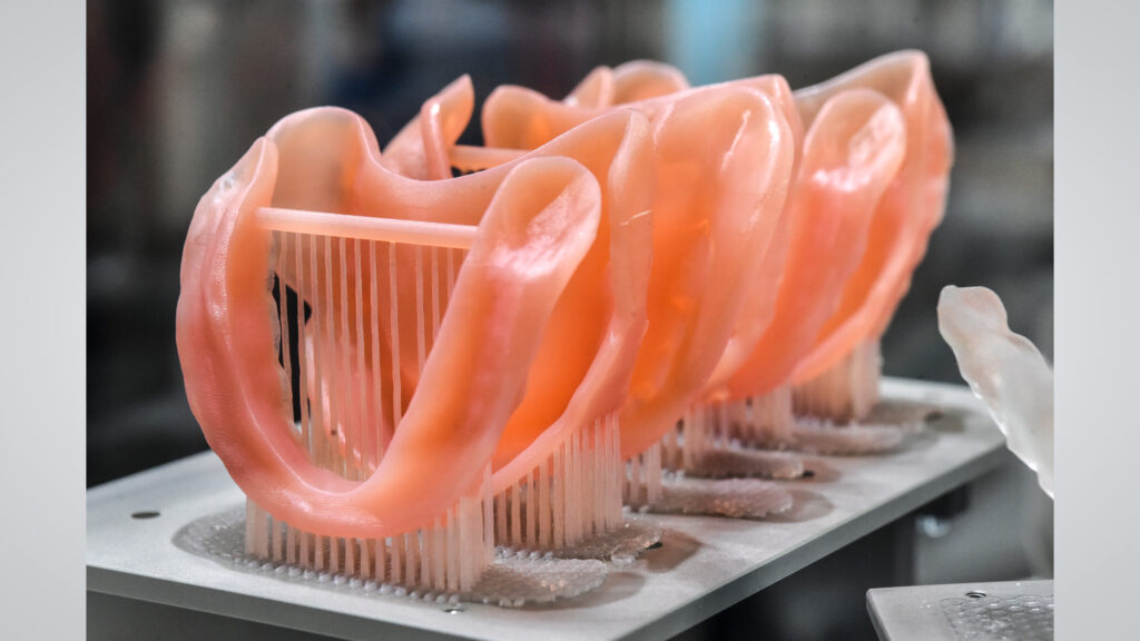 Eine gesonderte Betrachtung verdienen die zahnheilkundlichen Werkstoffe. Die Optionen haben sich – nicht zuletzt dank digitalgestützter Fräs- bzw. Schleifverfahren – in den letzten Jahren vervielfacht. War es vor 25 Jahren praktisch gesetzt, dass eine Krone oder ein Kronengerüst im Labor aus Gold hergestellt wurde, so lässt es sich heute alternativ dazu aus Zirkonoxid-, Lithiumdisilikat-, Lithiumsilikat-Keramiken (um nur die wichtigsten zu nennen) fertigen. Ein Implantat besteht klassischerweise aus Titan. Heute stehen auch Keramiken (z. B. Zirkonoxid) und Kunststoffe zur Verfügung. Bei Kunststoffen wie PEEK/Polyetheretherketon könnte sogar durch eine Verstärkung mit Kohlefasern unterschiedlicher Länge die Steifigkeit des Materials gezielt eingestellt werden, um die Lastübertragung auf den Kieferknochen zu verbessern; auch dabei ist eine KI-Unterstützung denkbar. Denn die Materialforschung stellt sogar ein besonders erfolgsträchtiges Spielfeld für Künstliche Intelligenz dar. Sie lernt schnell, Zusammensetzungen, Mikrostrukturen und Makroeigenschaften zu verbinden und schlägt neue Werkstoffkandidaten vor. So sind deutlich weniger Experimente nötig als bisher, womit die Forschung und Entwicklung auf ein höheres Tempo kommt. Mit dem 3D-Druck kommen abermals neue Möglichkeiten für die prothetische Versorgung hinzu. Das schließt unterschiedliche Verfahren, wie etwa das Selective-Laser-Melting (SLM), die photopolymerisationsbasierte Stereolithographie (SLA), das Digital-Light-Processing (DLP) und das Fused-Deposition-Modeling (FDM), und unterschiedliche Materialien ein, von der Kobalt-Chrom-Legierung bis zu verschiedenen Druckharzen.