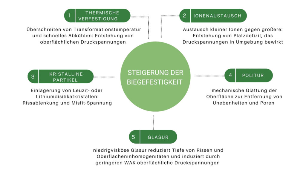 Im Rahmen der mechanischen Glättung keramischer Oberflächen kommen diamantierte Schleifkörper zum Einsatz, deren Härte höher ist als die der zu bearbeitenden Keramik. Durch die Bewegung des Schleifkörpers werden Grate und Unregelmäßigkeiten auf der Oberfläche der Keramik entfernt und das Material so geglättet. Durch die anschließende Politur der Oberfläche wird diese weiter veredelt, ohne dabei einen bedeutsamen Materialabtrag zu verursachen. Dies geschieht in mehreren Politurschritten mit einer Reihe an immer feinkörniger werdenden Partikeln. Neben der mechanischen Bearbeitung kann die Keramikoberfläche auch mit einer Glasurmasse behandelt werden. Hierbei wird auf die in ihrer Form fertige Restauration eine niedrigviskose Glasurmasse appliziert, anschließend folgt der Glasurbrand im Keramikofen[14]. Zum einen bewirkt eine derartige Behandlung durch das Eindringen der Glasurmasse in Oberflächendefekte oder Risse eine Reduktion der Tiefe der Oberflächeninhomogenitäten und dadurch eine Stärkung des Materials[43,44]. Zum anderen kann durch das Auftragen von Glasurmasse Druckspannung innerhalb der Keramik erzeugt werden, welche wiederum Rissentstehung und -ausbreitung entgegenwirkt und die Festigkeit des Werkstoffes steigert[45,46]. Realisiert wird dies, indem eine Glasurmasse gewählt wird, deren Wärmeausdehnungskoeffizient niedriger ist, als jener der Keramik. Dadurch wird nach dem Abkühlvorgang die Ausbildung einer Druckspannung realisiert[45].