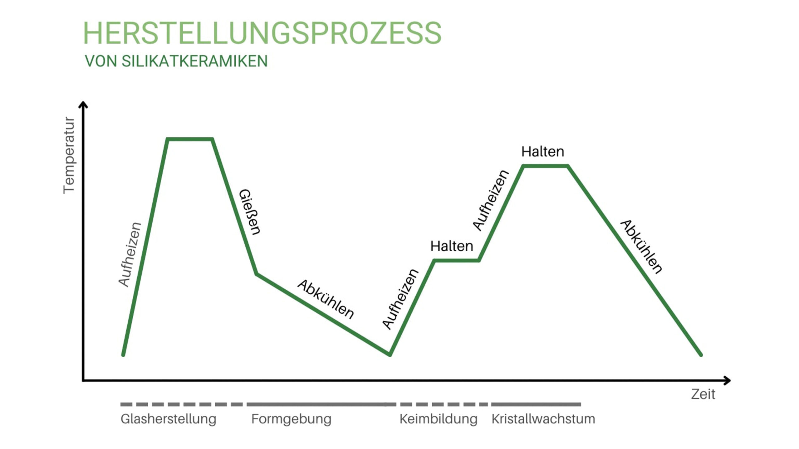 Der Prozess der Kristallisation lässt sich in Keimbildung und das Kristallwachstum einteilen. Keimbildung und das Kristallwachstum verlaufen als separate Prozesse getrennt voneinander ab, können sich allerdings überschneiden. Im Rahmen der Keimbildung erfolgt die Bildung erster, geordneter Strukturen. Um die Keimbildung zu initiieren, werden dem Grundglas Keimbildner, etwa TiO2 oder ZrO2, zugesetzt[14]. Die maximale Keimbildungsrate ist bei einer thermodynamisch definierten Temperatur TKB erreicht. TKB wiederum ist abhängig von zwei Phänomenen: Enthalpie sowie Diffusion. Zum einen nimmt die freie Enthalpie ΔG, welche die Triebkraft zur Keimbildung darstellt und sich aus der Differenz an freier Enthalpie zwischen den Gefügezuständen Kristall und Schmelze zusammensetzt, mit niedriger Temperatur bzw. zunehmender Unterkühlung zu. Demzufolge sollte mit sinkender Temperatur eine immer höhere Keimbildungsrate zu beobachten sein. Für die Keimbildung sind allerdings Atombewegungen notwendig, welche über Diffusion erfolgen. Somit handelt es sich bei der Keimbildung um einen diffusionskontrollierten Prozess. Die Diffusionsgeschwindigkeit der für die Keimbildung nötigen Komponenten innerhalb der Matrix steigt mit niedriger Viskosität und damit steigender Temperatur an[18–20]. Daraus ergibt sich, dass die Temperatur, zu welcher TKB erreicht ist, von beiden, gegenläufigen Prozessen abhängig ist und festgelegt wird. Sobald eine kritische Keimgröße erreicht ist, setzt das Kristallwachstum ein. Auch dieses zeigt sich sowohl von freier Enthalpie, als auch Diffusion abhängig. Somit erreicht die Kristallwachstumsgeschwindigkeit zu einer bestimmten, von beiden Faktoren abhängigen, Temperatur TKG ihr Maximum. Ähnlich wie bei der Keimbildung ist auch im Hinblick auf die Kristallisationsgeschwindigkeit bei niedrigen Temperaturen die Viskosität limitierend, welche die Diffusion erschwert. Bei hohen Temperaturen stellt die Enthalpie den limitierenden Faktor dar. Die Temperatur TKG, bei welcher die maximale Kristallwachstumsgeschwindigkeit auftritt, liegt im Temperaturbereich über TKB. Dass TKG über TKB liegt lässt sich dadurch erklären, dass es während des Prozesses der Keimbildung zum Umsatz von mehr Energie kommt. Darüber hinaus finden Diffusionsprozesse beim Kristallwachstum in geringerem Umfang statt. Aufgrund der unterschiedlichen Temperatur, zu welcher maximale Keimbildung bzw. Kristallisation auftritt, wird der Werkstoff einem zweistufigen thermischen Prozess unterzogen. Bei diesem erfolgt zunächst das Erhitzen auf Keimbildungstemperatur, welche anschließend für eine definierte Zeit gehalten wird, sodass es zur Ausbildung von möglichst vielen Kristallkeimen kommen kann, ohne dass es bereits zu nennenswertem Kristallwachstum kommt (Abb. 4). Im nächsten Schritt wird das Material auf Kristallwachstumstemperatur erhitzt, wobei sich an die zuvor entstandenen Keime Kristallgefüge anlagern. Der Anteil des Glases, welcher nicht Teil der Kristallformationen geworden ist, bildet die Restglasphase.