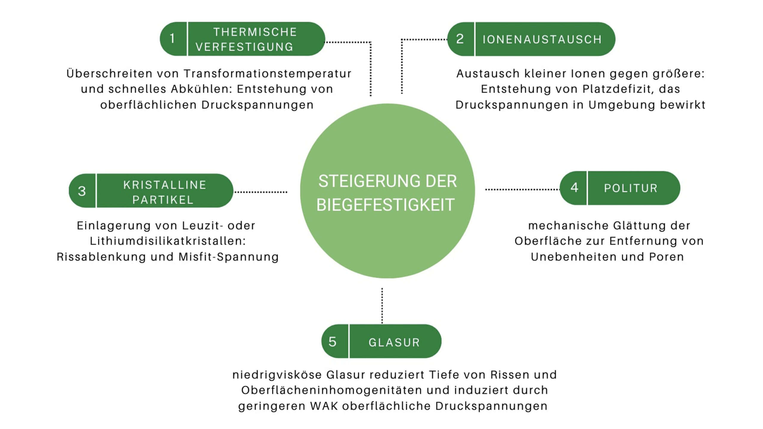 Es existieren Methoden, um die Entstehung von Mikrorissen und das daraus resultierende Versagen von keramischen Restaurationen zu vermeiden (Abb. 5). Da sich die Fertigung von Keramik ohne oberflächliche Gefügefehler als technisch schwierig darstellt, zielen einige Verfahren darauf ab, die Festigkeit der Keramik über eine Erzeugung von oberflächlichen Druckspannungen zu steigern und damit Rissentstehung und -ausbreitung entgegenzuwirken. Hintergrund hierbei ist, dass keramische Werkstoffe eine Druckfestigkeit haben, welche ihre Zugfestigkeit um den Faktor 4–30 übersteigt[34]. Zu erklären ist dies dadurch, dass Zugbelastungen Spannungsspitzen im Bereich der Rissenden verursachen, welche die Öffnung von Rissflanken und somit den Rissfortschritt befördern[35], wohingegen Druckspannung komprimierend auf Risse im Material wirkt und somit einen Rissfortschritt unterbindet. Eine Festigkeitssteigerung kann beispielsweise durch eine thermische Verfestigung erreicht werden, bei welcher die Keramik auf eine Temperatur oberhalb ihrer Transformationstemperatur gebracht wird. Im nächsten Schritt erfolgt ein rasches Abkühlen des Bauteils, wobei die oberflächlichen Areale zuerst erstarren, die langsam abkühlenden inneren Anteile jedoch währenddessen weiter kontrahieren. Durch diesen Vorgang kommt es zur Entwicklung von Zugspannung im Inneren sowie Druckspannungen im Bereich der Oberfläche. Die Druckspannungen im Bereich der Oberfläche, von wo aus die Rissbildung ihren Ursprung hat, machen die Keramik resistenter gegen Rissentstehung und fördern die Kompression von Rissflanken in diesem Bereich[36]. Eine weitere Möglichkeit stellt der Ionenaustausch dar. Die Festigkeitssteigerung der Keramik resultiert bei diesem Verfahren aus der Entstehung von Druckspannung innerhalb des Materials. Diese treten durch den Austausch kleinerer Ionen gegen Ionen mit größerem Radius im Temperaturbereich unterhalb der Transformationstemperatur auf, wobei sich ein Platzdefizit bildet, welches Druck auf die Umgebung ausübt[37]. Andererseits kann die Festigkeitssteigerung auch durch die Einlagerung von kristallinen Partikeln in die amorphe Glasmatrix gesteuert werden, wobei sich Anteil, Form und Ausrichtung sowie Größe der Kristalle auf die mechanischen Eigenschaften des Materials auswirken[38]. Hierbei trifft ein in der Glasmatrix fortschreitender Riss auf einen kristallinen Partikel, durch welchen der Riss entweder abgelenkt oder aufgehalten werden kann[15]. Es erfolgt auf diese Weise beim Auftreffen auf die kristalline Struktur eine elastische Dämpfung, durch welche Energie, die im Rahmen des Bruchvorgangs notwendig ist, verringert oder erschöpft wird. Je kleiner die eingelagerten Kristalle sind, je größer die Dichte und je homogener ihre Verteilung, desto höher fällt der Zuwachs an Festigkeit aus[39]. Sofern eingelagerte Kristalle darüber hinaus einen Wärmeausdehnungskoeffizienten ausweisen, welcher sich von dem der Glasmatrix unterscheidet, so kann auch über diesen Mechanismus die Festigkeit der Keramik erhöht werden. Leuzitkristalle beispielsweise weisen einen höheren Wärmeausdehnungskoeffizienten auf, als die umgebende Glasmatrix, was dazu führt, dass die Leuzitkristalle im Rahmen des Abkühlungsvorgangs stärker kontrahieren als die umgebende Glasmatrix. Dies wiederum führt zur Entstehung von Druckspannungshöfen, sogenannten Misfit-Spannungen im Bereich um die Leuzitkristalle, welche sich ausbreitende Risse ablenken[40]. Zum anderen ist die Festigkeit einer Keramik von ihrer Oberflächenbeschaffenheit, also der Anzahl vorhandener Defekte, Poren oder Mikrorisse, abhängig[41]. Daher stellen weitere Herangehensweisen, mit welchen eine Festigkeitssteigerung erreicht werden kann, das mechanische Schleifen und Polieren[42] sowie die Applikation einer Glasurmasse zur Beseitigung bzw. Minimierung von oberflächlichen Inhomogenitäten dar.