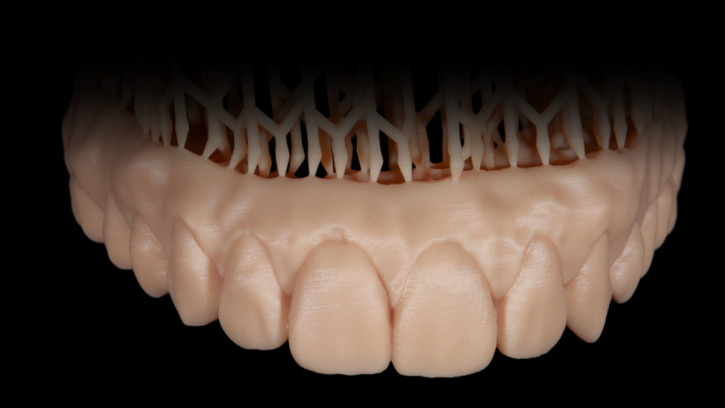 1. Drucken des Prototyps mithilfe eines 3-D-Druckers (Abb. 3): Obwohl es sich dabei um eine wirtschaftlich kostengünstige Methode handelt, lässt der gedruckte Prototyp im Vergleich zum gefrästen keine richtige Vorstellung hinsichtlich des definitiven, dann gefrästen Zahnersatzes zu.