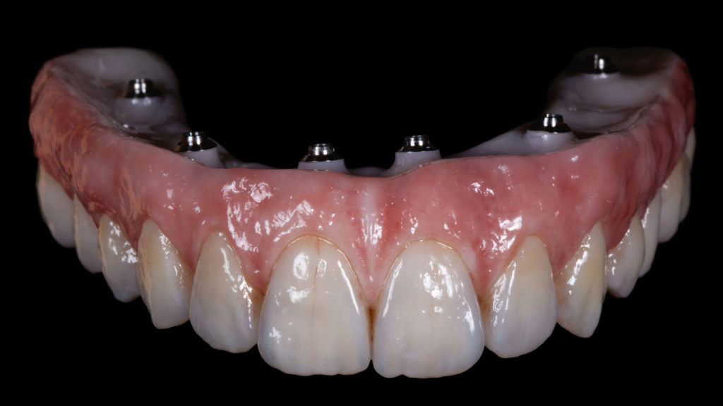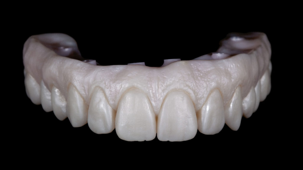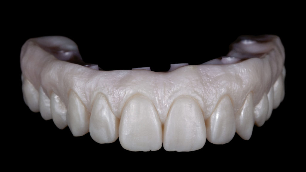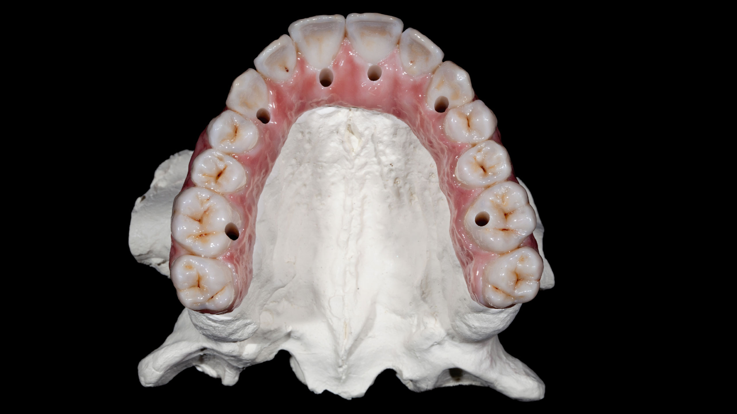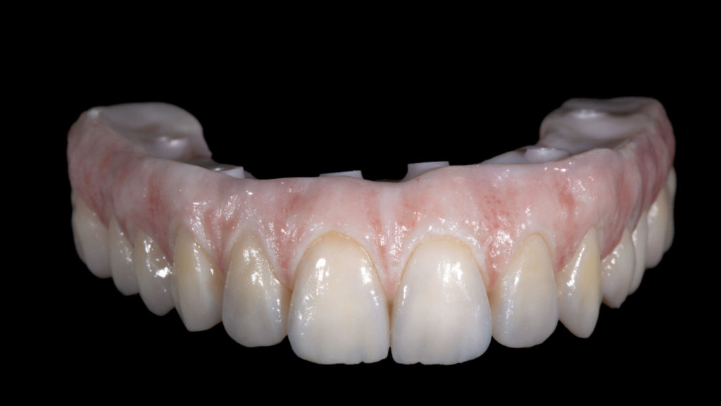 Exemplarisch wurde eine Oberkieferschauarbeit nach dem bekannten All-on-6-Konzept ausgewählt. Anhand dieser Versorgungsart soll gezeigt werden, wie sich der angedeutete, neue Weg darstellt. Mit derartigen Restaurationen müssen viele anatomische Merkmale wie die Rekonstruktion der roten und weißen Gewebe berücksichtigt und beherrscht werden. Zudem ist man hinsichtlich einer individuellen Zahnstellung und Zahnfarbe etwas freier in seiner Gestaltung. Und trotz oder gerade deshalb stellt es immer eine große Herausforderung dar, solche Brücken zu konstruieren und fertigzustellen und dabei die hohen ästhetischen Ansprüche zu erfüllen und gleichzeitig die geforderte Langlebigkeit zu erfüllen.
