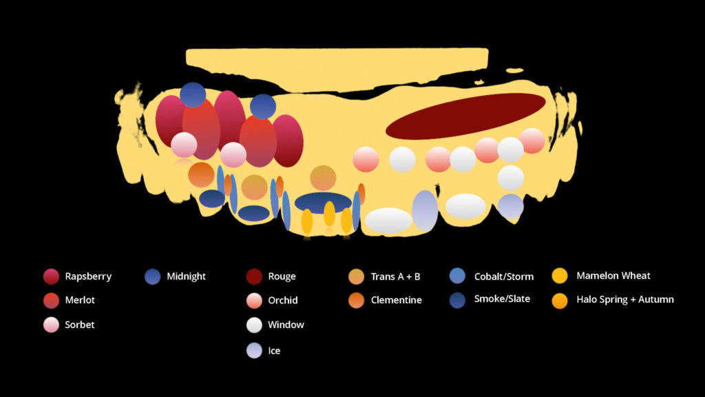 Der Auftrag der Grundfarbe, das Setzen von Akzenten und die Imitation transparenter Zonen erfolgen in mehr oder weniger als drei Bränden. Das Weichgewebe kann mit den MiYO pink-Massen reproduziert werden. Dazu zählen eine Vielzahl an Farben, wie etwa Trans Raspberry, Trans Cooper oder Trans Midnight.