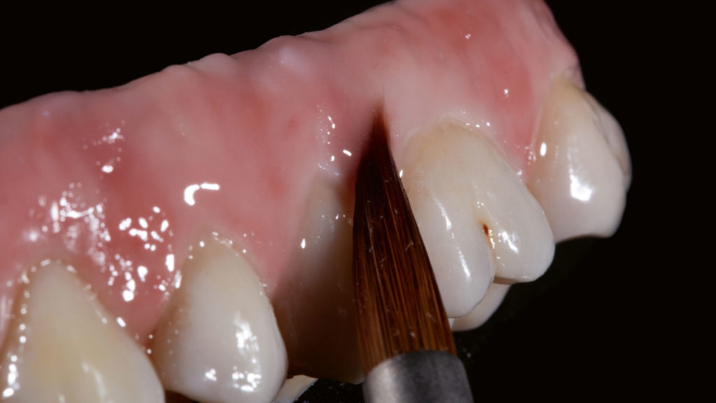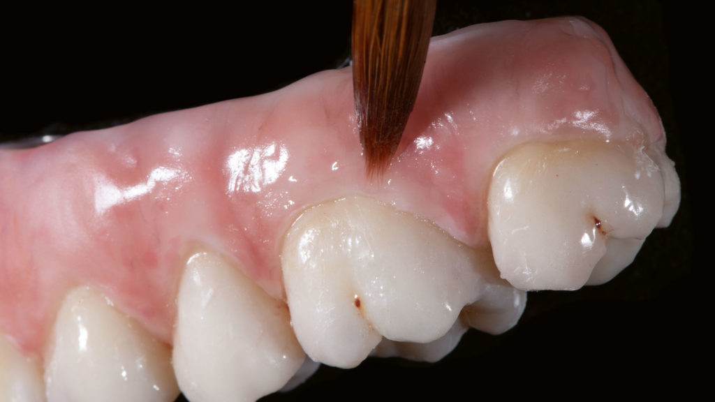 Die Reproduktion des künstlichen Zahnfleischs erfordert viel Aufmerksamkeit und etwas Mühe. Und falls das Ergebnis die hohen Ansprüche nicht erfüllen sollte, so ist es möglich, notwendige Korrekturen ohne Farb- und Qualitätsverlust bei niedrigeren Temperaturen vorzunehmen.