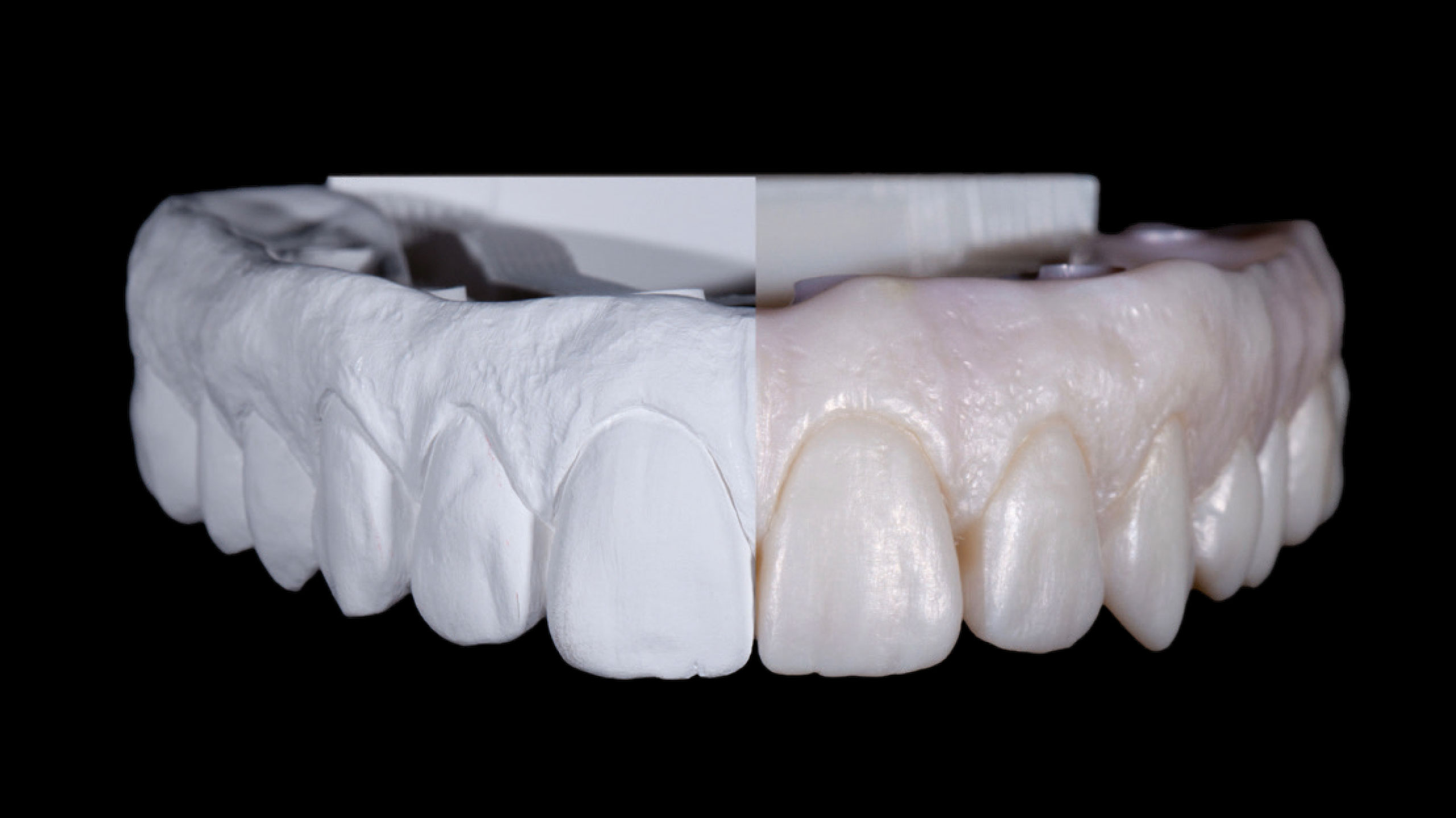 Die Reproduktion des künstlichen Zahnfleischs erfordert viel Aufmerksamkeit und etwas Mühe. Und falls das Ergebnis die hohen Ansprüche nicht erfüllen sollte, so ist es möglich, notwendige Korrekturen ohne Farb- und Qualitätsverlust bei niedrigeren Temperaturen vorzunehmen.