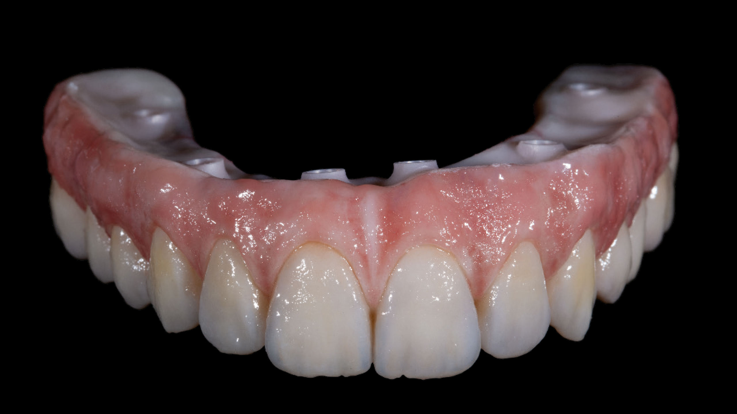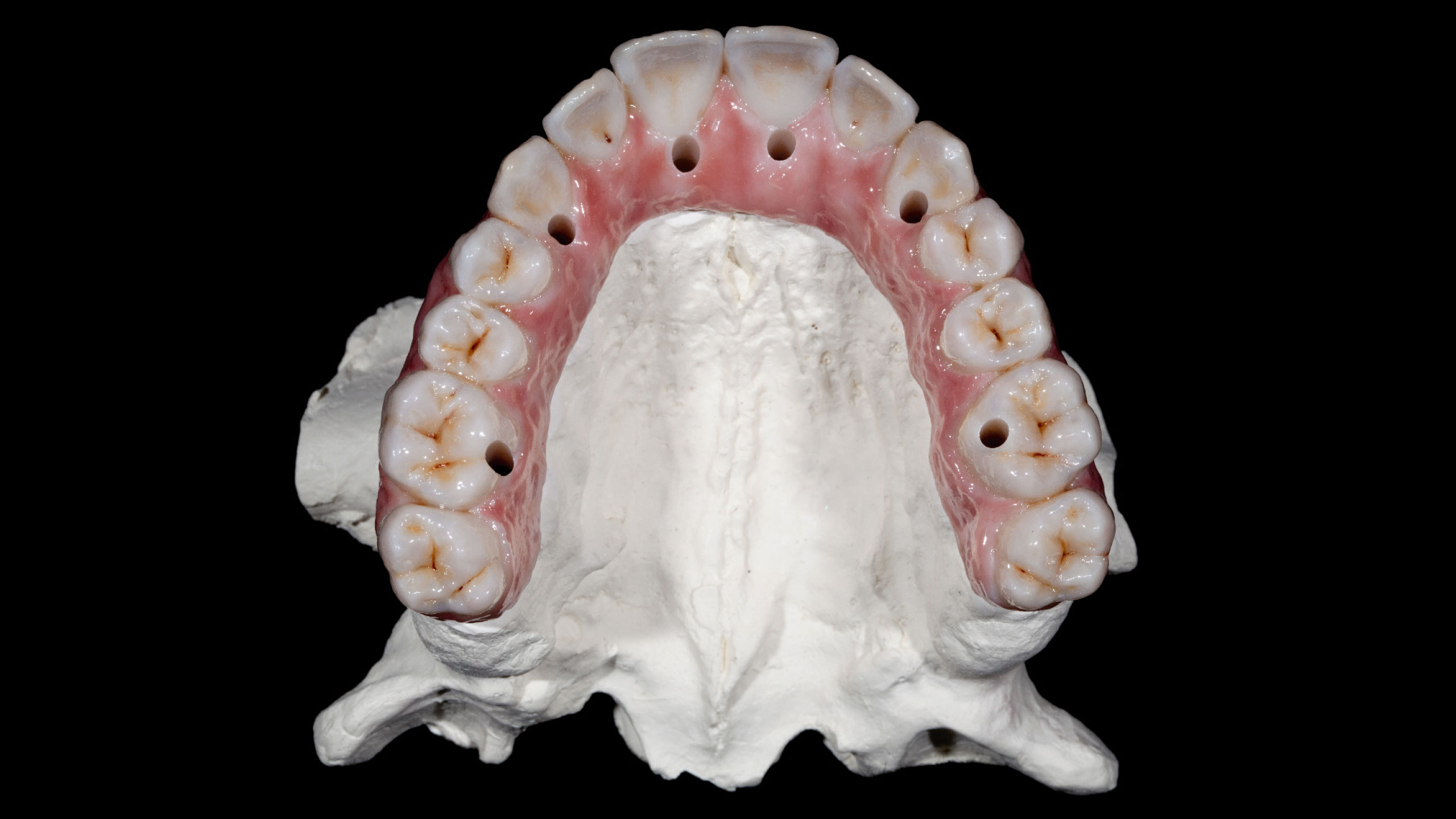 Exemplarisch wurde eine Oberkieferschauarbeit nach dem bekannten All-on-6-Konzept ausgewählt. Anhand dieser Versorgungsart soll gezeigt werden, wie sich der angedeutete, neue Weg darstellt. Mit derartigen Restaurationen müssen viele anatomische Merkmale wie die Rekonstruktion der roten und weißen Gewebe berücksichtigt und beherrscht werden. Zudem ist man hinsichtlich einer individuellen Zahnstellung und Zahnfarbe etwas freier in seiner Gestaltung. Und trotz oder gerade deshalb stellt es immer eine große Herausforderung dar, solche Brücken zu konstruieren und fertigzustellen und dabei die hohen ästhetischen Ansprüche zu erfüllen und gleichzeitig die geforderte Langlebigkeit zu erfüllen.