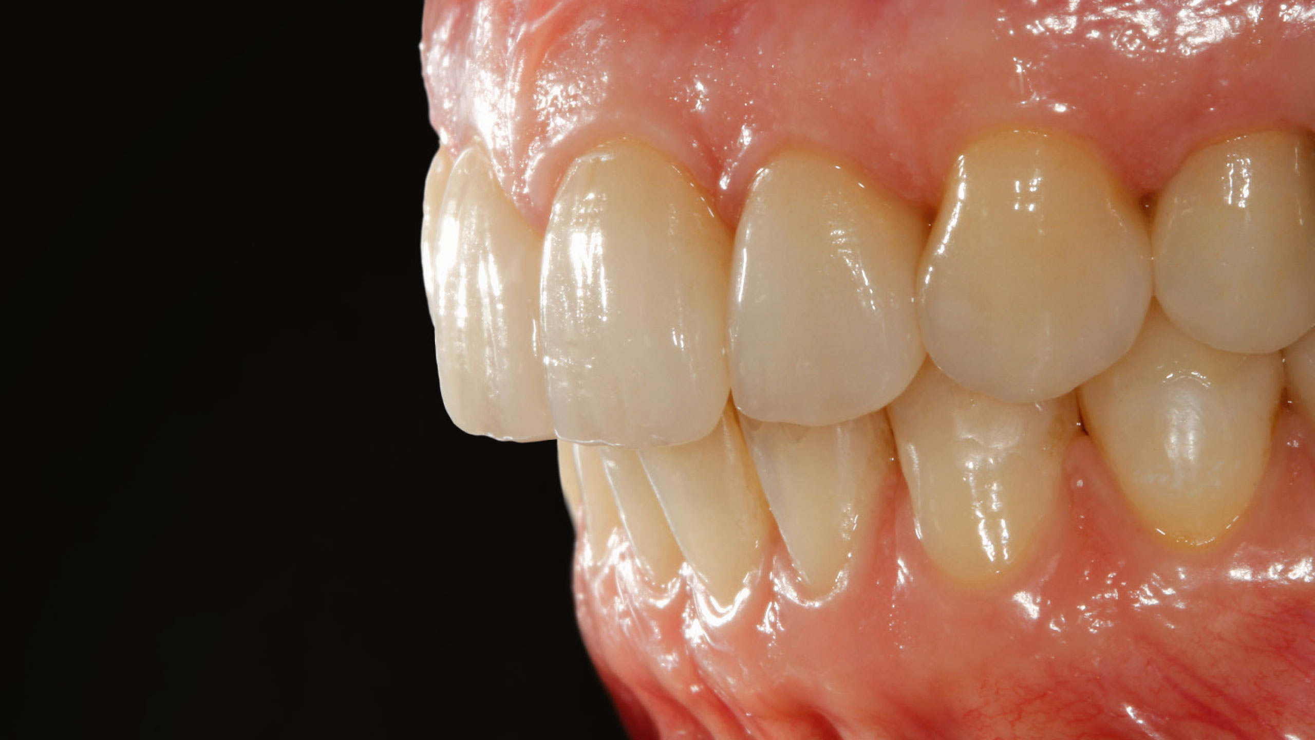 Die Indikationsgebiete von keramischen Veneers haben die Grenze einer rein ästhetisch begründeten Therapie längst überschritten. Aufgrund der Weiterentwicklungen in den Bereichen der keramischen Materialien sowie der Adhäsivtechnik werden Veneers heute oft im Rahmen einer restaurativen Therapie eingesetzt, zum Beispiel Repositionsveneers. Dazu zählt beispielsweise die Abschlussbehandlung funktionstherapeutischer Maßnahmen. Selbstverständlich ist es nicht das generelle Ziel einer funktionstherapeutischen Behandlung, eine restaurative Therapie anzuschließen. Allerdings ist dies als Folgebehandlung in einigen Indikationen nicht auszuschließen, zum Beispiel bei einem erheblichen Verlust von Zahnsubstanz infolge von Biokorrosion oder Bruxismus. Ist nach der erfolgreichen Funktionstherapie eine gleichmäßige okklusale Abstützung nicht gegeben, wird eine restaurative Abschlussbehandlung notwendig. Dafür können nach einer minimalinvasiven Präparation prothetische Restaurationen auf dem Zahn befestigt werden. Eine Alternative mit gewissen Einschränkungen wäre das Tragen einer Okklusionsschiene (Abb. 1).