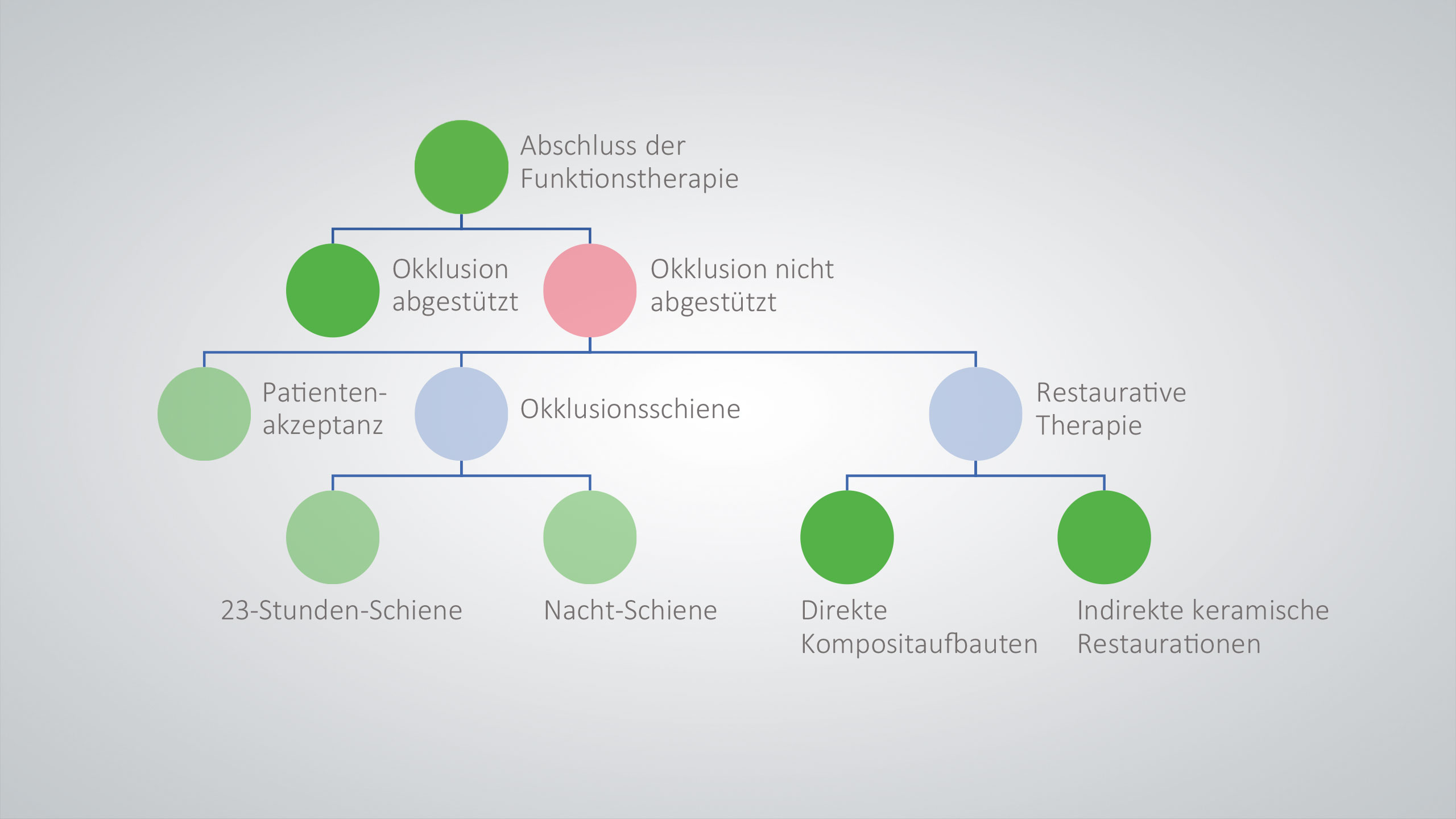 Die irreversible Maßnahme (prothetische Restaurationen) erfordert im Vorfeld eine Funktionsdiagnostik sowie die initiale Funktionstherapie, bei der die angestrebte okklusale Veränderung mittels reversibler Maßnahmen (Schiene, Langzeitprovisorium) simuliert wird. Die dauerhafte Stabilisierung der Situation durch keramische Restaurationen wie Veneers beziehungweise Onlays wird mit der Intention eines möglichst geringen Zahnhartsubstanzabtrags realisiert. Als Restaurationsmaterial wird von den Autoren eine hochfeste Glaskeramik favorisiert. Die klinische Bewährung und die Überlebensdauer dieser funktionsstabilisierenden Maßnahme sind belegt [1, 2].
