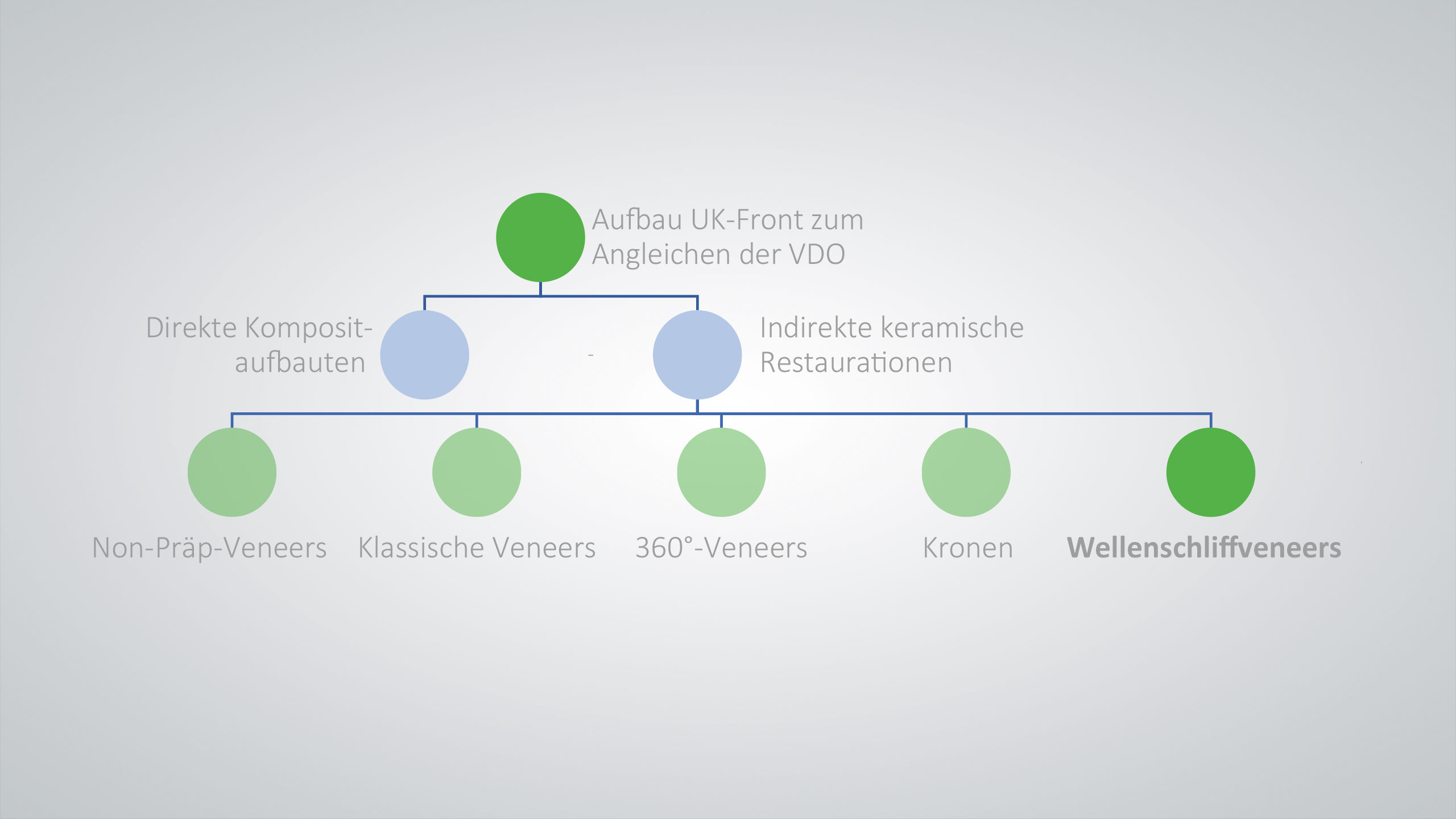 - Vorteil: geringerer Substanzabtrag als bei klassischen Veneers; form-, farb- und oberflächenstabil; eindeutige Positionierbarkeit während der Herstellung sowie bei der adhäsiven Befestigung; Präparationsränder im oberen Zahndrittel (fern der Gingiva) sowie komplett im Schmelz (hohe Haftwerte); gutes Farbmanagement zwischen Zahn und Veneer (Präparation als Wellenschliff ist optisch schwieriger wahrzunehmen)
