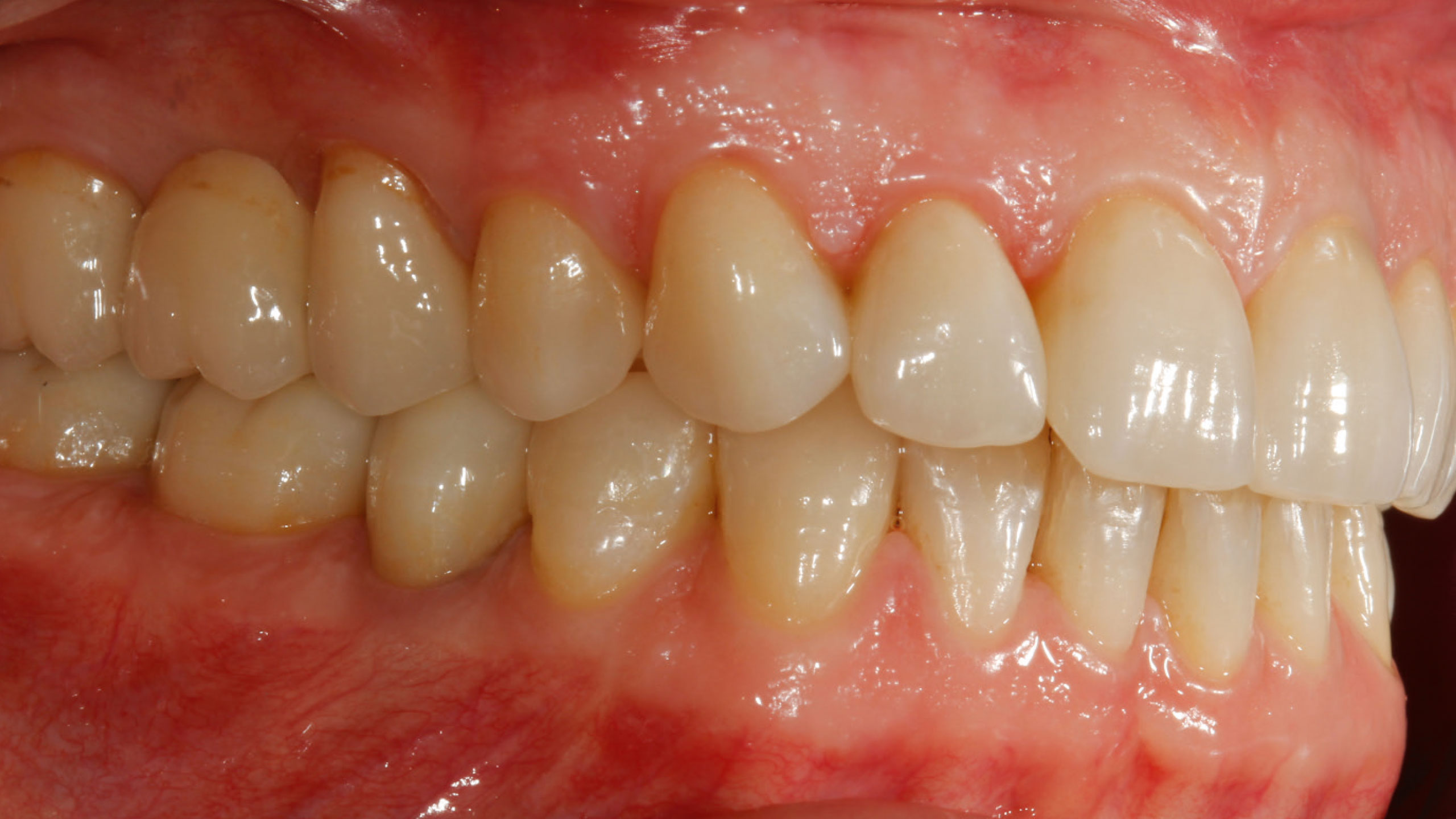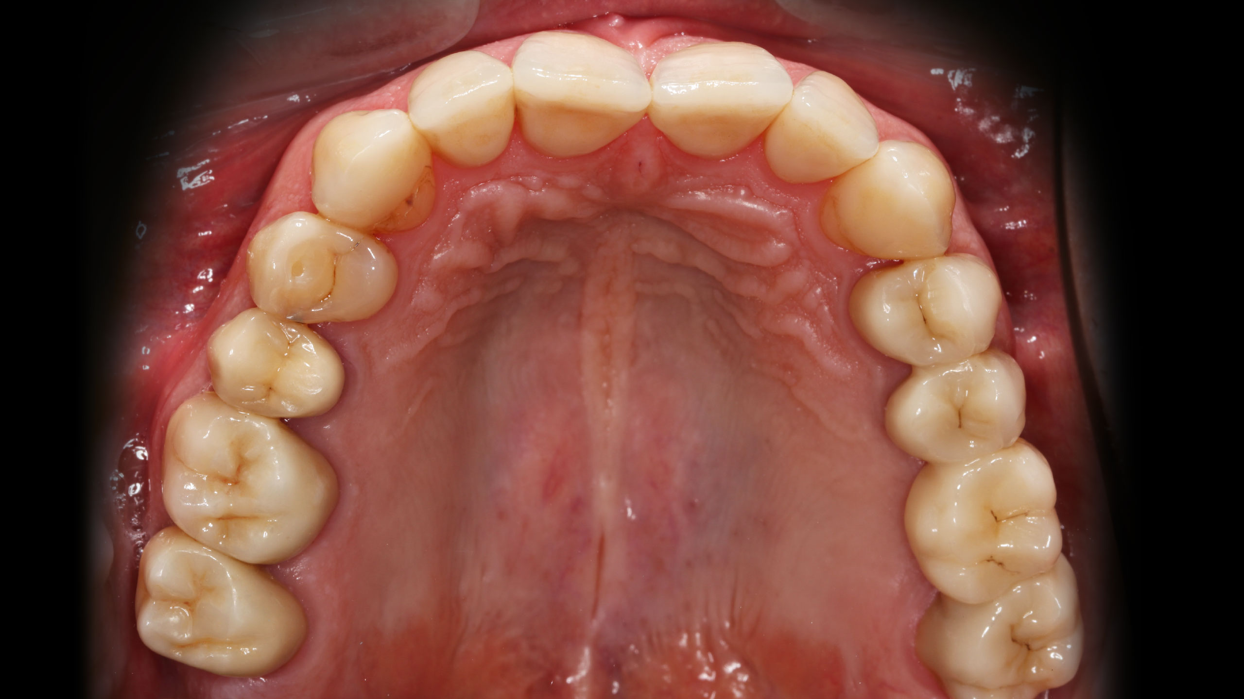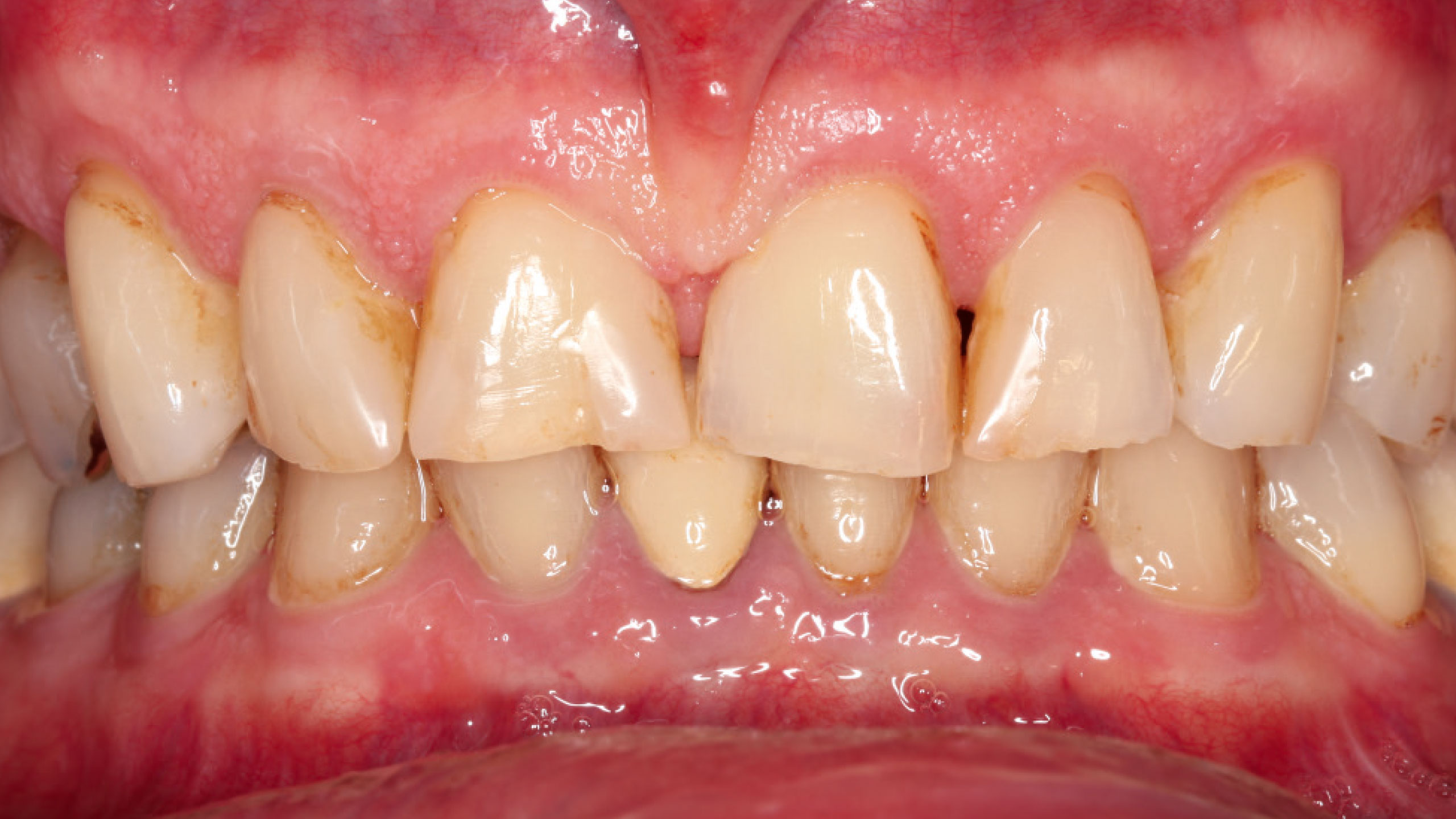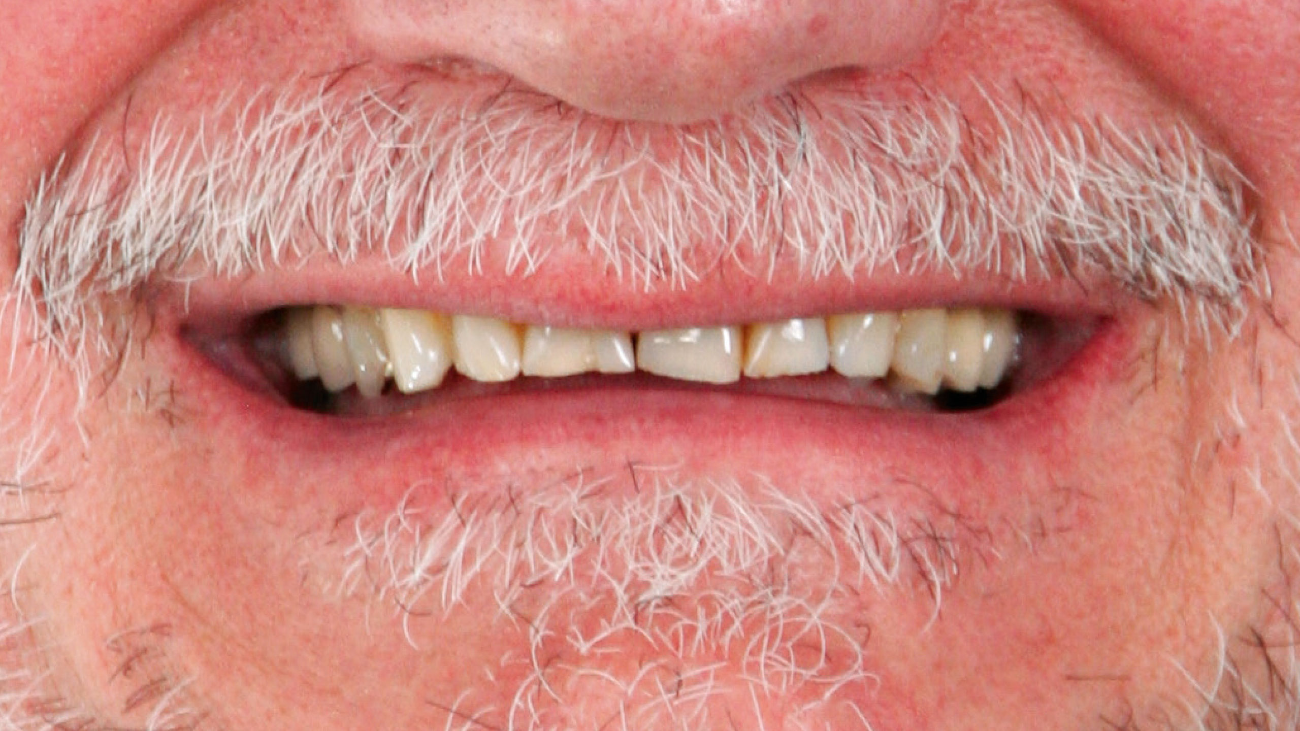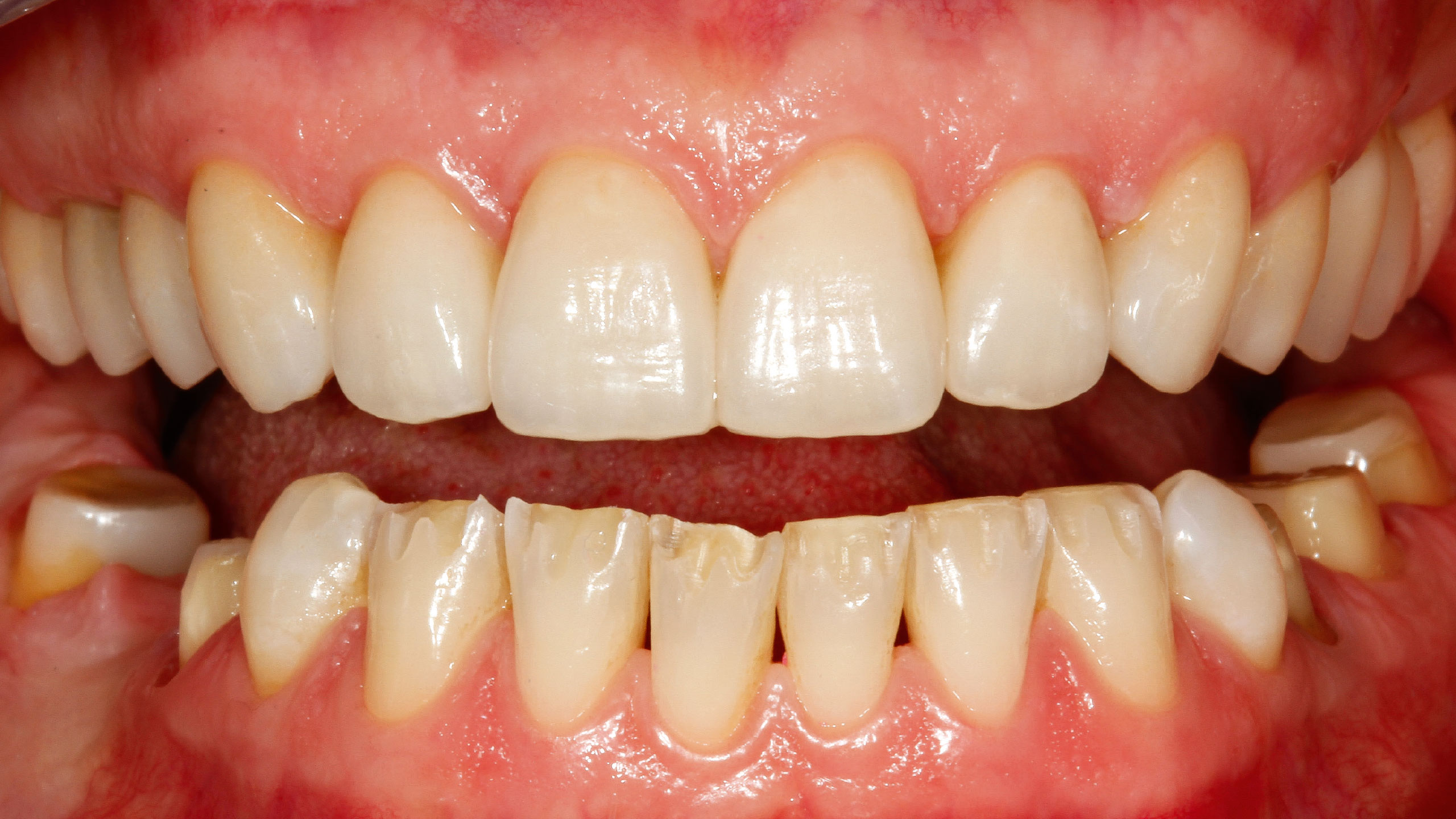 Auch dieser Patient hatte eine stark abgesenkte vertikale Bisshöhe (Abb. 26). Mit einer funktionalen Initialtherapie mittels Schiene im Unterkiefer wurde eine neue Bisshöhe validiert. Nach Akzeptanz der Bisslage erfolgte die prothetische Rehabilitation, wobei erneut in zwei Phasen vorgegangen wurde. Die während der Initialphase erarbeitete Bisslage sollte mit keramischen Restaurationen dauerhaft stabilisiert werden. Im Oberkiefer sollten dafür die Zähne 15 bis 17 mit einer Brücke, 14 mit einer Krone und 24 mit einer Teilkrone versorgt werden. Für die Frontzähne waren 360°-Veneers geplant, um auch die Palatinalflächen aufbauen zu können.