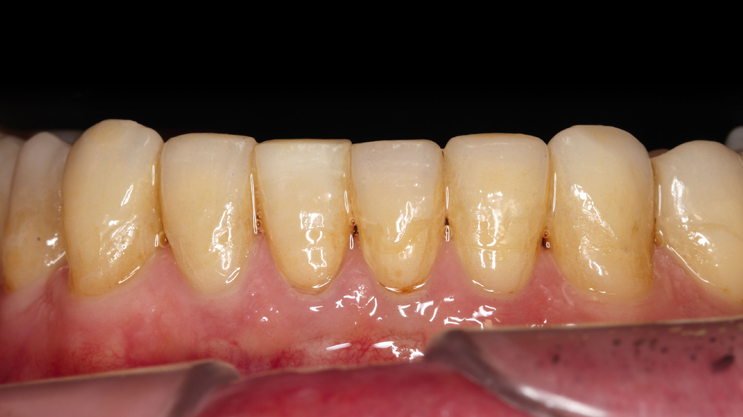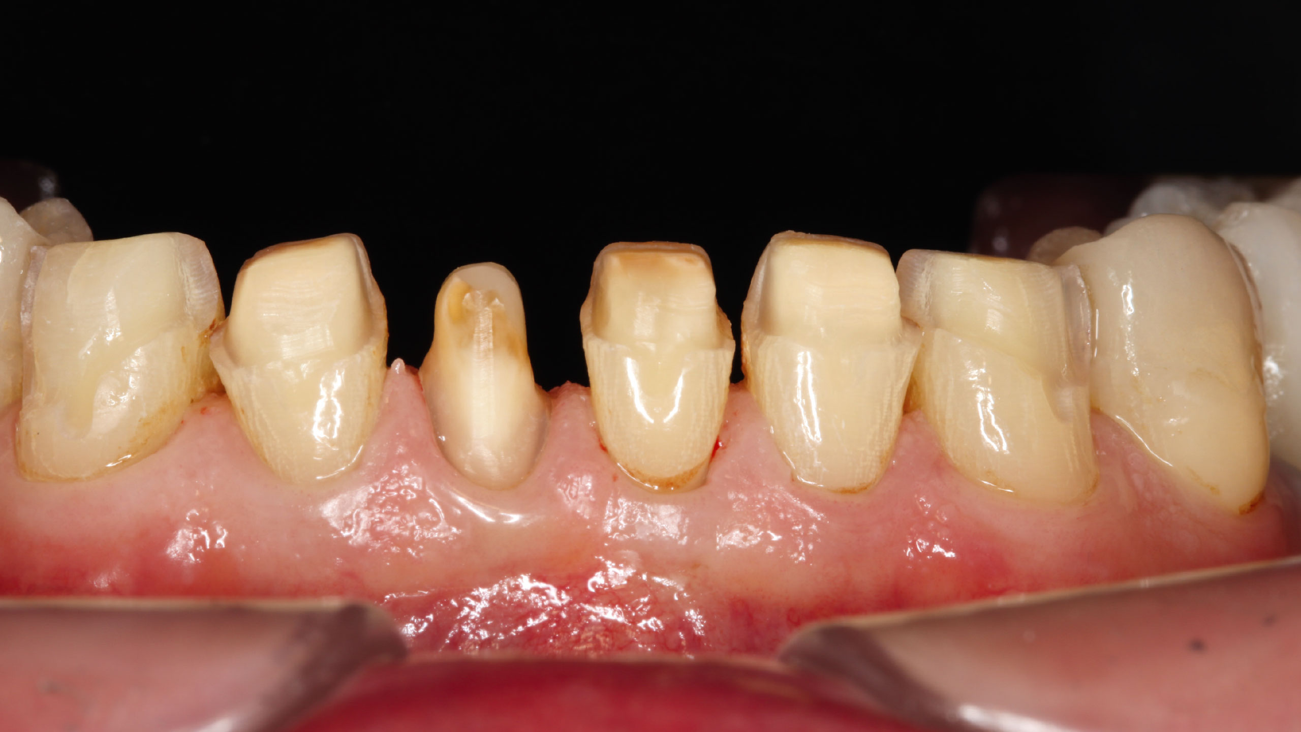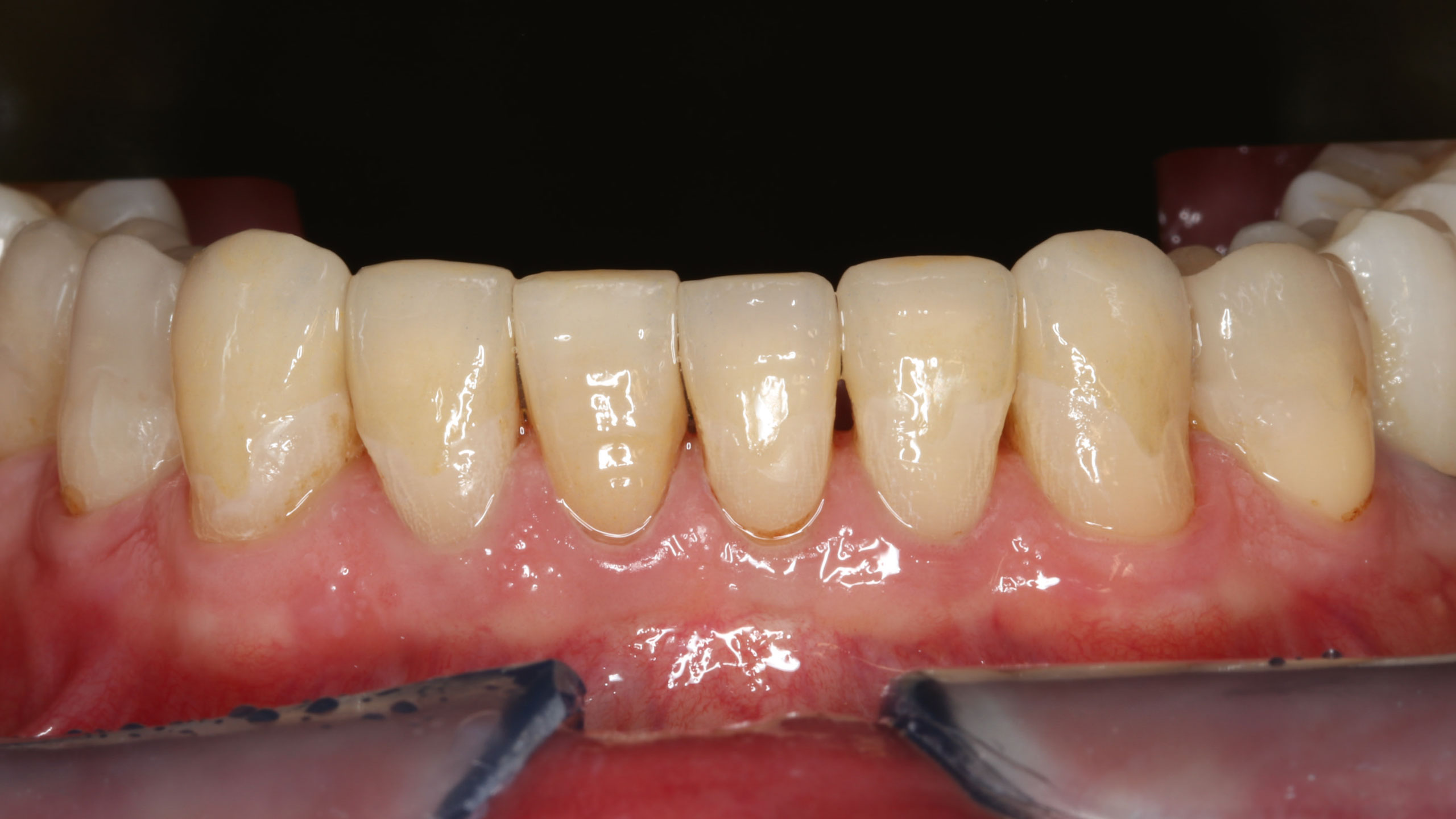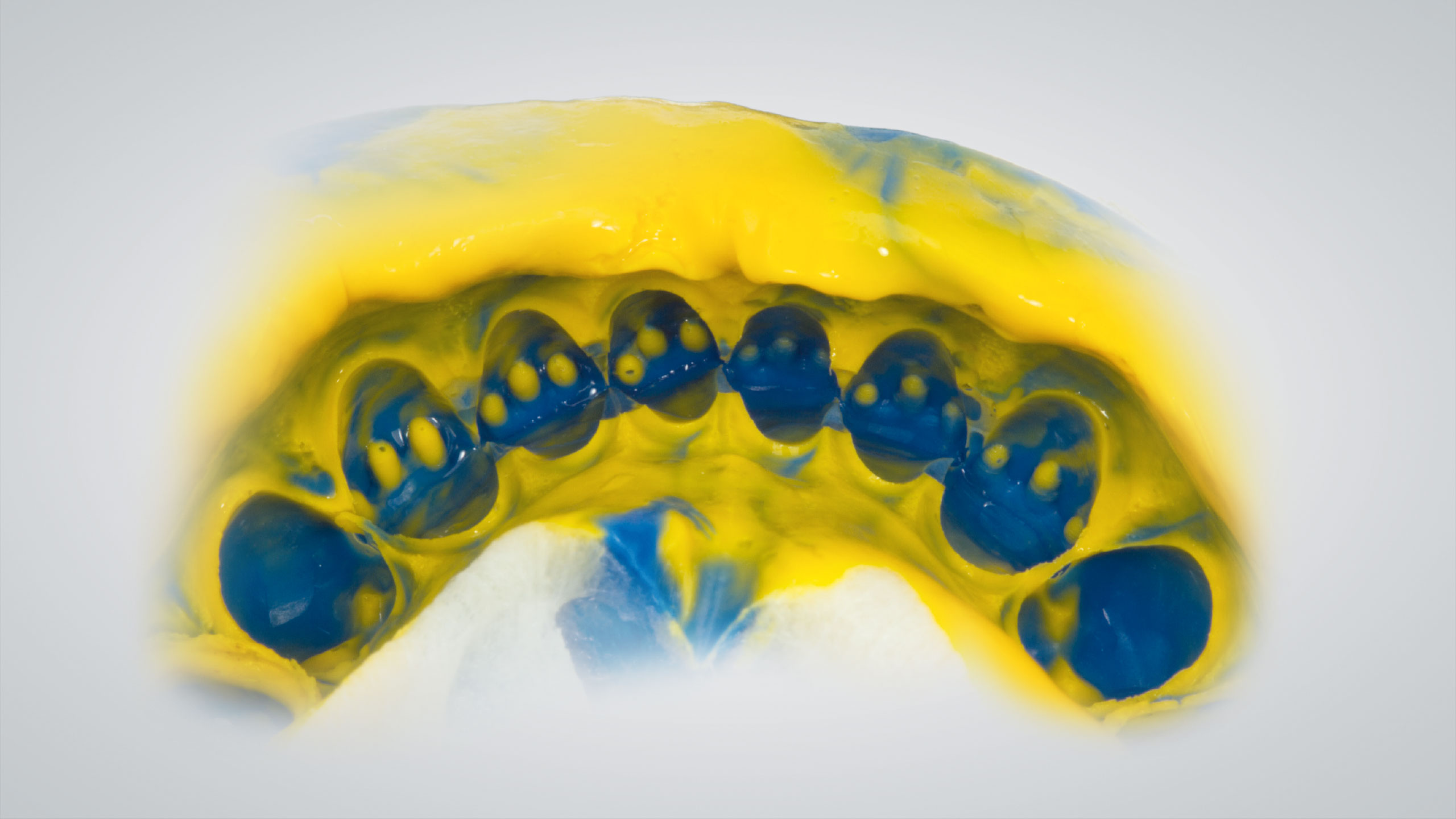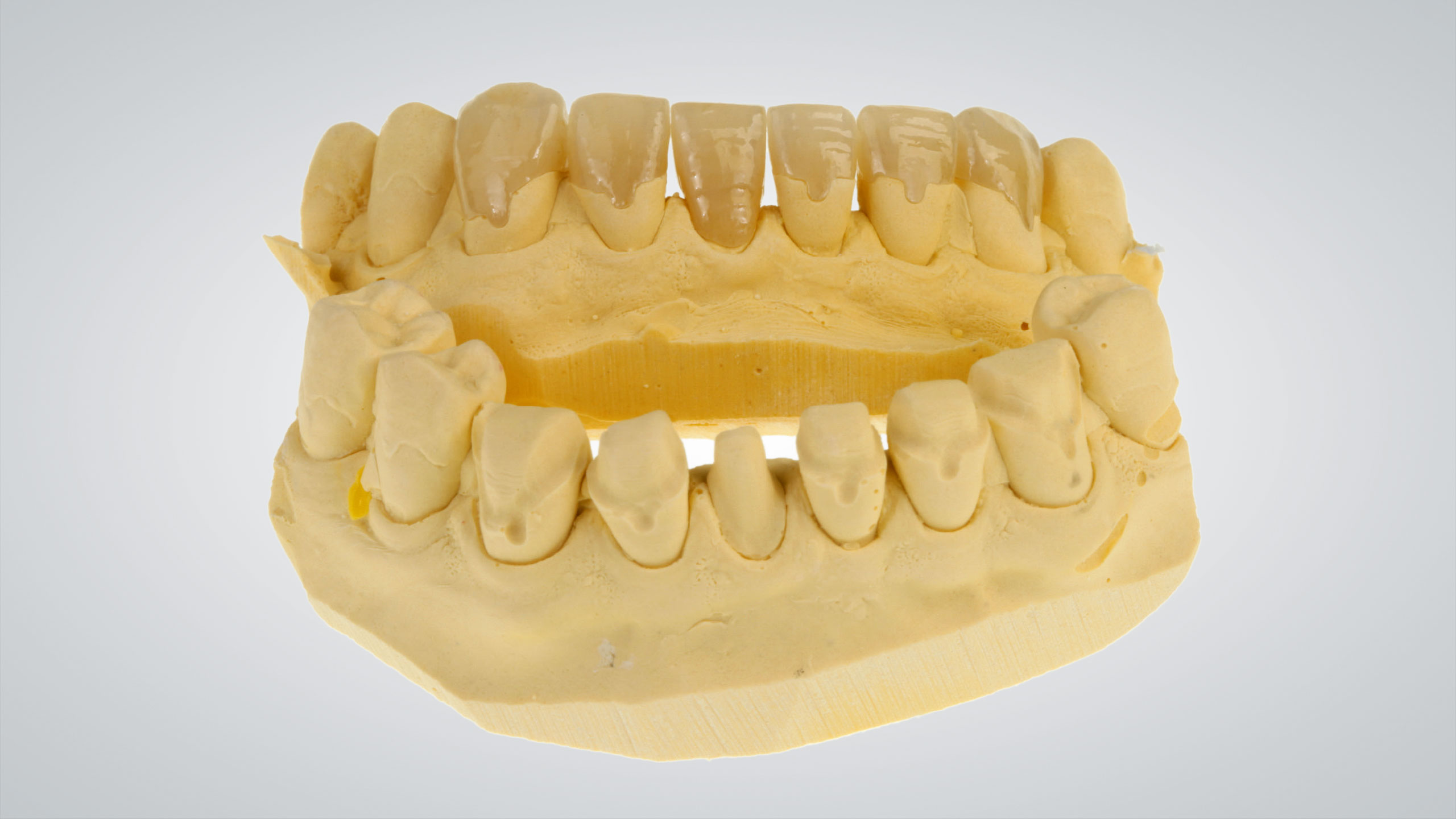 Bei der Patientin wurde über eine funktionelle Initialtherapie die neue vertikale Bisshöhe mittels Schiene über einen Zeitraum von sechs Monaten etabliert (Abb. 4). Für den Aufbau der Zähne zum dauerhaften Stabilisieren der VDO waren keramische Restaurationen geplant. Im ersten prothetischen Therapieschritt sollten die Zähne im Oberkiefer versorgt werden. Dafür wurden alle Zähne präpariert, wobei ein substanzschonendes Vorgehen im Fokus stand. Im Seitenzahngebiet sollten eine Brücke (25 auf 27) und ansonsten Einzelkronen gefertigt werden. Die Oberkiefer-Frontzähne wurden für die Aufnahme von 360°-Veneers präpariert, da aufgrund der Bisshebung auch die palatinalen Bereiche in die Restauration eingebunden werden mussten. Um die validierte Bisshöhe zu stabilisieren, erhielt die Patientin nach der Präparation im Oberkiefer beziehungsweise dem Einsetzen der provisorischen Versorgung die Schiene im Unterkiefer wieder eingegliedert. Im Labor wurden vollkeramische Restaurationen aus Lithiumdisilikat angefertigt und zugleich die noch nicht präparierten Zähne im Unterkiefer additiv aufgebaut. Es wurde eine Art „Deckel“ aus Komposit in entsprechender Morphologie und Bisshöhe angefertigt. Unmittelbar nach der adhäsiven Eingliederung der keramischen Restaurationen im Oberkiefer konnten diese temporären Versorgungen ohne Präparation auf den unteren Zähnen befestigt werden. Die Patientin erhielt so die Möglichkeit, die Situation – die neue VDO – nochmals zu testen, nun bereits mit neu versorgtem Oberkiefer. Im zweiten prothetischen Therapieschritt wurden die Zähne im Unterkiefer präpariert. Im Frontzahnbereich (Zähne 34 bis 44) kam der Pfullinger Wellenschliff zur Anwendung (Abb. 5). Die Vorteile dieser Präparationsart in diesem Fall waren die geringe Invasivität, das vereinfachte Handling bei der Herstellung der Frontzahnveneers sowie deren Eingliederung. Aufgrund des reduzierten Präparationsdesigns musste nur in den vestibulären Bereichen Substanz abgetragen werden. Der Wellenschliff erfordert Fingerspitzengefühl und Präzision – ein geringer zeitlicher Mehraufwand, der sich jedoch aufgrund der Vorteile, die diese Präparationsart mit sich bringt, lohnt. Im Seitenzahnbereich wurden die Zähne für die Aufnahme einer Brücke von Zahn 45 auf Zahn 47 sowie für Kronen und Teilkronen von 35 bis 37 vorbereitet. Nach einer Überabformung (Abb. 6) wurde die Grundzahnfarbe als Basis für die Rohlingauswahl bestimmt (Abb. 7).