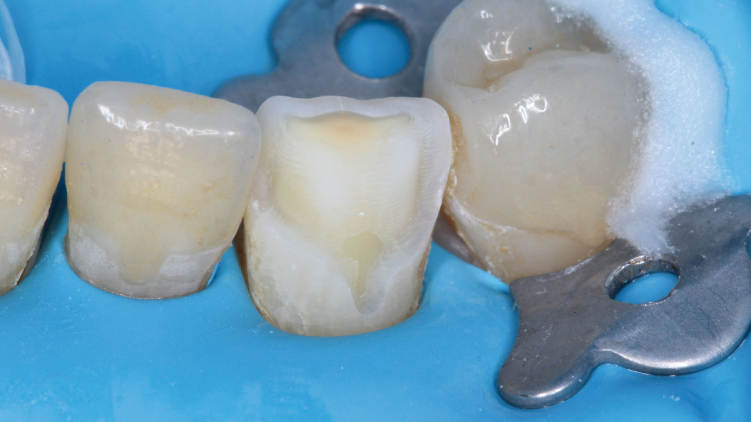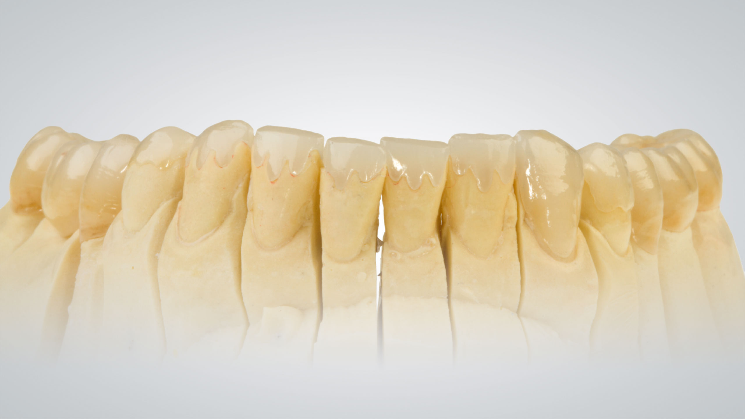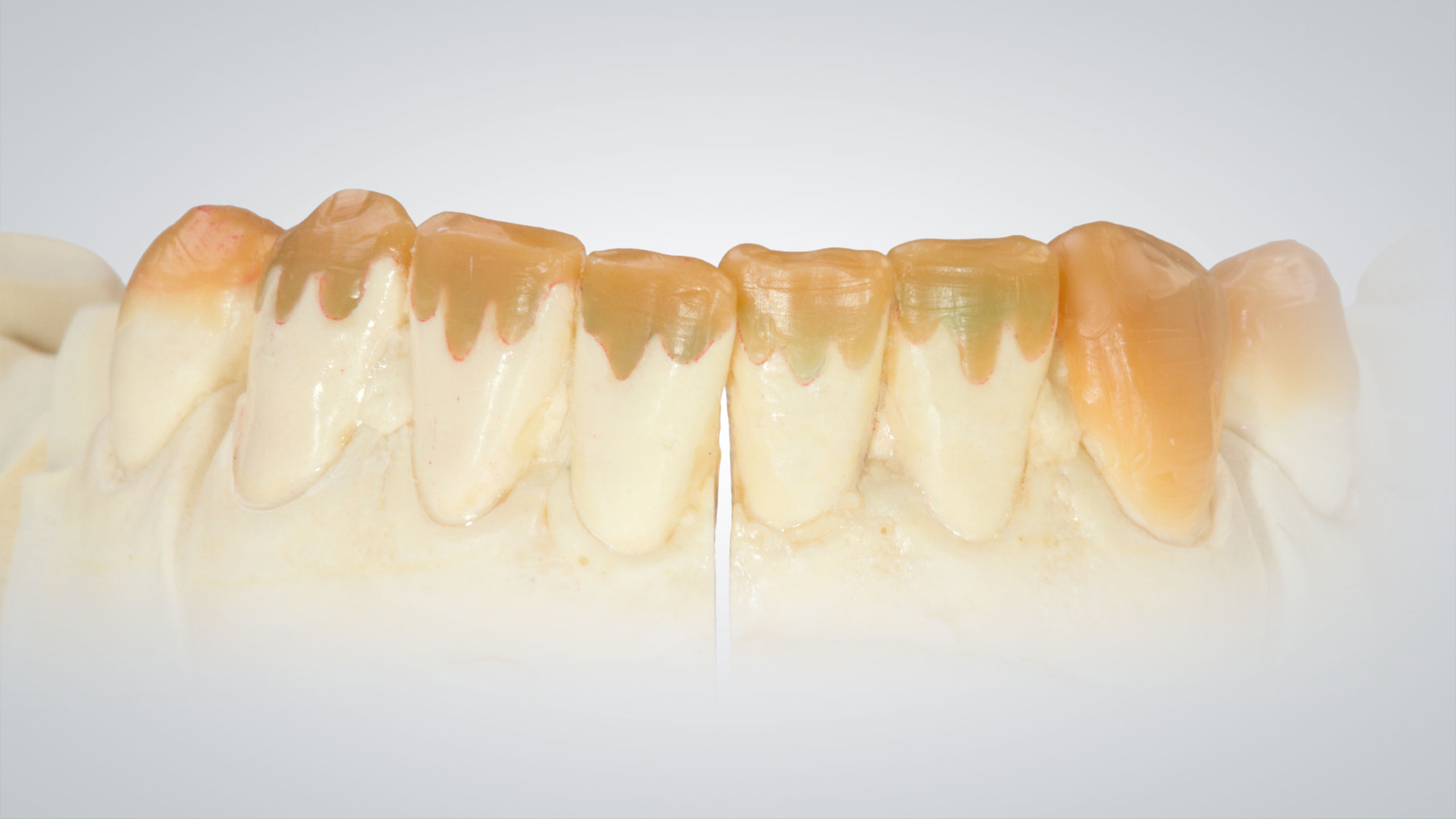 - Vorteil: form-, farb- und oberflächenstabil; eindeutige Positionierbarkeit während der Herstellung sowie bei der adhäsiven Befestigung; gutes Farbmanagement; Möglichkeit, die Grundfarbe des Pfeilerzahns zu kaschieren