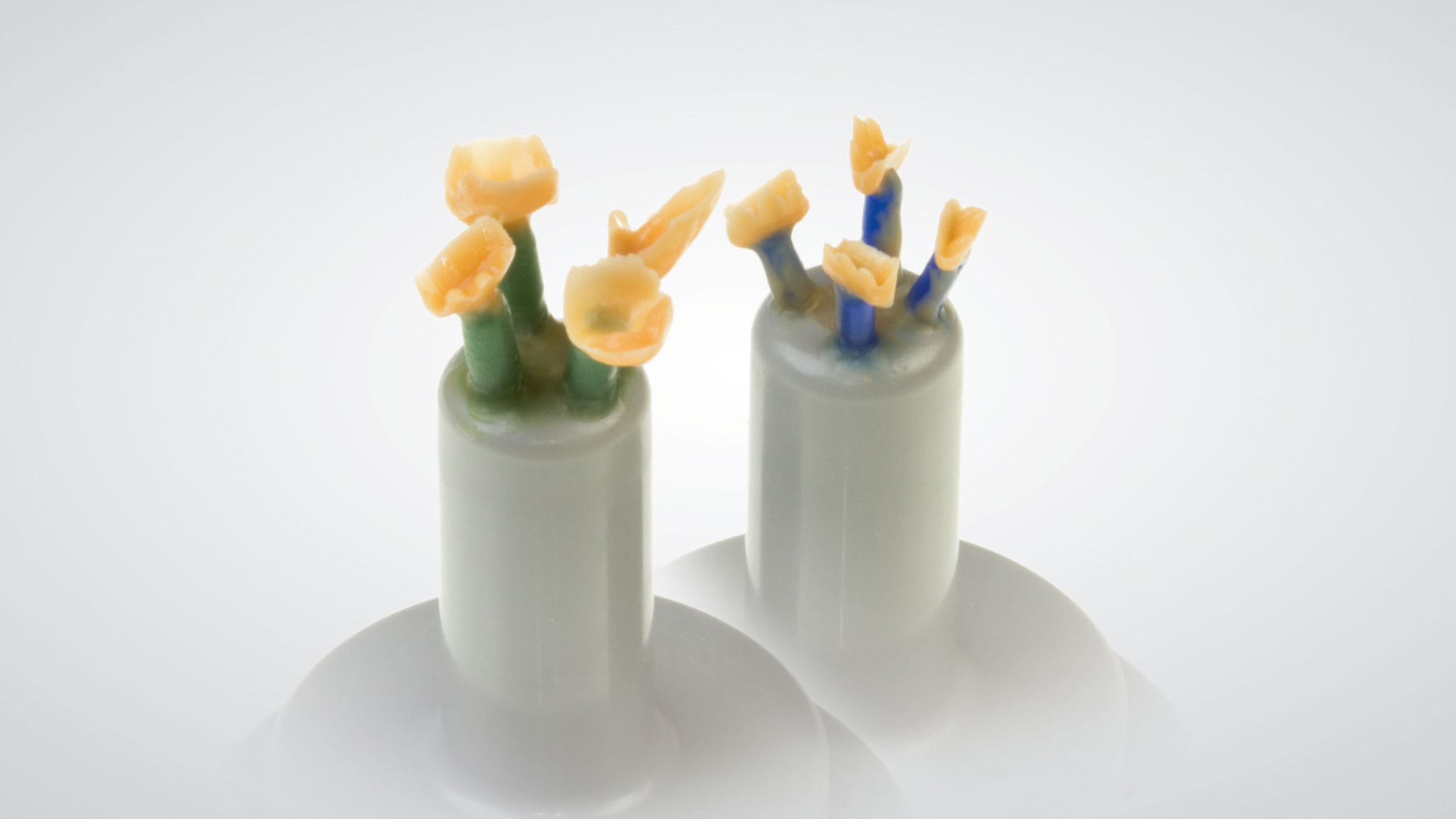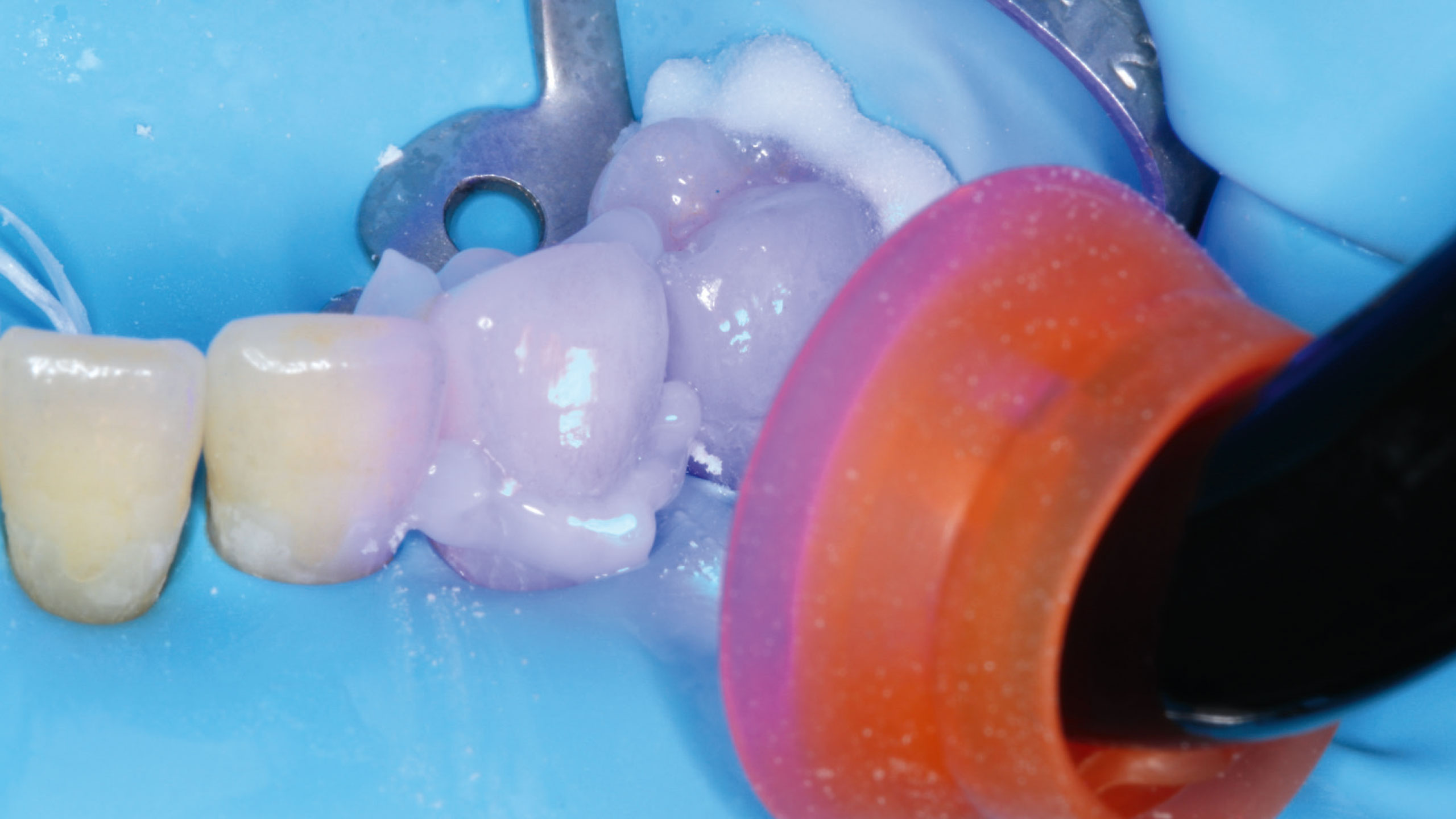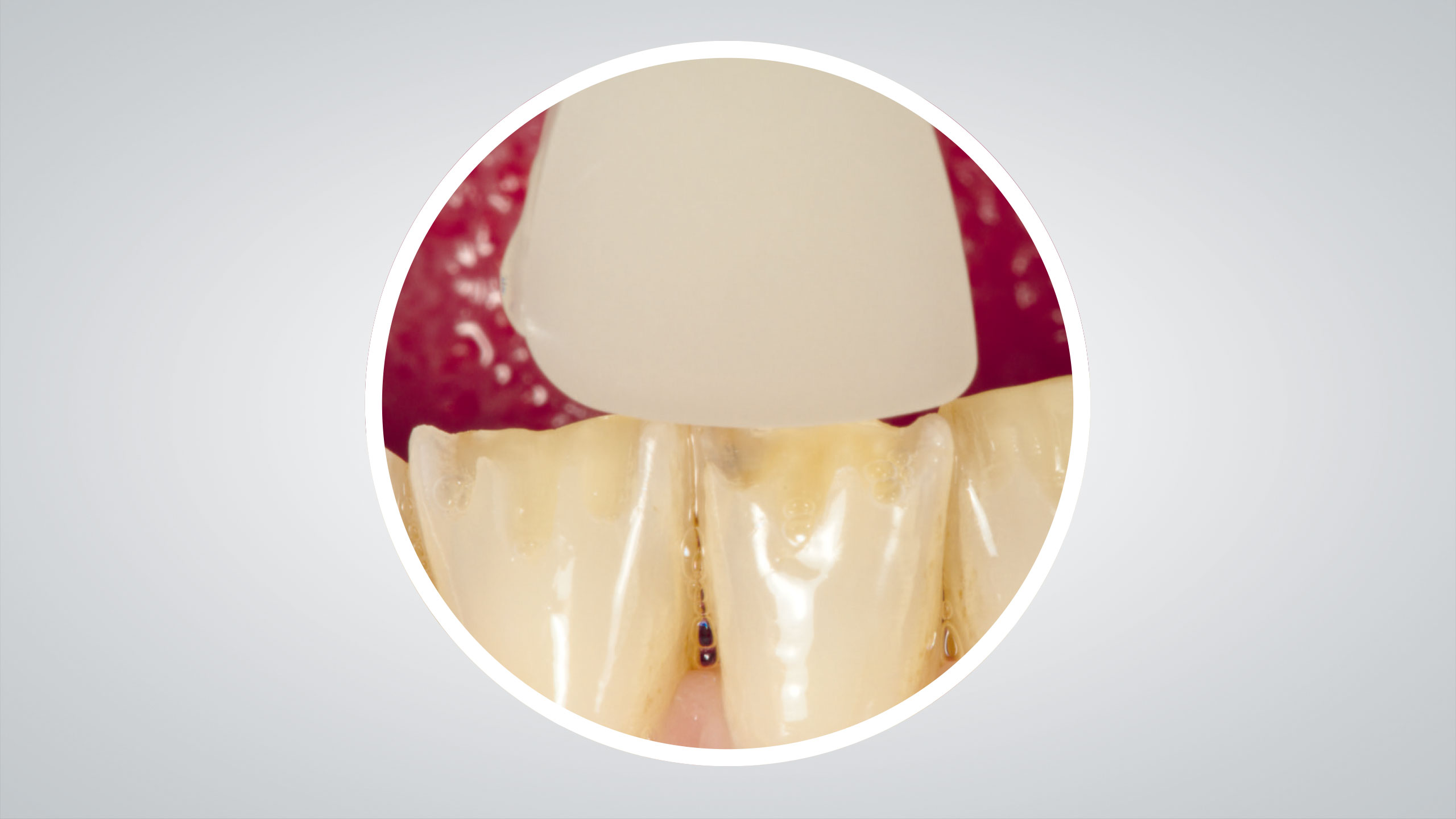 - Vorteil: form-, farb- und oberflächenstabil; eindeutige Positionierbarkeit während der Herstellung sowie bei der adhäsiven Befestigung; gutes Farbmanagement; Möglichkeit, die Grundfarbe des Pfeilerzahns zu kaschieren