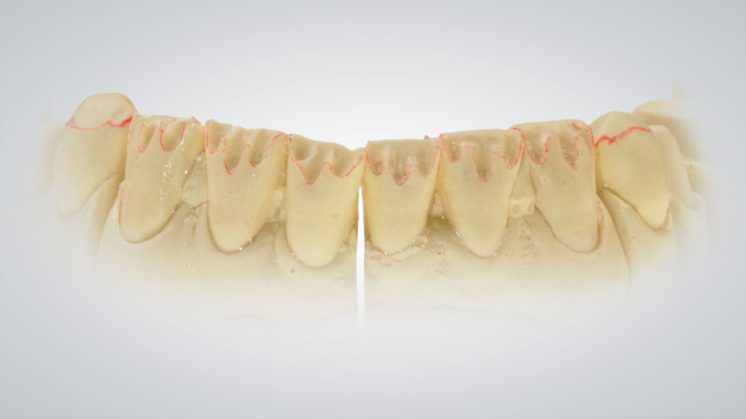 Der „Pfullinger Wellenschliff“ stellt eine neue Methodik für die Präparation von unteren Frontzähnen bei einem Schneidekantenaufbau dar (Abb. 3). Das Präparationsdesign entspricht einem Wellenschliff, wobei nur vestibulär beschliffen werden muss. Ein großer Vorteil dieses neu gedachten Präparationsdesigns ist, dass trotz geringer Invasivität stabile glaskeramische Restaurationen erarbeitet werden können. Zudem liegen die Präparationsränder komplett im Schmelzbereich und entfernt von der Gingiva. Die eindeutige Positionierbarkeit bei der Herstellung sowie während der adhäsiven Befestigung ist ein weiteres Argument für den Wellenschliff. Gegenüber Non-Präp-Veneers zum Aufbau einer funktionellen Fläche muss beim Wellenschliff etwas Zahnsubstanz beschliffen werden. Dafür jedoch ist das Handling für Zahnarzt und Zahntechniker einfacher. Außerdem ist der Übergang zwischen Zahn und Keramik dank des Wellenschliffs optisch kaum wahrzunehmen.