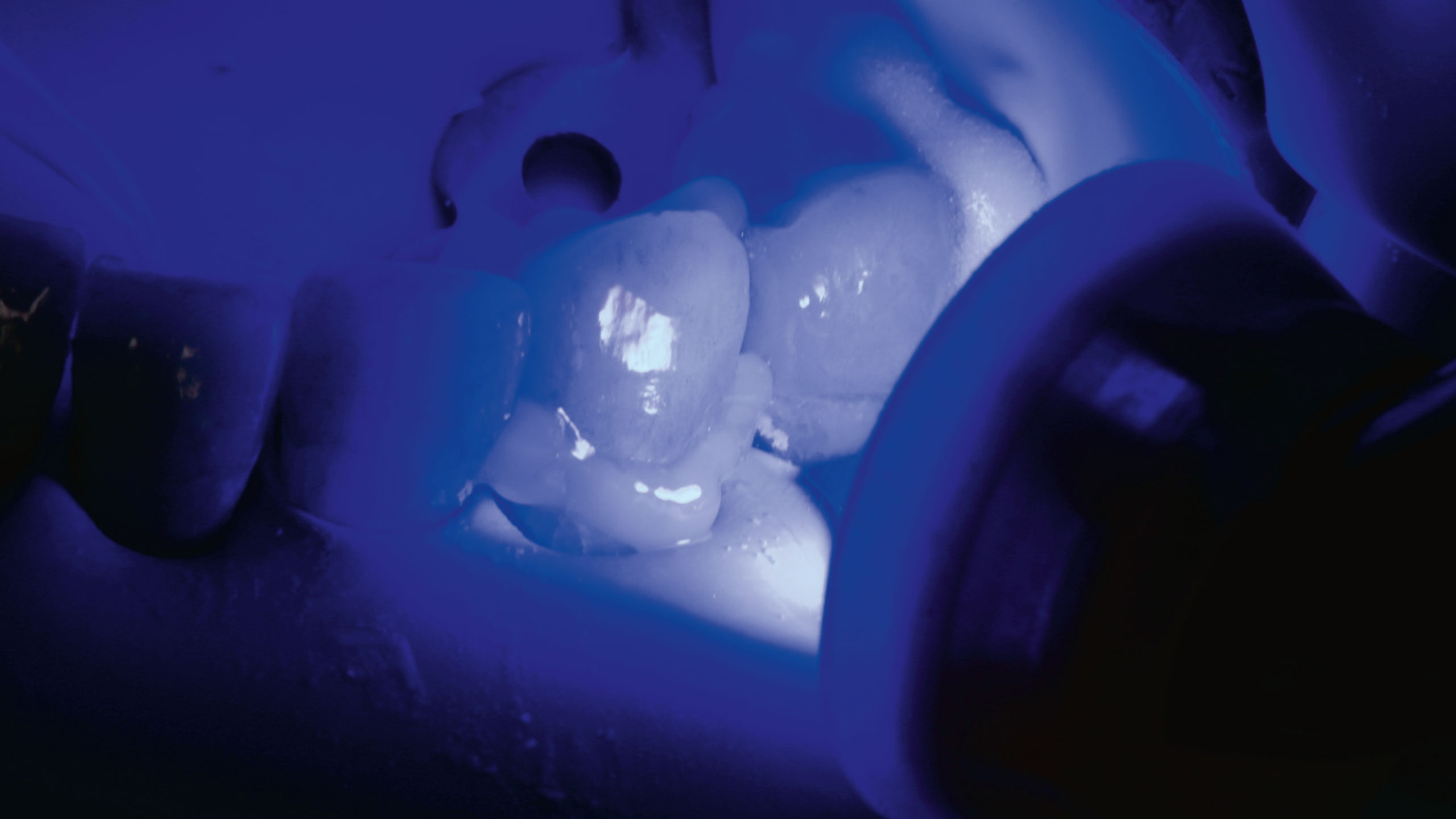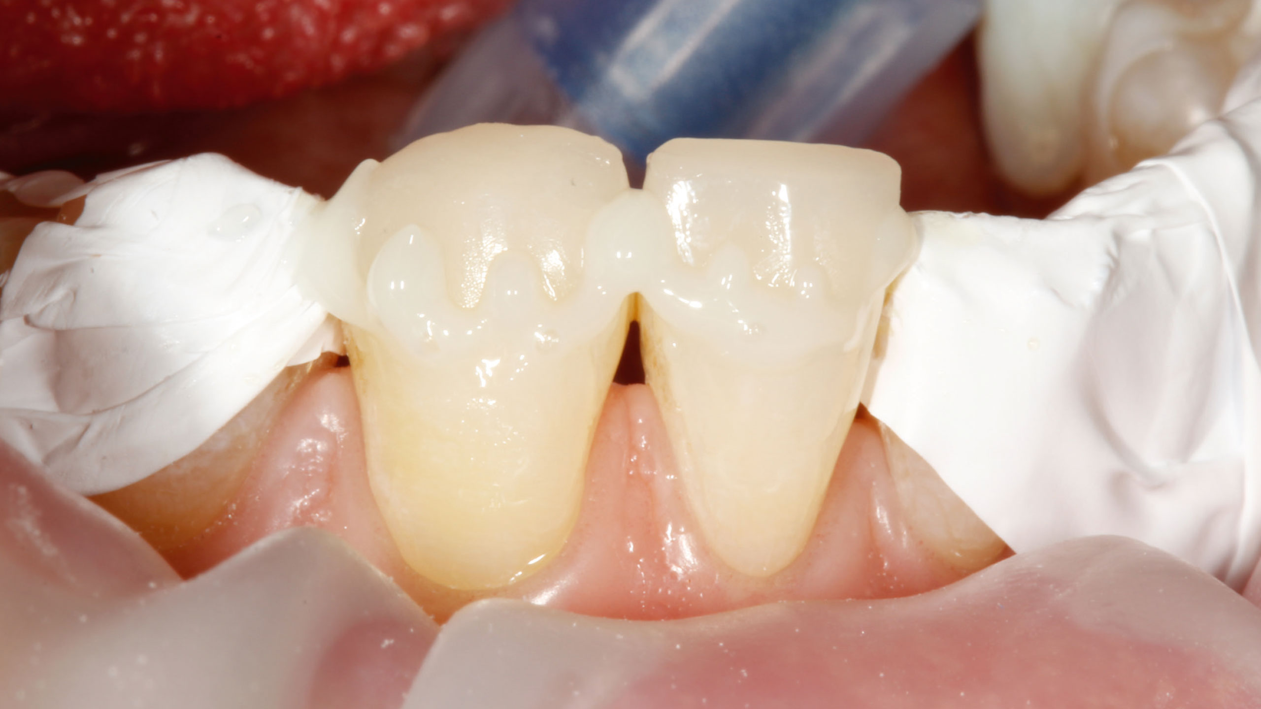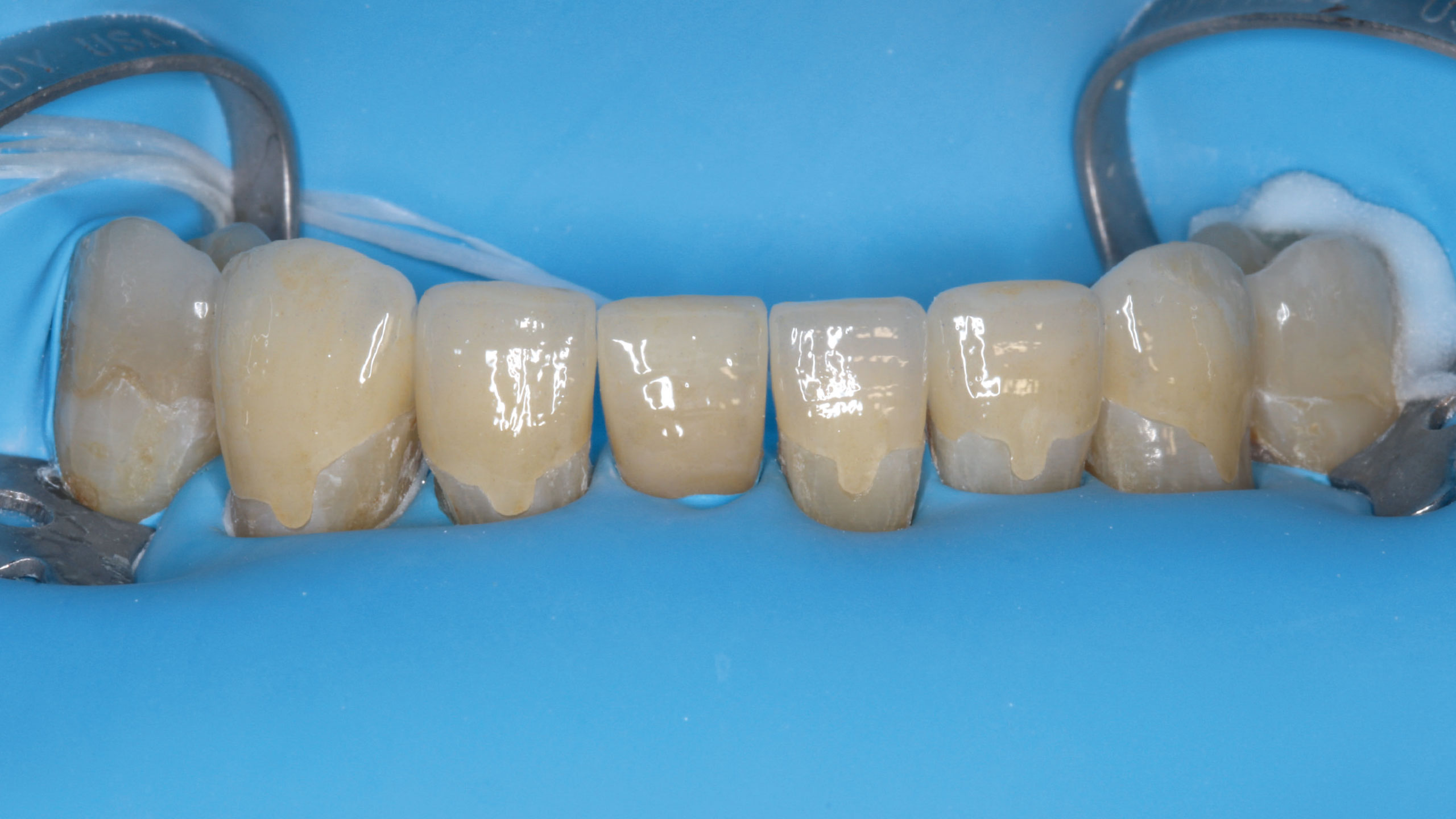 Im Labor konnten die vollkeramischen Restaurationen in der Presstechnik hergestellt werden (Abb. 8 bis 11). Die exakte Bisshöhe wurde zuvor im Mund evaluiert. Herstellung und Eingliederung der Veneers gestalteten sich dank des Wellenschliffs deutlich einfacher als mit anderen Veneer-Präparationsarten, da die Restaurationen am Zahn eine definierte Position hatten. Die adhäsive Eingliederung folgte den bekannten Abläufen. Die keramischen Restaurationen wurden geätzt beziehungsweise für das Verkleben konditioniert (Abb. 12). Nach dem Reinigen der Zähne wurden die Oberflächen mit Phosphorsäuregel vorbereitet, abgespült und getrocknet, mit Primer vorbehandelt, und es wurde Haftvermittler beziehungsweise Bonder aufgetragen (Abb. 13 bis 17). Nach dem Applizieren des Befestigungsmaterials konnten die Restaurationen eingegliedert und Materialüberschüsse entfernt werden (Abb. 18 und 19). Nach der Lichthärtung wurden die Ränder geglättet und die approximalen Kontakte angepasst sowie final poliert (Abb. 20 bis 24). Dabei zeigte sich ein weiterer Vorteil des Pfullinger Wellenschliffs. Der Übergang zwischen Zahn und Keramik ist dank des „diffusen“, bewusst unregelmäßig angelegten Präparationsdesigns optisch kaum wahrzunehmen. Eine Kontrolle der funktionellen Gegebenheiten bildete den Abschluss der prothetischen Therapie. Die in der Initialphase stabilisierte neue vertikale Bisshöhe konnte 1:1 mit den keramischen Restaurationen übernommen werden (Abb. 25).