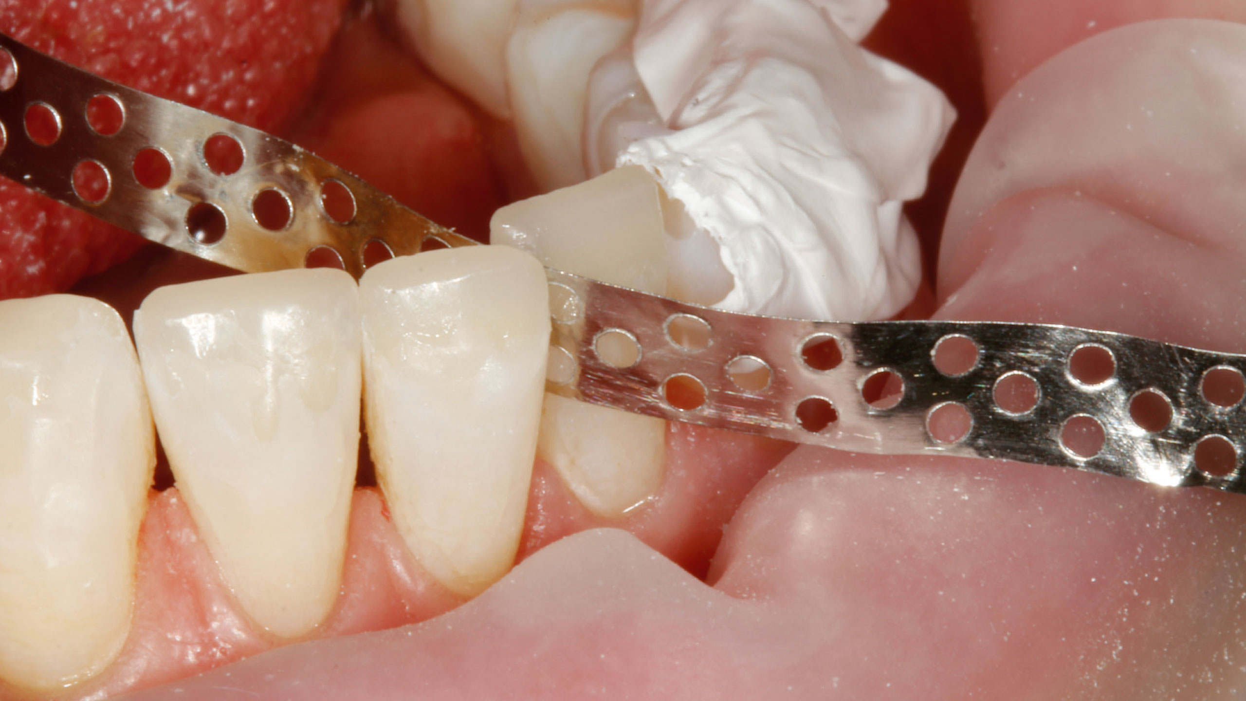 Gesamtrestauration, Minimalinvasiv, Okklusionsausgleich, Präparation, Repositionsveneers, Unterkiefer-Frontzähne, VDO, Veneer, Vollkeramik