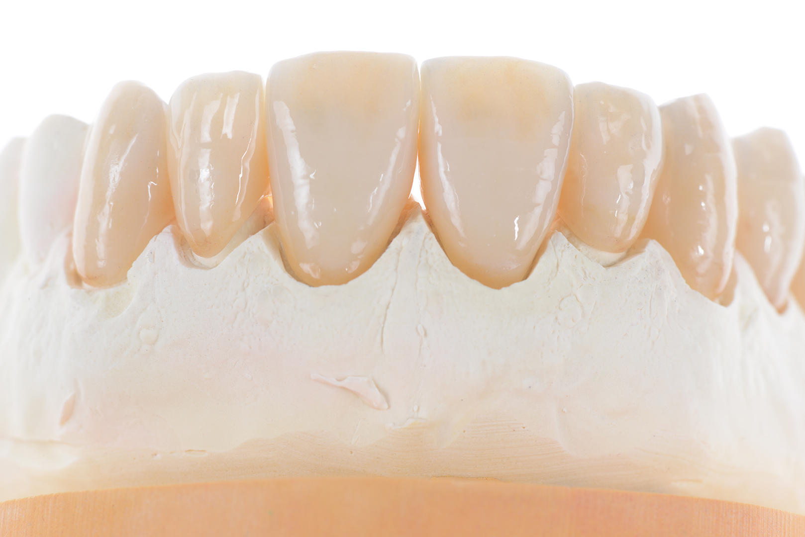 Abbildung 23 bis 28: Impressionen der fertigen zirkonoxidbasierten Restaurationen. Einzelkronen auf den Zähnen 23 bis 12 und eine Brücke von 13 auf 17. Von palatinal zeigt sich auch schön, welche Effekte sich mit den MiYO-Massen erzielen lassen. Die Schmelzleisten und Wülste der palatinal vollanatomisch belassenen Restaurationen wurden etwas mit Value Enhancer („Trans Lumin“ und „Trans Lumin plus“) exponiert. Die Aufnahmen vor dem weißen Hintergrund verdeutlichen auch sehr gut den Effekt, der durch den Einsatz von „Trans Lotus“ im Inzisalbereich erzeugt werden konnte. Die Restaurationen strahlen dadurch eine Wärme aus, die den Kronen Leben „einhaucht“.