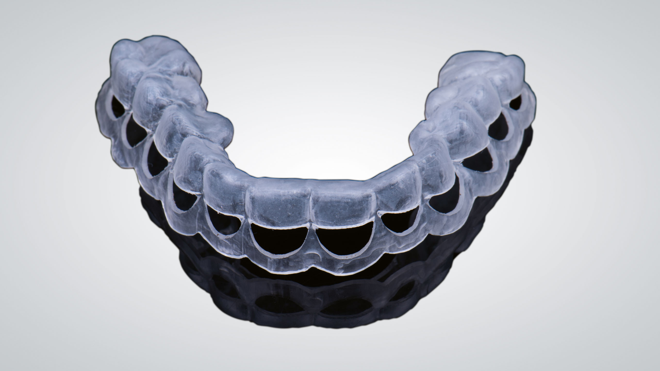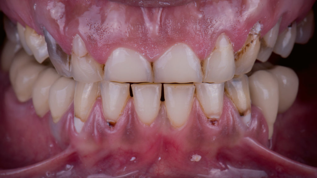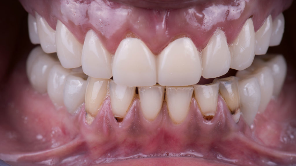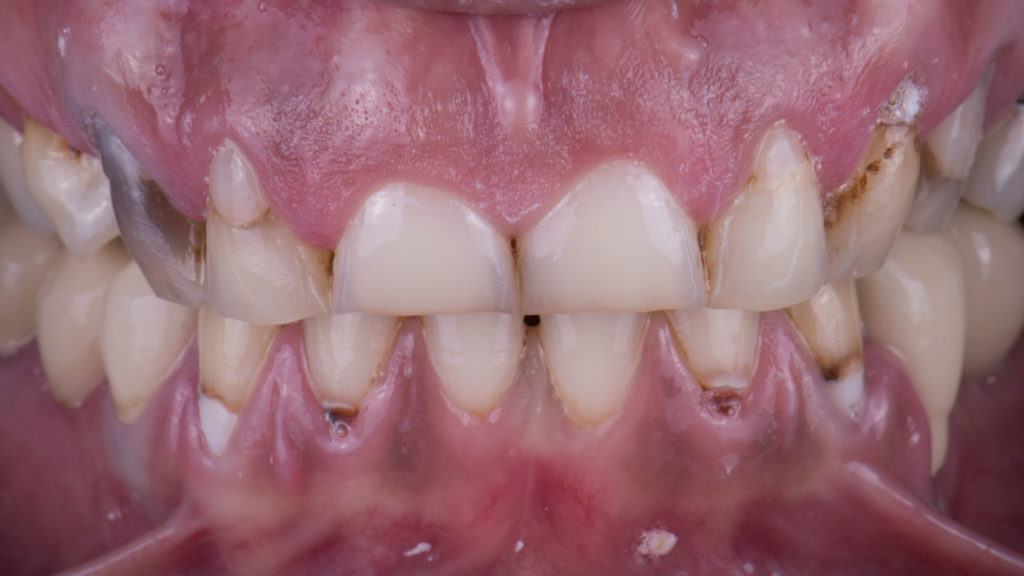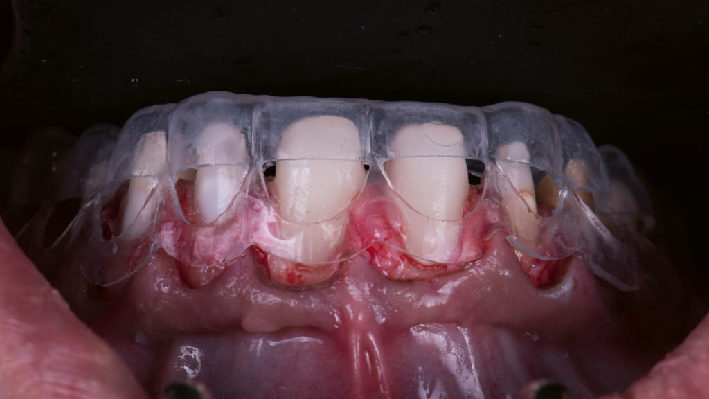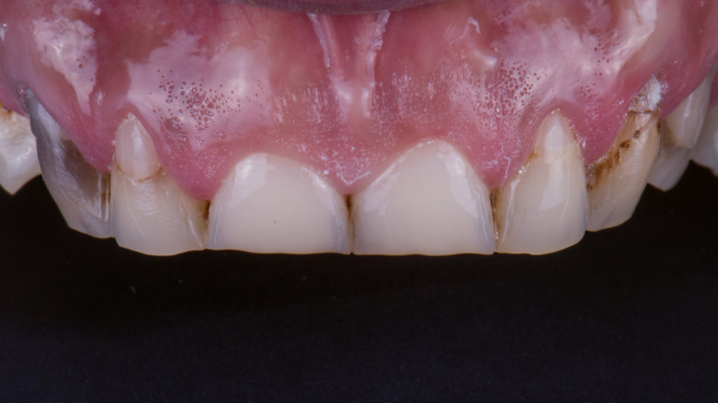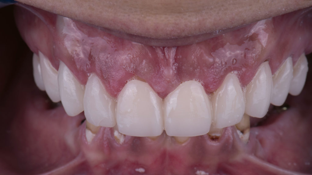 Die Patientin trägt übrigens zum Schutz der vollkeramischen Versorgungen nachts eine Schiene.