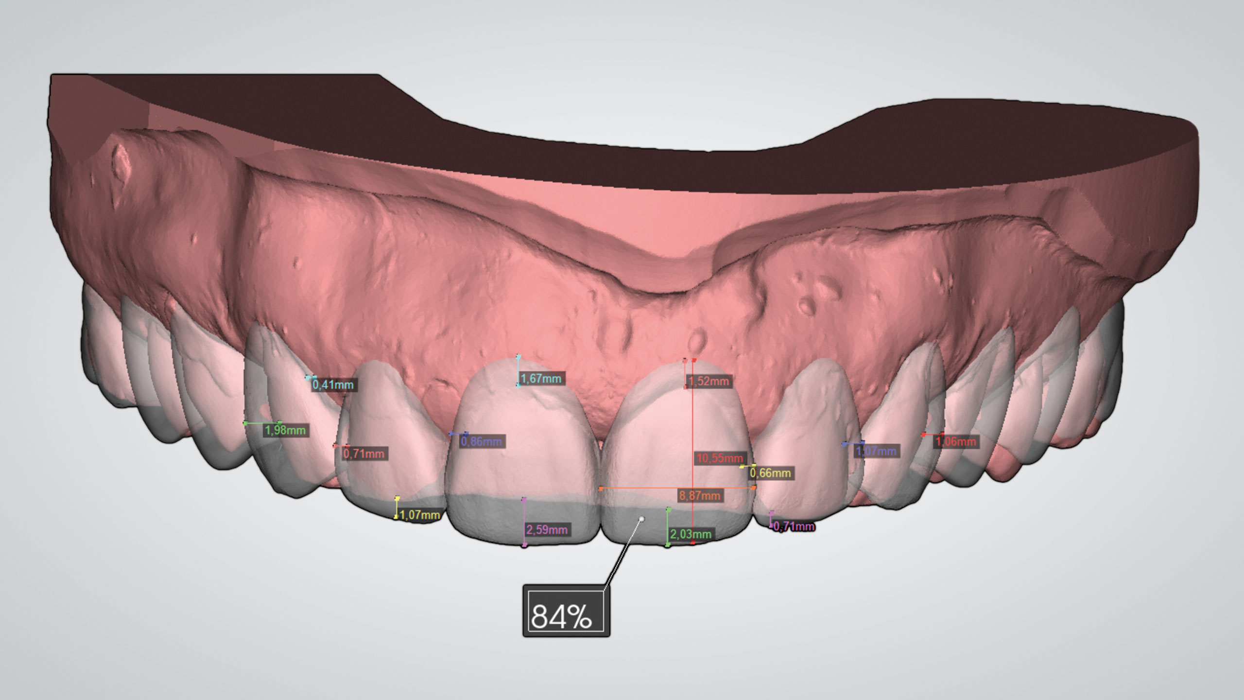 Aus Abbildung 13, dem Screenshot der fertigen, extern durchgeführten DSD-Planung, wird ersichtlich, dass gemäß DSD zur Realisierung der Planung auch eine klinische Kronenverlängerung notwendig werden würde. Zudem wird ersichtlich, dass zum Beispiel für die inzisale Verlängerung des Zahns 11, 2,59 mm veranschlagt hätte werden müssen. Doch Vorsicht: Wir haben es bei DSD mit einer rein ästhetischen Planung zu tun! Wie sich später herausstellen sollte, mussten wir die von DSD angegebene Frontzahnlänge negieren und kürzere Zähne gestalten. Das zeigt eindeutig, dass wir uns also nie voll und ganz auf eine derartige Planung verlassen können. Sie gibt uns lediglich eine ungefähre Vorstellung dessen, was möglich ist. Letztendlich gewinnt man die wichtigsten Erkenntnisse über das Provisorium, und zwar im Mund des Patienten. Denn der Mensch ist kein statisches System.