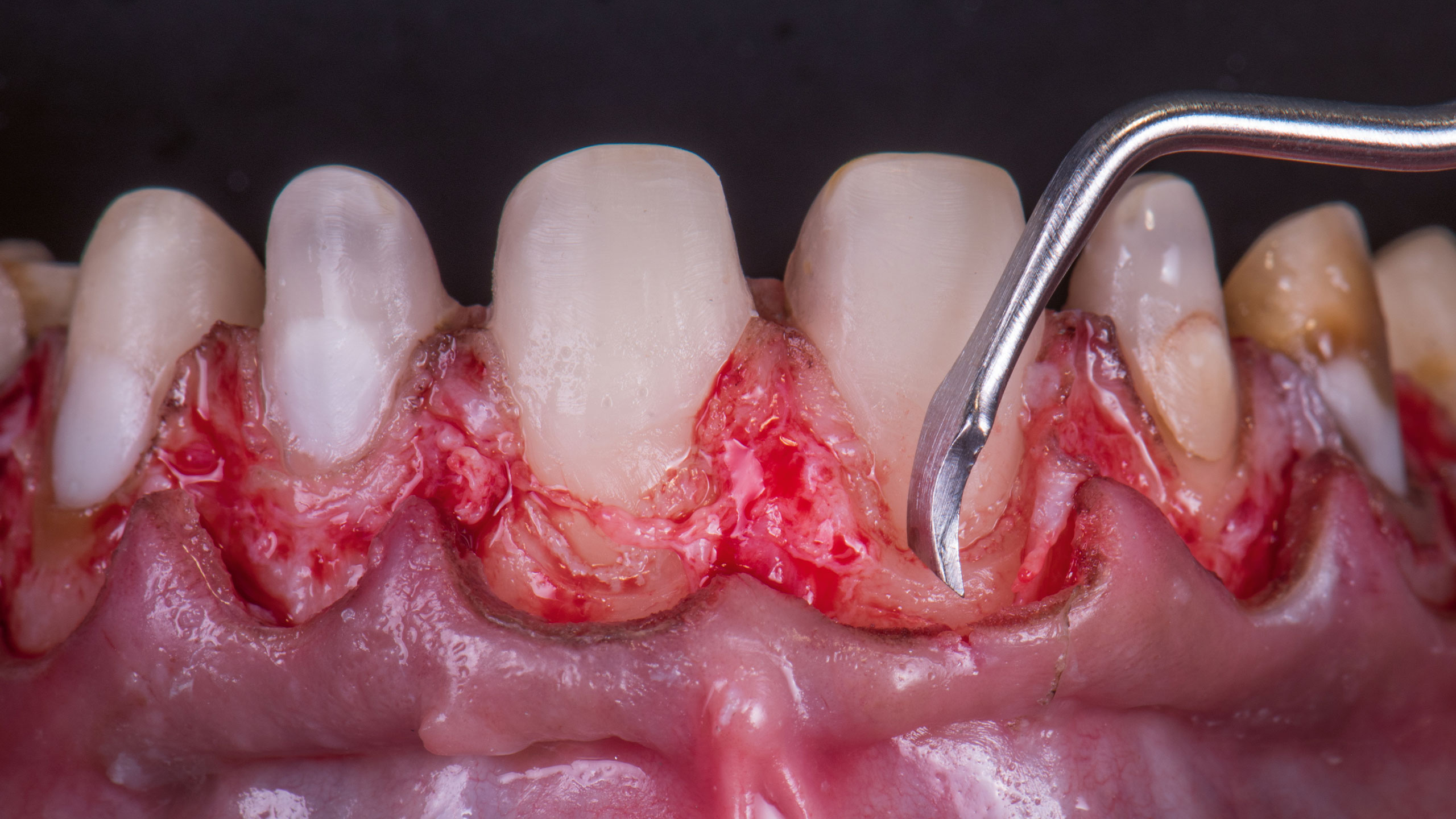 Die Kronenverlängerung wurde unter Zuhilfenahme der besagten DSD-Schablone vorgenommen (Abb. 17). Mit zurückgeklapptem Gewebe hat man freie Sicht auf die biologischen Strukturen und man erhält Informationen über die biologische Breite (Abb. 18). Die biologische Breite bezeichnet den Abstand zwischen dem krestalen Rand des Alveolarknochens und dem koronalen Ende des Saumepithels der Gingiva. Die Kronenverlängerung war nötig, um krestal den Raum zu schaffen, der für ein harmonisches Längen-Breiten-Verhältnis der späteren Kronen nötig sein würde. Die Ausdehnung der Kronenverlängerung basiert auf den aus dem DSD gewonnen Erkenntnissen und Distanzen (vgl. Abb. 15). Hätten wir die Kronen nur rein prothetisch verlängert, wäre die Inzisalkanten zu lang geworden und der ermittelte Stomionpunkt hätte überschritten werden müssen.