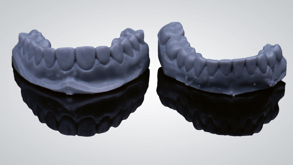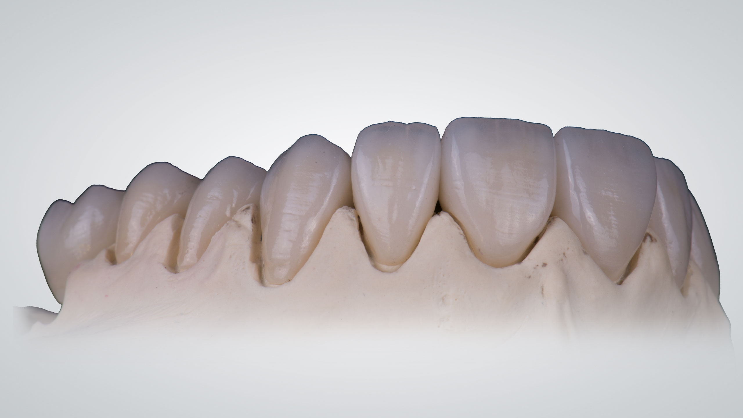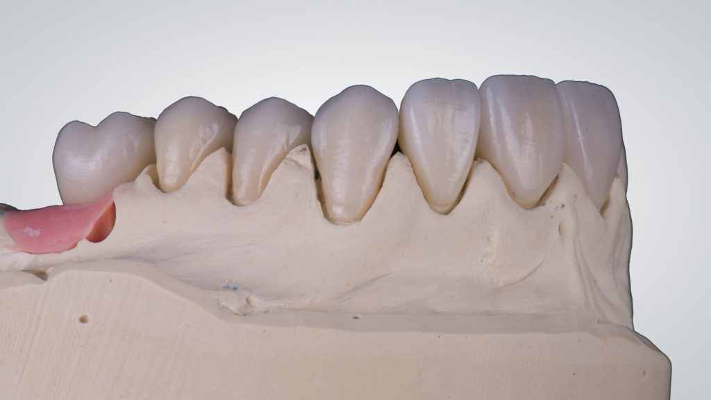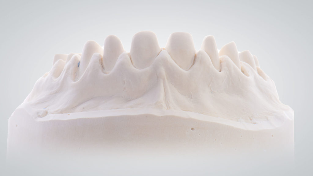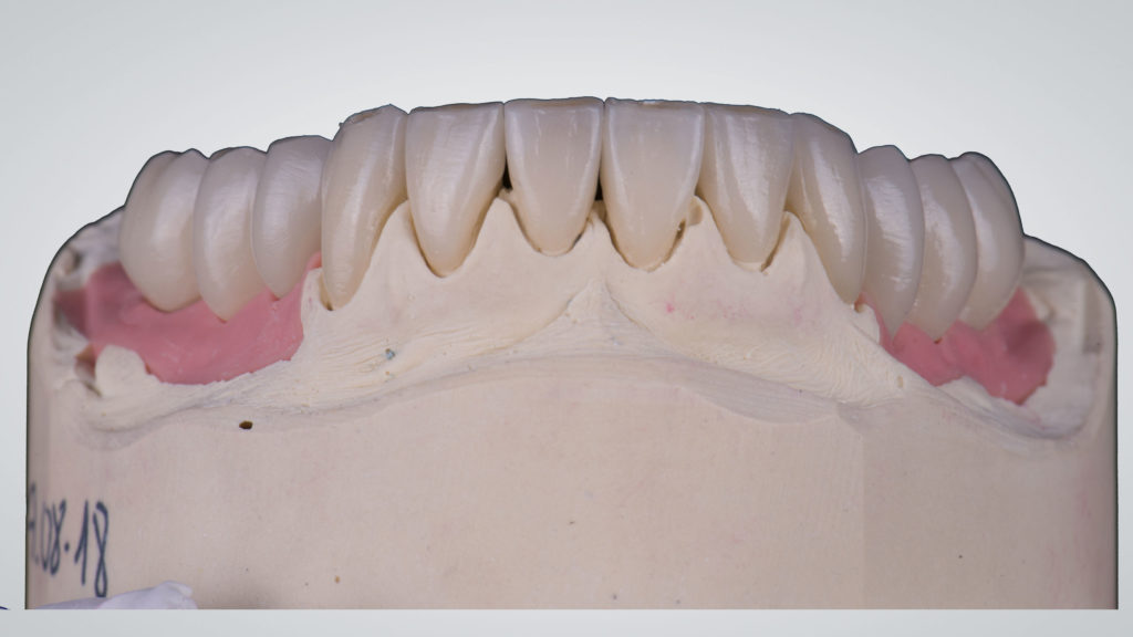 Die Versorgungen wurden zum Großteil auf den ungesägten Meistermodellen angefertigt, da diese die so wichtigen Informationen über das Zahnfleisch beinhalten. Zur Anfertigung der Einzelkronen werden zusätzlich Einzelstümpfe der zu versorgenden Zähne angefertigt und daran die Präparationsgrenzen sauber dargestellt. Diese werden zum Teil digitalisiert und mithilfe der digitalen aber auch physischen Stümpfe die Einzelkronen CAD/CAM-gestützt designt sowie händisch modelliert, dann aus Zirkonoxid gefräst (für die Zähne 13 bis 16 und 23 bis 26) sowie presskeramisch aus Lithiumdisilikat (von 12 auf 22 in Form von modifizierten Veneers) umgesetzt.