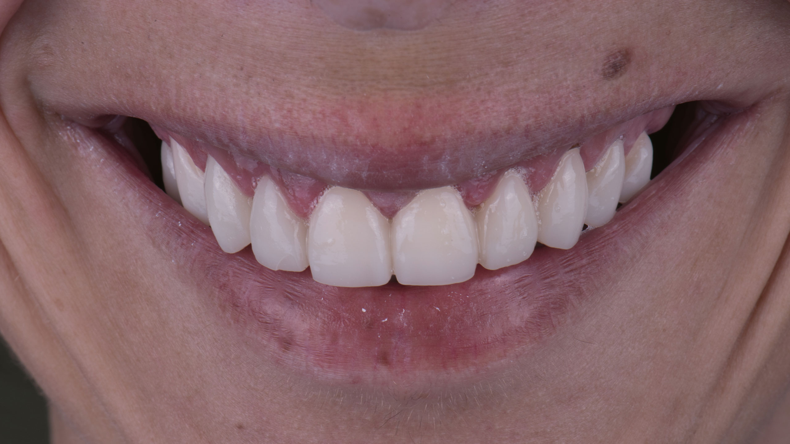 Beim Einsetztermin wurden die 20 vollkeramischen Teile eingegliedert und ein Portraitbild angefertigt (Abb. 30). Da die Gewebe noch abheilen mussten und sich die Gingiva hier und da noch anlegen sollte, wurde bewusst darauf verzichtet, zu diesem Zeitpunkt Intraoralaufnahmen anzufertigen. Etwa vierzehn Tage später fertigten wir im Rahmen eines Kontrolltermins erneut ein Portraitbild an (Abb. 31). Für die Patienten sind solche Aufnahmen wichtig, da sie in Erinnerung rufen, welche Verwandlung sie durchlaufen haben. Wir drucken diese Bilder auf Wunsch der Patienten auch aus und geben sie ihnen mit.
