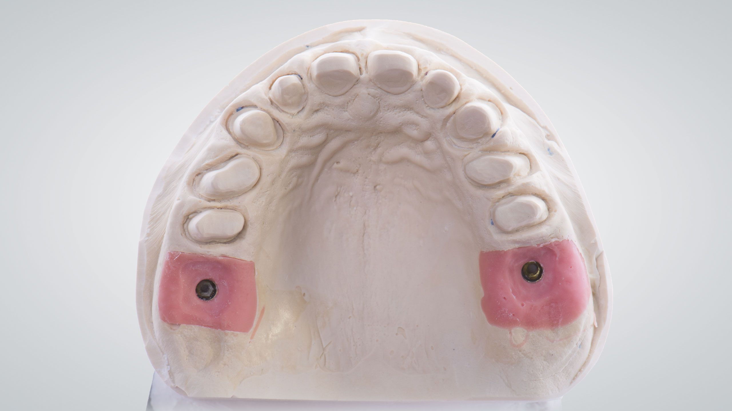 Nach etwa viermonatiger Tragezeit wurde das LZP vom Behandler abgenommen, die Situation nachpräpariert und abgeformt. In den Abbildungen 23 und 24 ist das ungesägte Oberkiefermeistermodell dargestellt, das mithilfe der Abformung angefertigt worden war. Aus diesem Meistermodell wird auch der Umfang der Versorgung ersichtlich. So sollten im OK zehn Einzelzahnkronen – davon zwei Implantatkronen in Regio 16 und 26 – angefertigt werden.