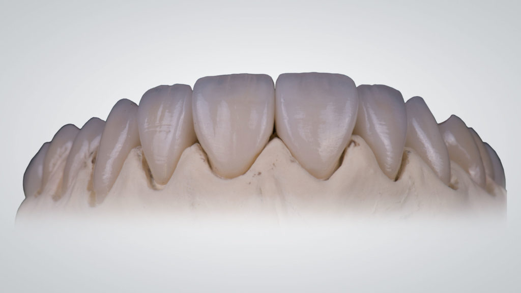 Die teilanatomischen Zirkonoxidseitenzahn- und eckzahnkronen wurden mit einer entsprechenden Verblendkeramik individualisiert, die gepressten Frontzahnkronen labial minimal im Sinne eines Cut-back reduziert und mit einer Minimalschichtung komplettiert. Die fertigen Oberkiefer-Vollkeramikkronen sind in den Abbildungen 25 und 26 dargestellt.