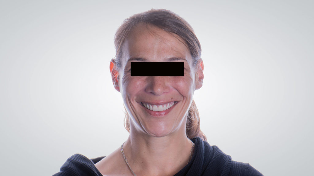 Da die Patientin beim Sprechen eine hohe Dynamik im Unterkiefer entwickelte, war definitiv nicht viel Platz vorhanden, um die Inzisalkanten übermäßig nach inzisal zu verlängern. Hätte man dies missachtet, hätte sie sich ihre Frontzahnversorgungen mit Sicherheit wieder zerstört. Ihr Wunsch war es zudem auch, dass man die hohe Lachlinie, das viele Zahnfleisch, mit dem sie zum Beispiel ihr Vater aufzog, etwas reduziert.