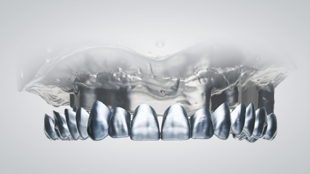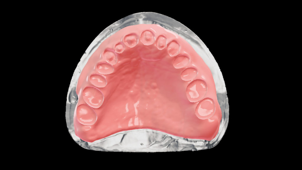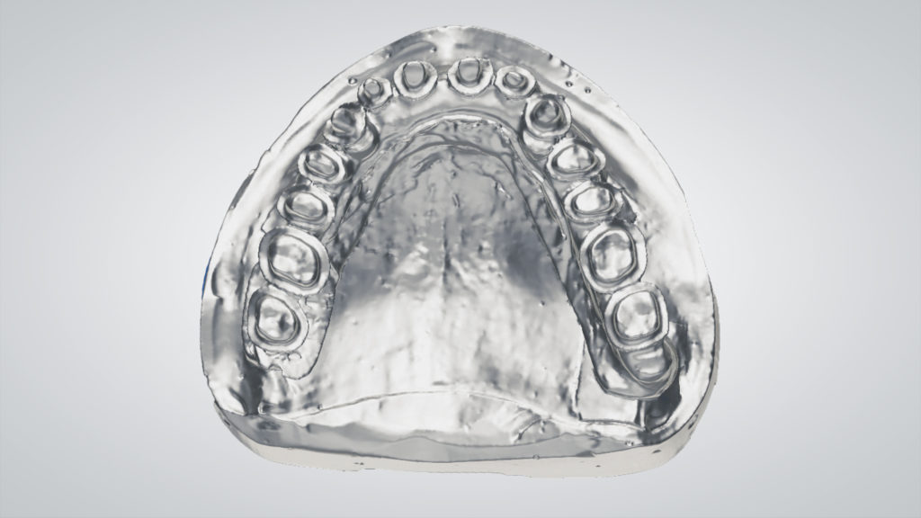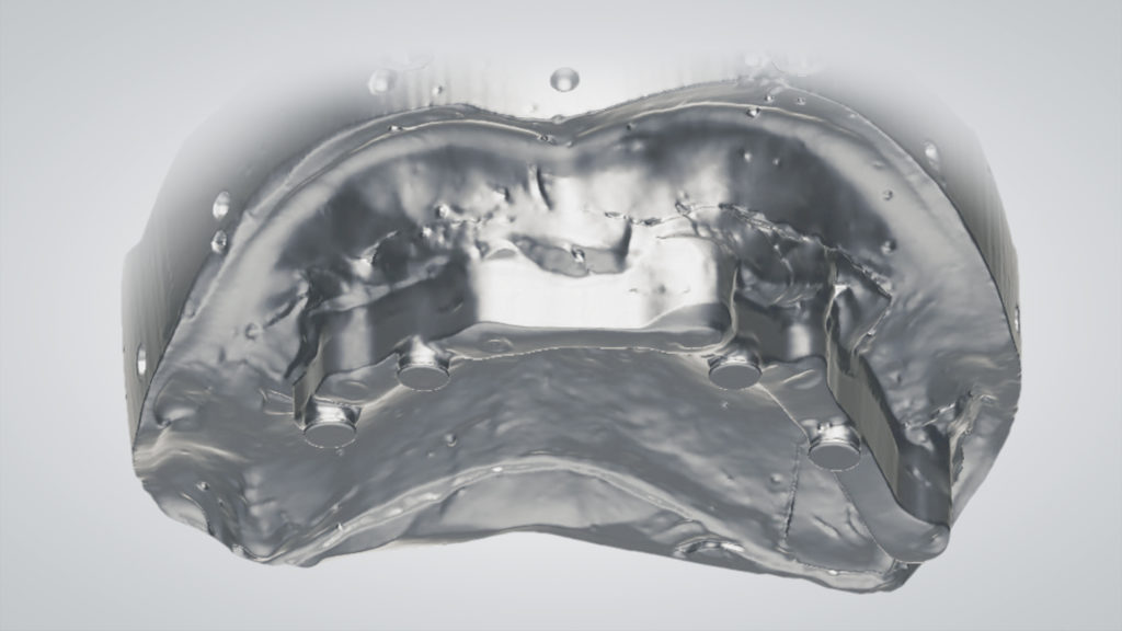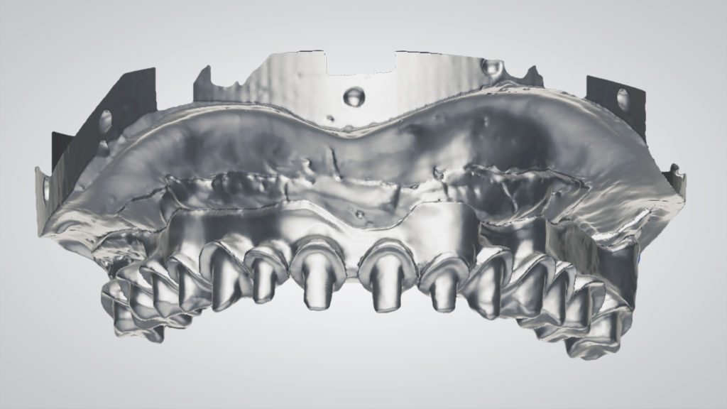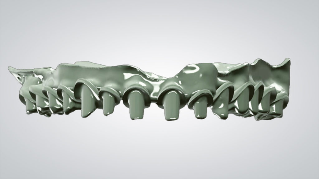 Es wurde eine digitale „Abformung“ inklusive eingesetzter Scankörper mit dem Desktopscanner 7Series (dental wings) erzeugt. Der virtuelle Zahnaufbau wurde mit dem dental wings Implant Prosthetics ­Module Model Builder durchgeführt, wobei die Zahnformen an die ästhetisch-funktionellen Bedürfnisse des Patienten angepasst wurden (Abb. 1 bis 4).