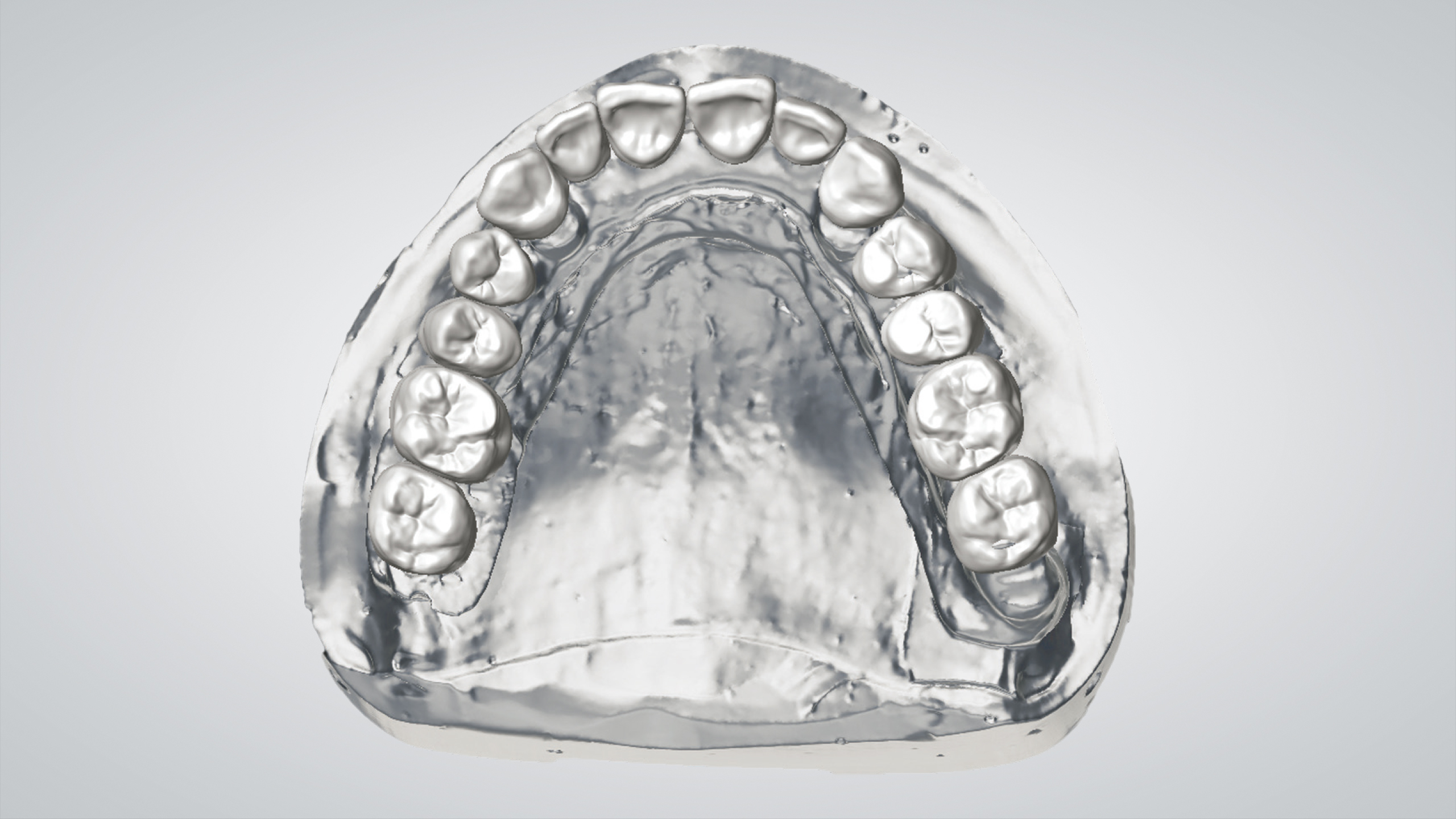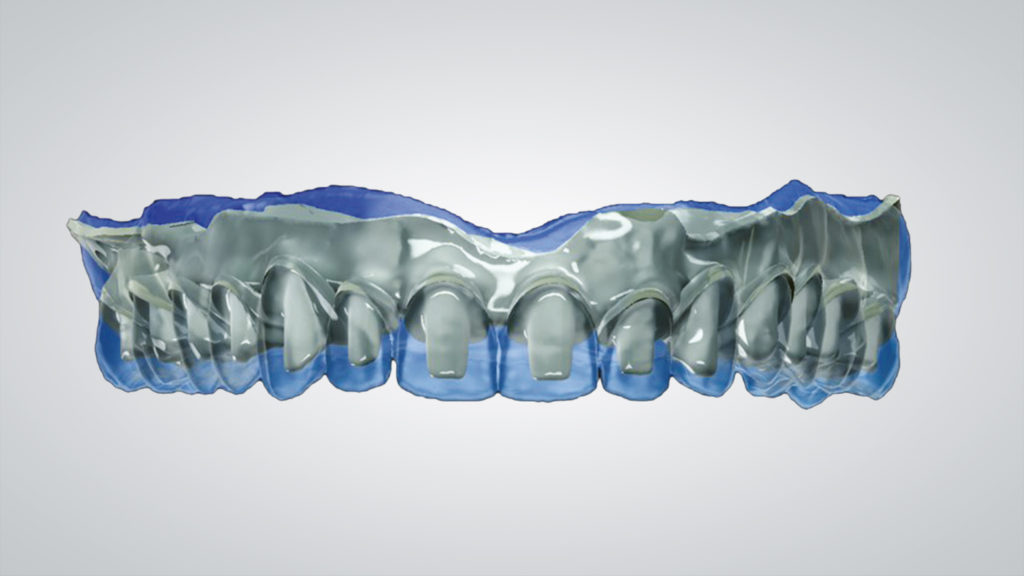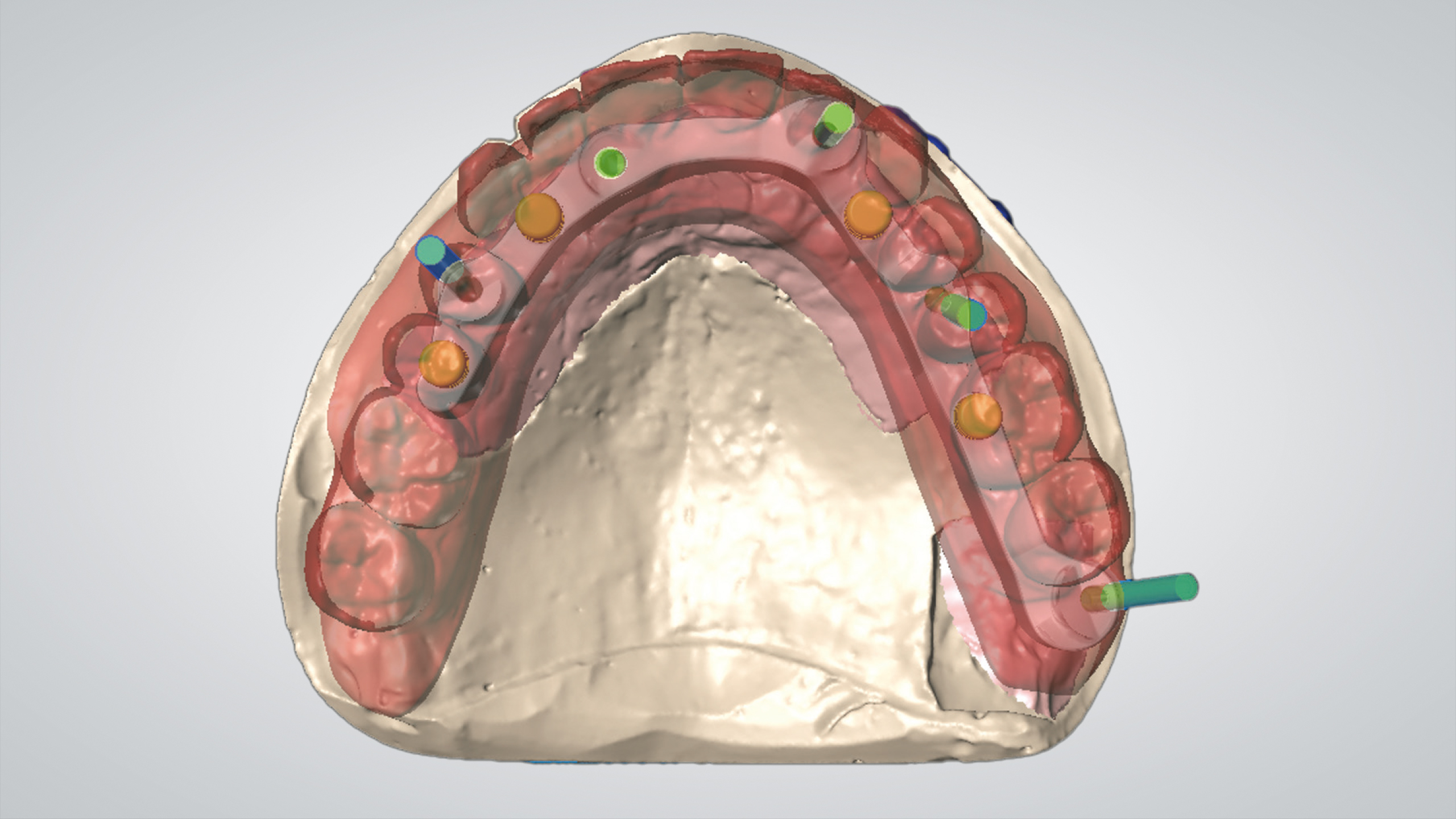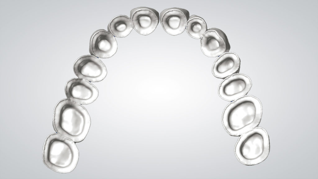 Es wurde eine digitale „Abformung“ inklusive eingesetzter Scankörper mit dem Desktopscanner 7Series (dental wings) erzeugt. Der virtuelle Zahnaufbau wurde mit dem dental wings Implant Prosthetics ­Module Model Builder durchgeführt, wobei die Zahnformen an die ästhetisch-funktionellen Bedürfnisse des Patienten angepasst wurden (Abb. 1 bis 4).