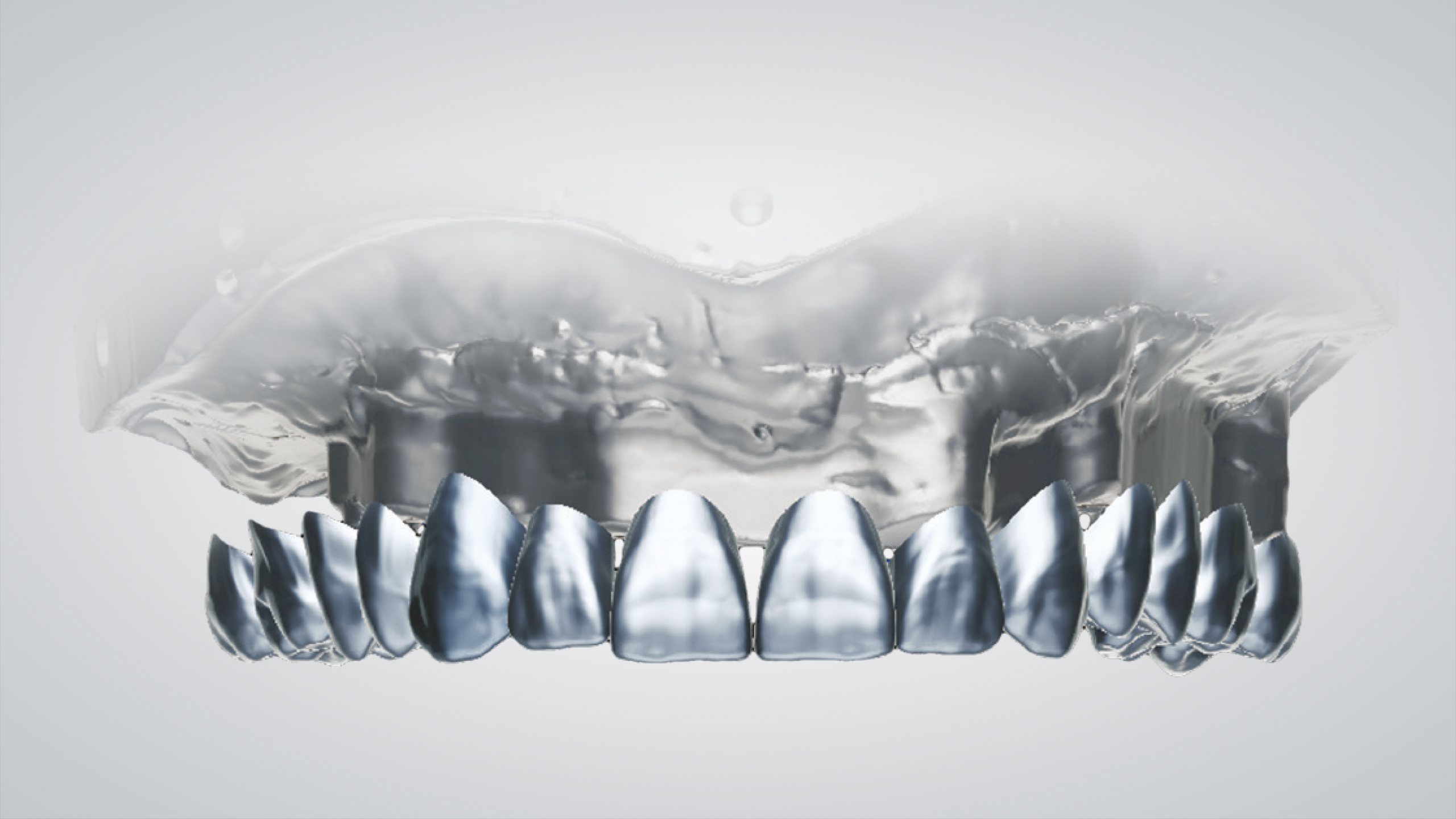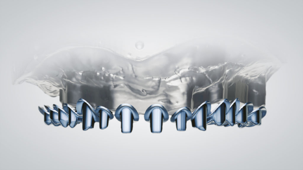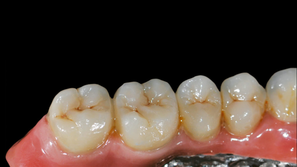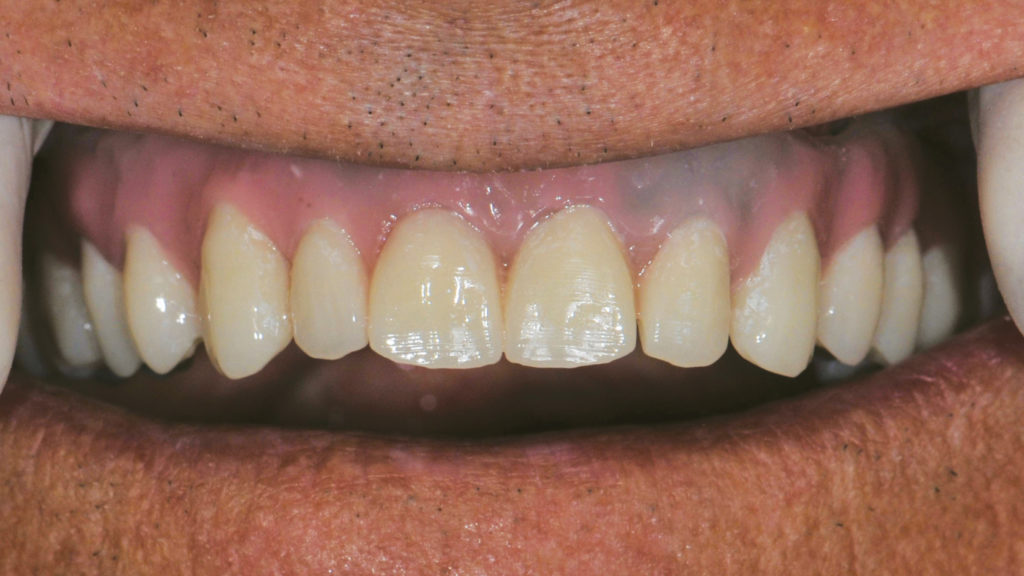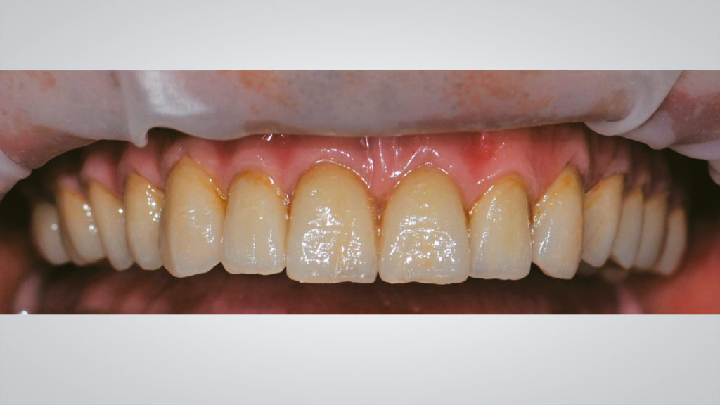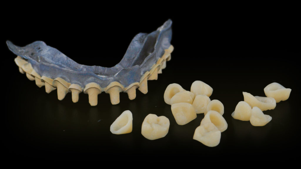 Nach dem Scannen des polierten Stegs mit Hilfe des Renfert-Scanning-Pulversprays wurde ein prothetisches Gerüst per CAD konstruiert und anschließend ebenfalls mit der SLM-Technologie realisiert (Abb. 47 bis 66). Die Entscheidung, das Gerüst mit der SLM-Technologie herzustellen, fiel, da die detaillierte Anatomie mit dem Fräsverfahren nicht abgebildet werden konnte. Die einzelnen Kronen wurden zunächst per CAD konstruiert und dann mit der 5-Achs-Dentalfräsmaschine DWX-52D aus hochtransluzentem Nanohybrid-Komposit Voco Grandio zu Kronen gefräst (Abb. 67 und 68). Bei den Frontzahnkronen wurde eine Komposit-Mikroschichtung (Voco Grandio Flow) vorgenommen, während die Seitenzahnkronen monolithisch blieben und nicht geschichtet wurden. Die Kronen wurden mit Universal Resin Cement (URC) von Bioloren zementiert (Abb. 69 bis 71). Anschließend wurde eine rosa Gingiva- und Gingivarandmodellierung in Komposit durchgeführt (Abb. 72 bis 75). Die Ausarbeitung und Politur der Teile aus Komposit und Metall erfolgte mit mechanischen Verfahren (Abb. 76 bis 81).