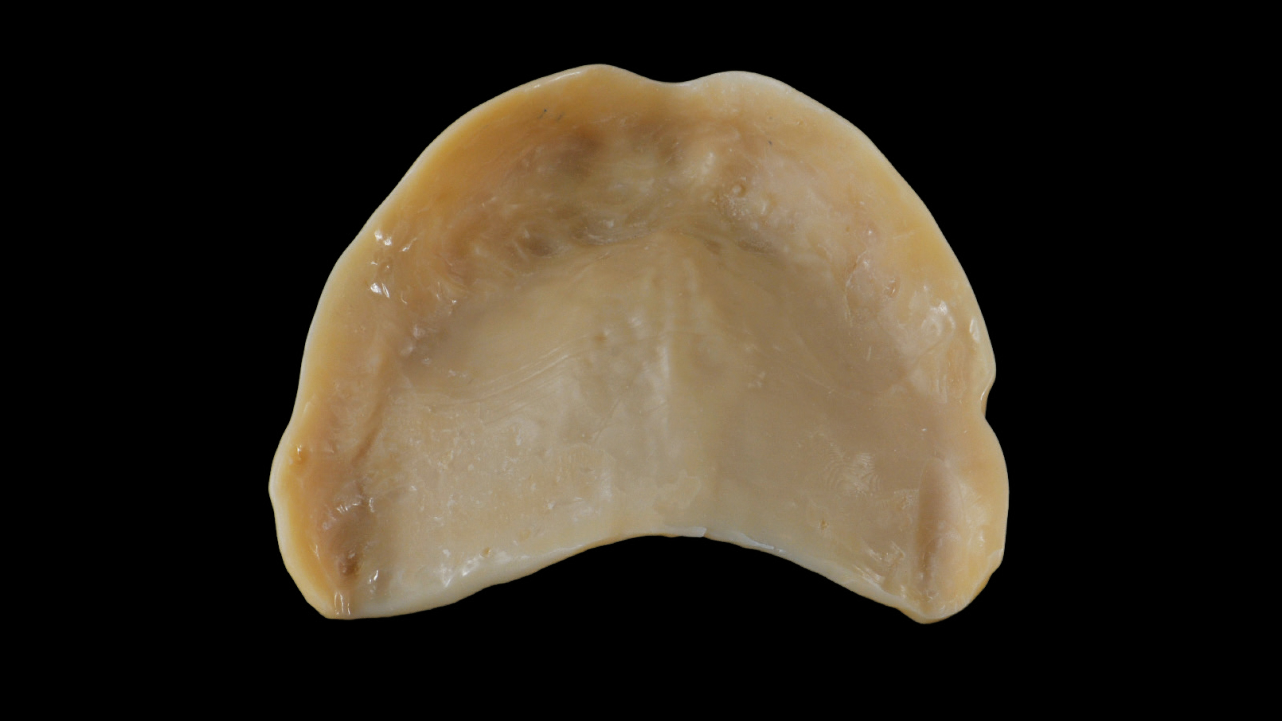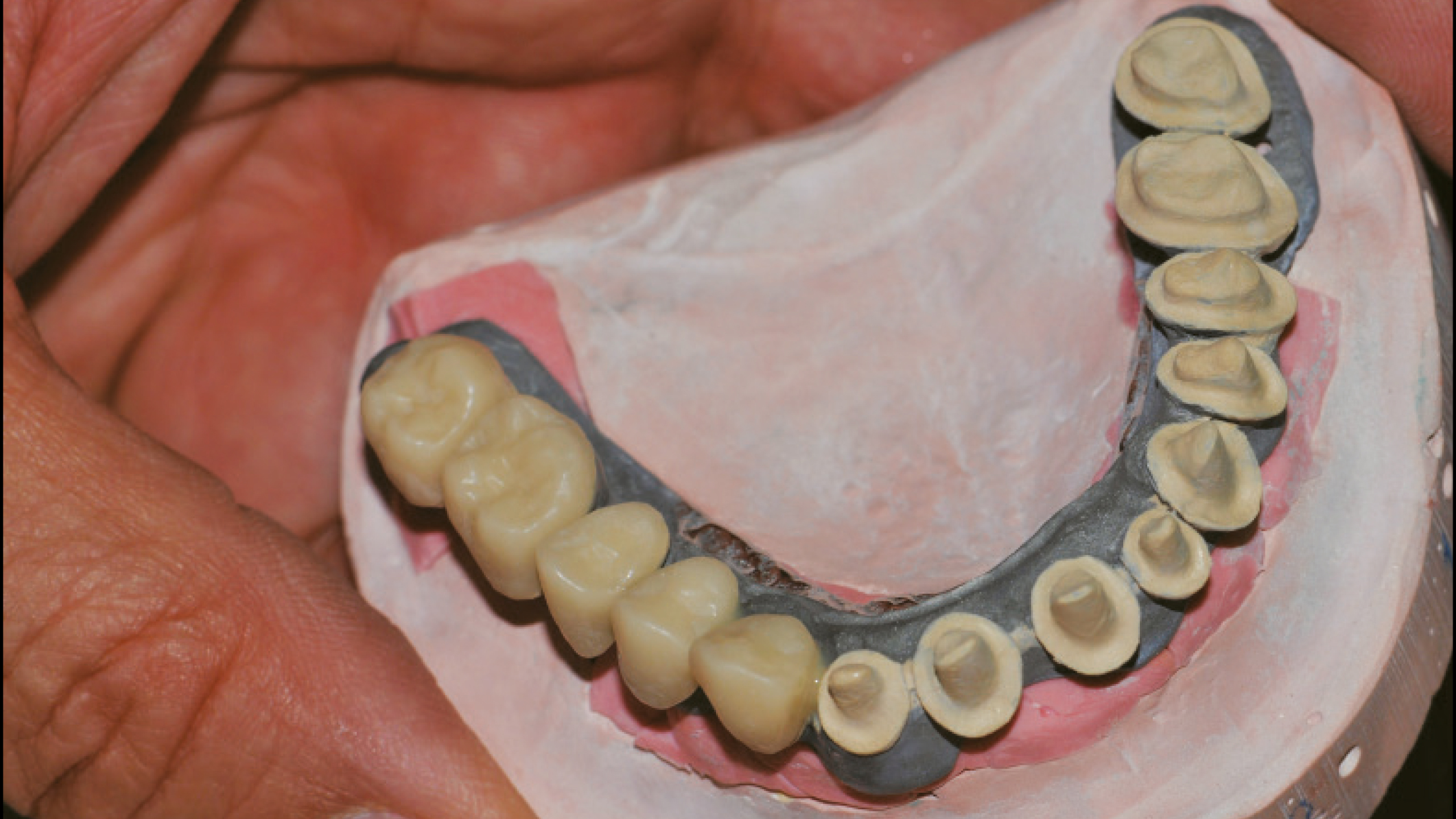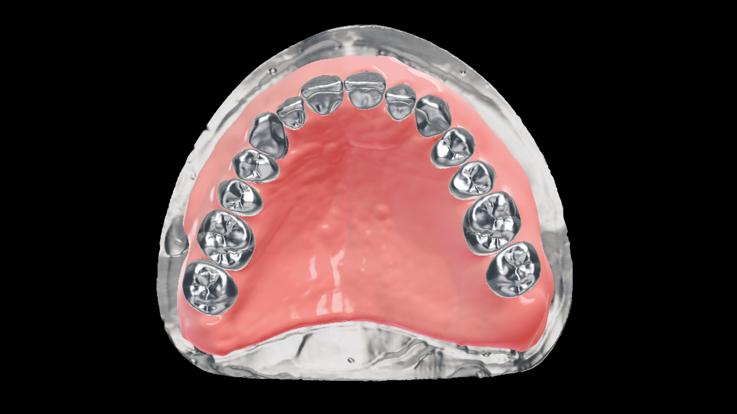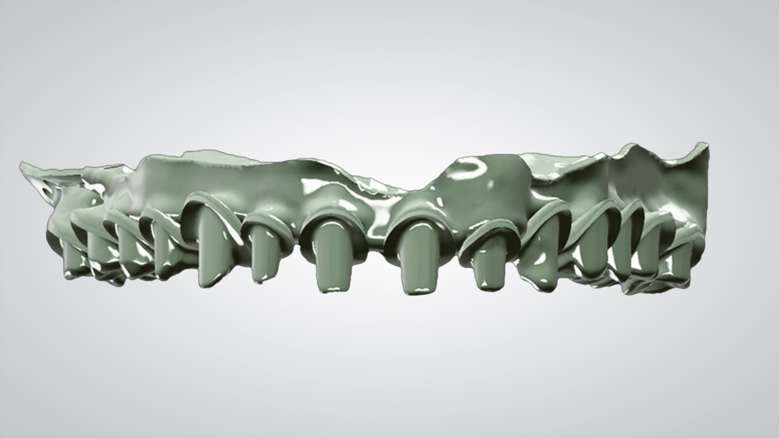 Nach dem Scannen des polierten Stegs mit Hilfe des Renfert-Scanning-Pulversprays wurde ein prothetisches Gerüst per CAD konstruiert und anschließend ebenfalls mit der SLM-Technologie realisiert (Abb. 47 bis 66). Die Entscheidung, das Gerüst mit der SLM-Technologie herzustellen, fiel, da die detaillierte Anatomie mit dem Fräsverfahren nicht abgebildet werden konnte. Die einzelnen Kronen wurden zunächst per CAD konstruiert und dann mit der 5-Achs-Dentalfräsmaschine DWX-52D aus hochtransluzentem Nanohybrid-Komposit Voco Grandio zu Kronen gefräst (Abb. 67 und 68). Bei den Frontzahnkronen wurde eine Komposit-Mikroschichtung (Voco Grandio Flow) vorgenommen, während die Seitenzahnkronen monolithisch blieben und nicht geschichtet wurden. Die Kronen wurden mit Universal Resin Cement (URC) von Bioloren zementiert (Abb. 69 bis 71). Anschließend wurde eine rosa Gingiva- und Gingivarandmodellierung in Komposit durchgeführt (Abb. 72 bis 75). Die Ausarbeitung und Politur der Teile aus Komposit und Metall erfolgte mit mechanischen Verfahren (Abb. 76 bis 81).