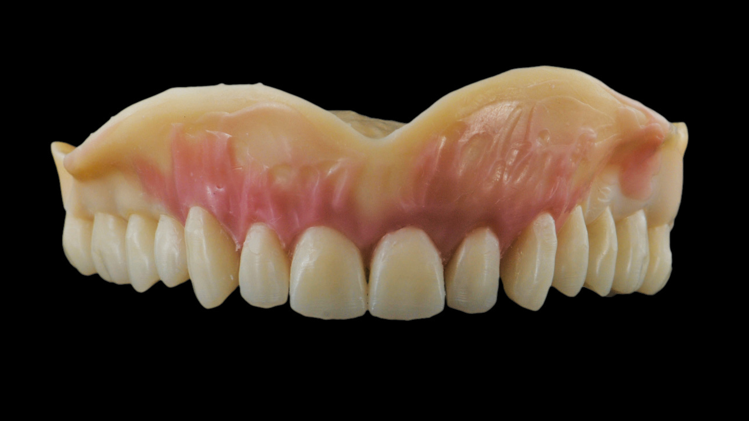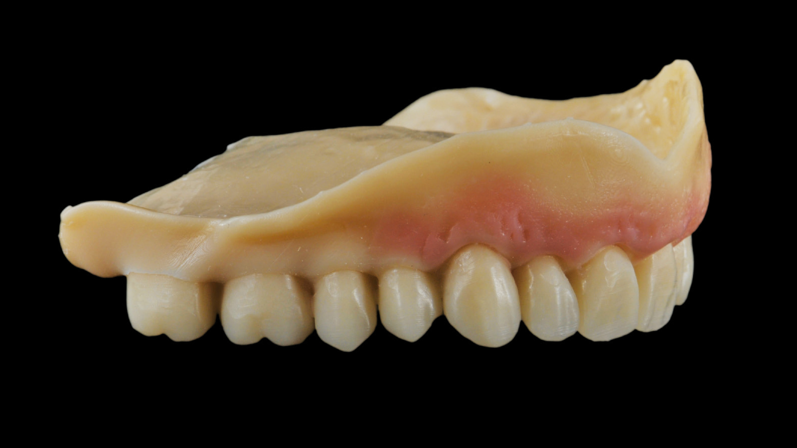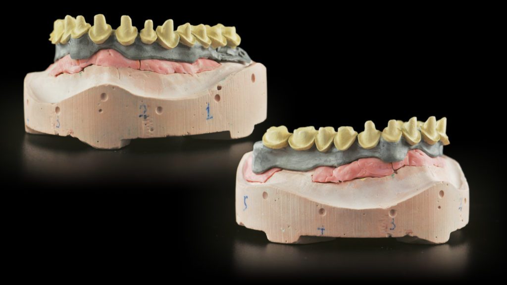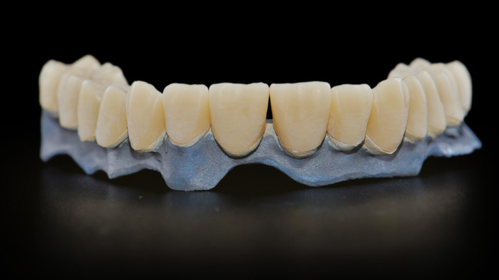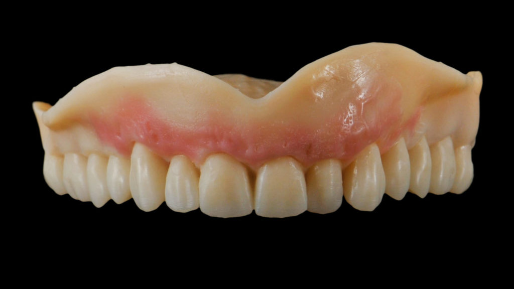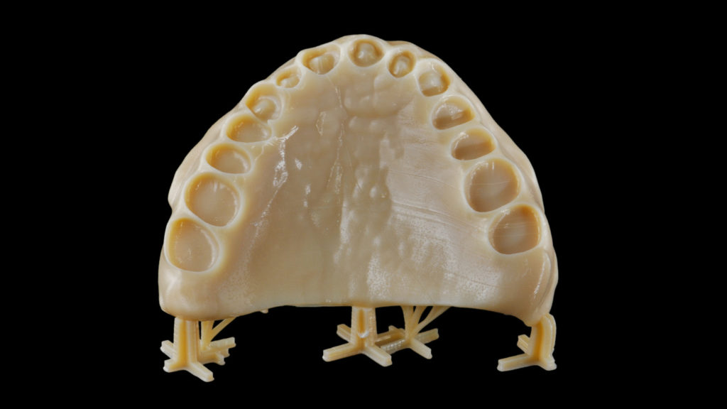 Ein Prototyp des CAD-Entwurfs wurde mit Hilfe der 3D-Drucktechnologie realisiert, sodass Funktionstests und eine ästhetische Einprobe mit dem Patienten durchgeführt werden konnte. Der Patient hatte dabei die Möglichkeit, die Vorzüge des potentiellen neuen Zahnersatzes kennenzulernen (Abb. 5 bis 14).